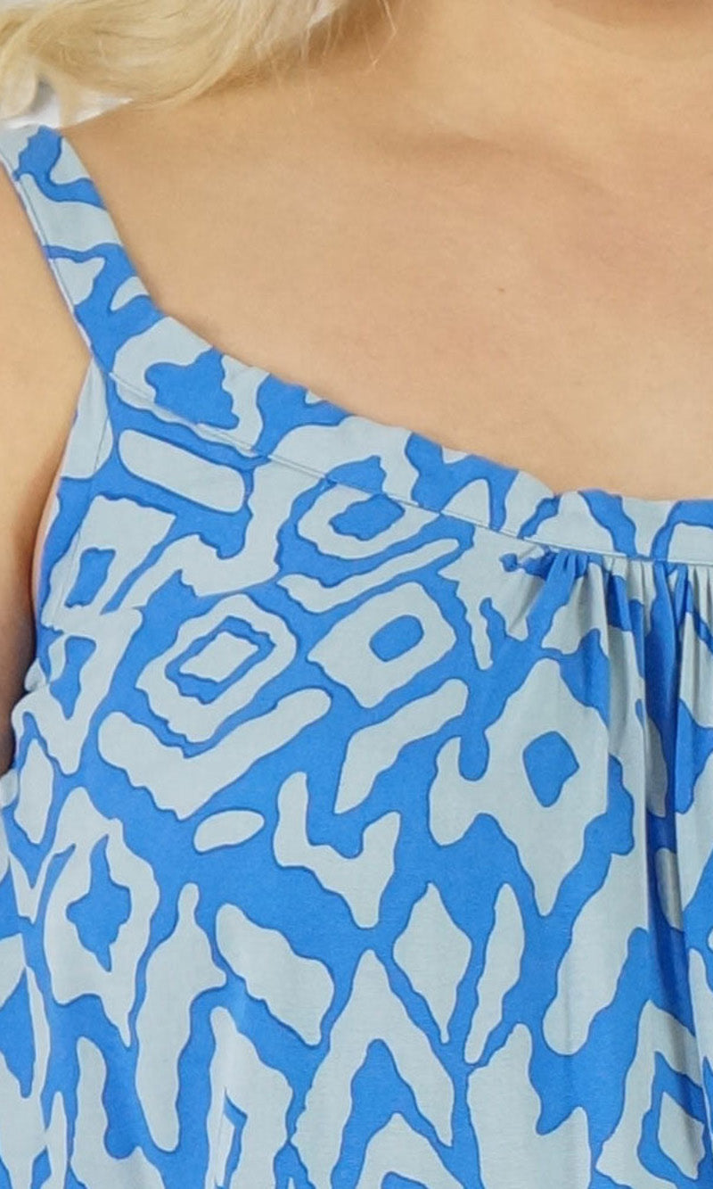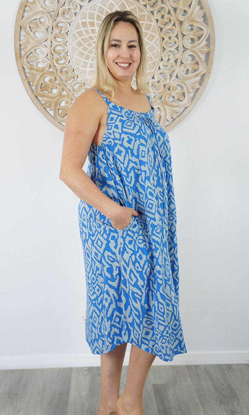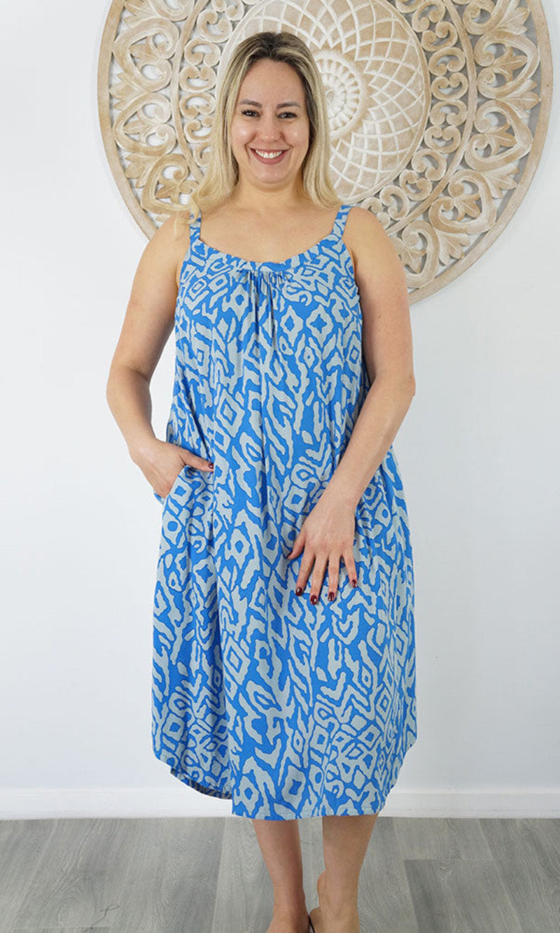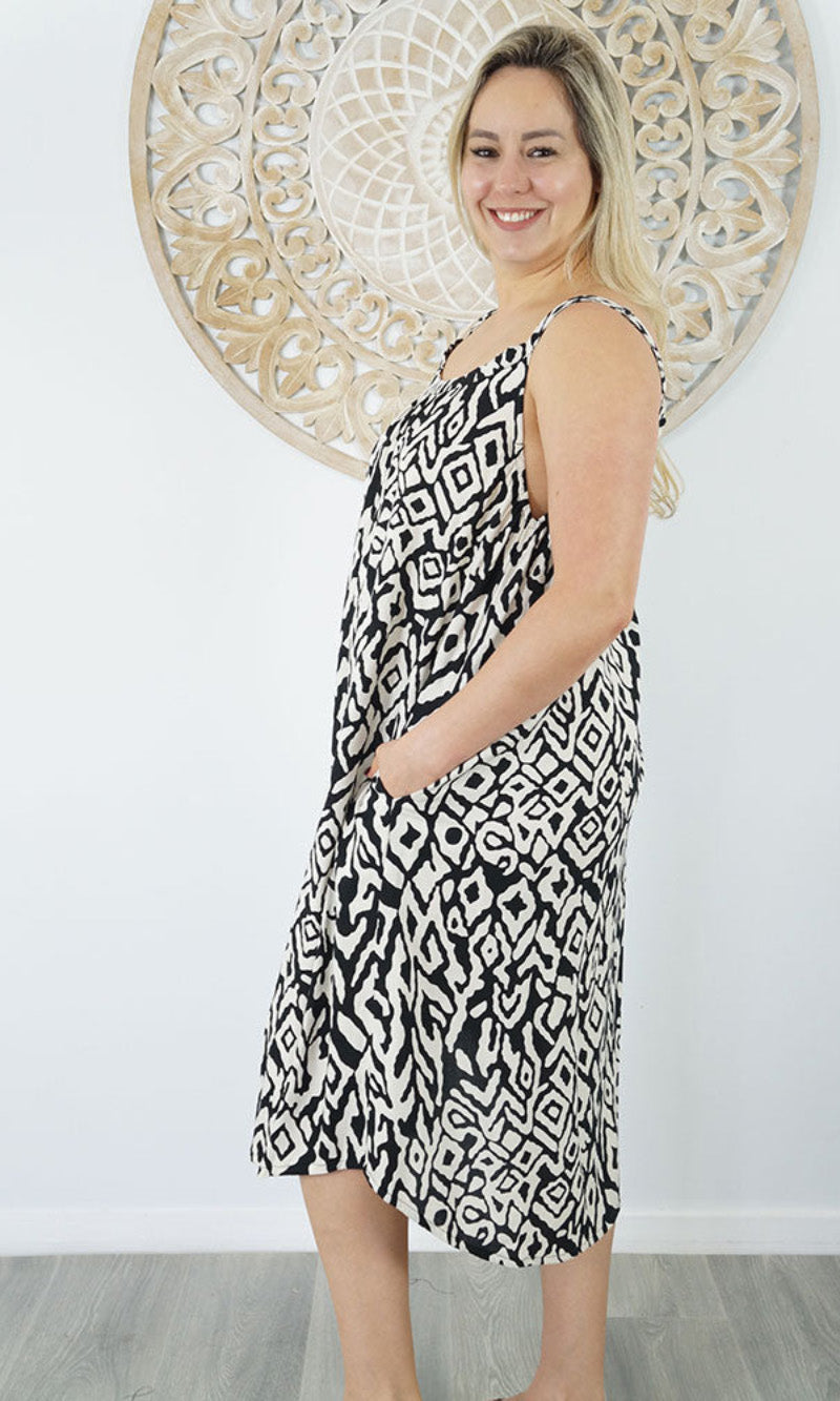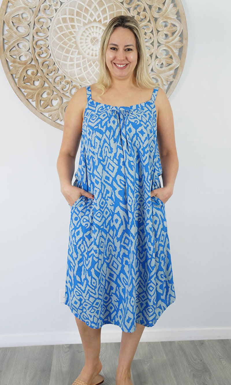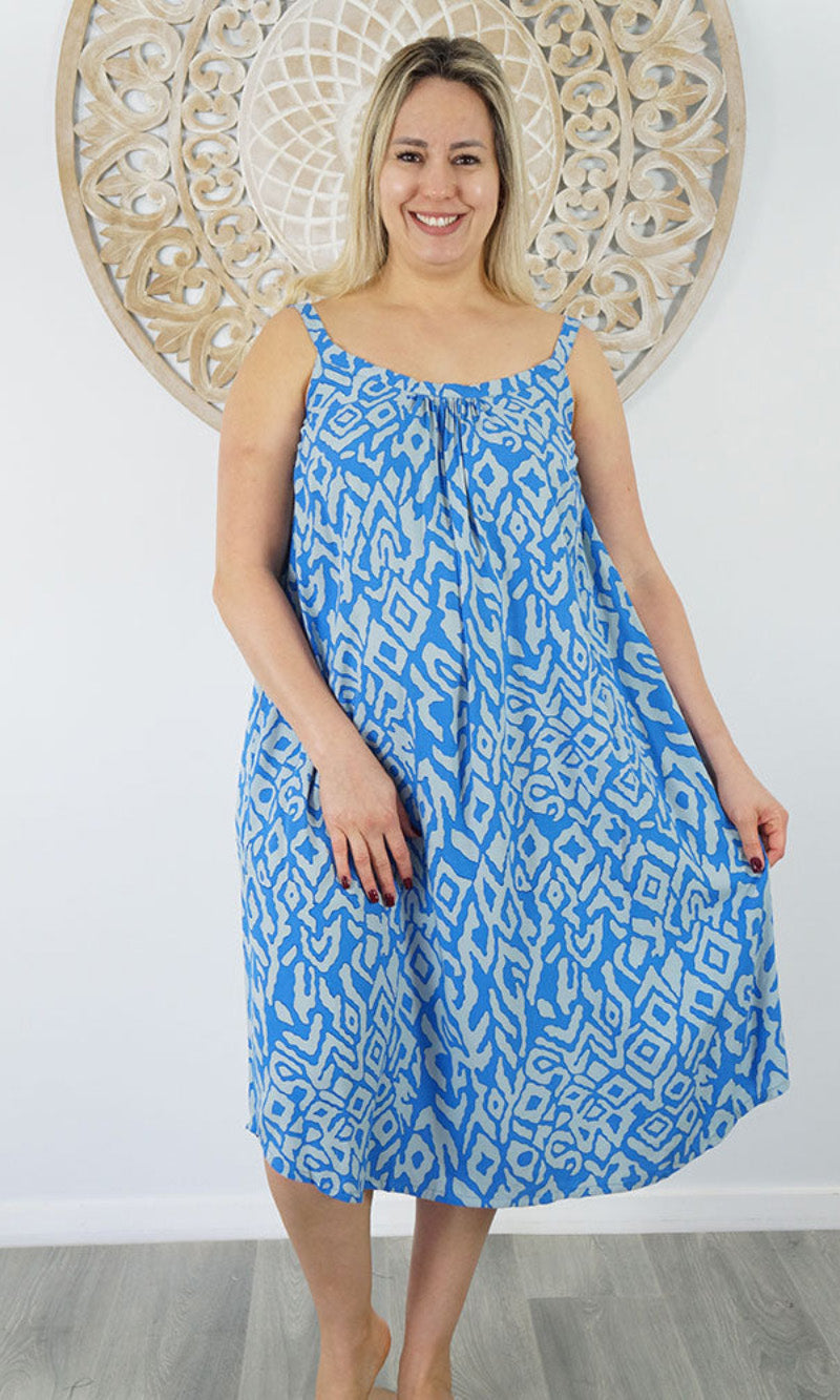 Easy fit mid length dress that falls away from the neckline. Comfortable elastic across the back and adjustable straps.