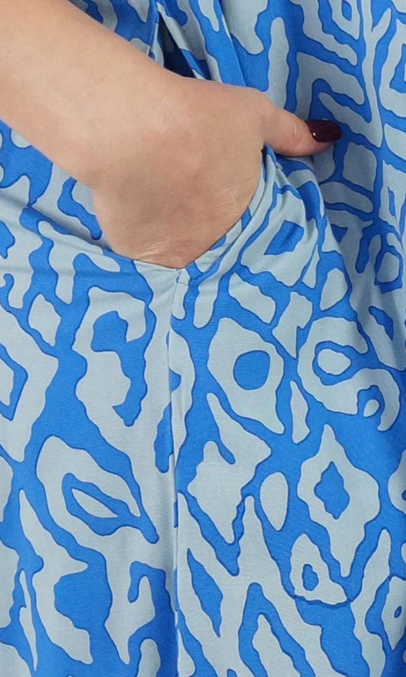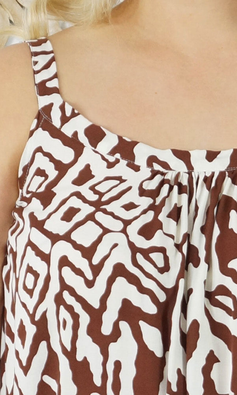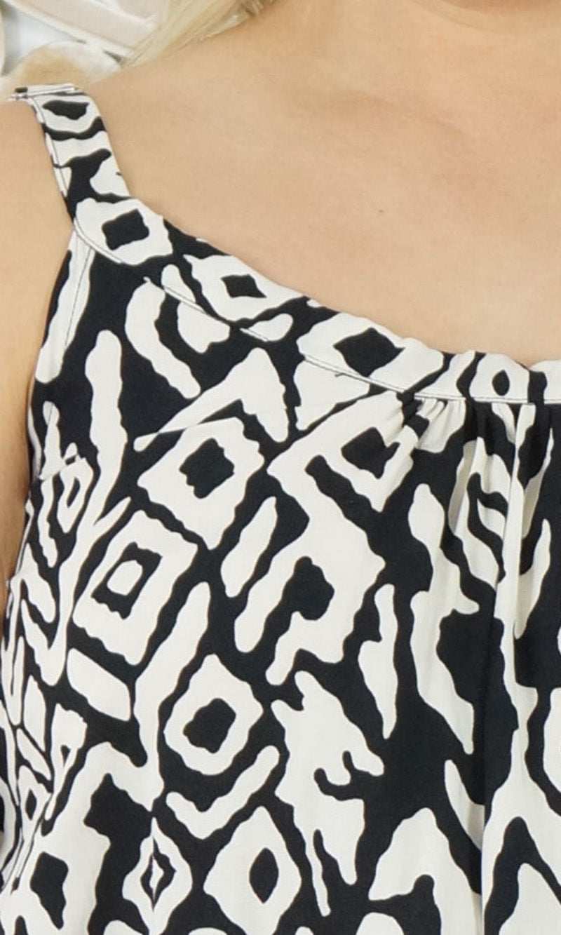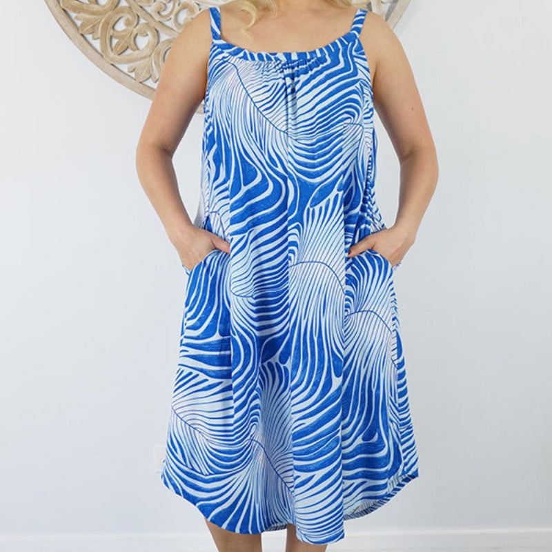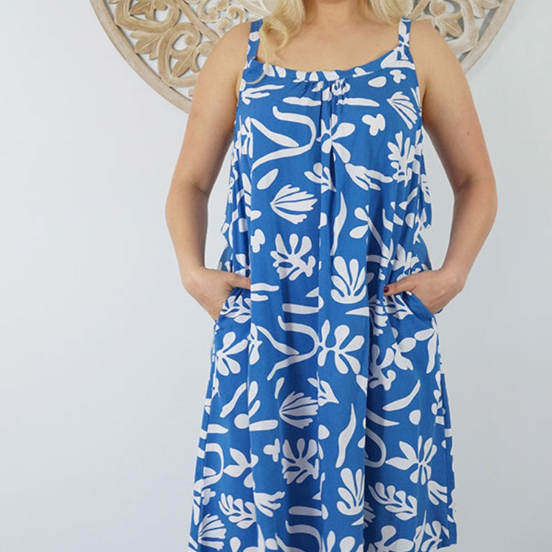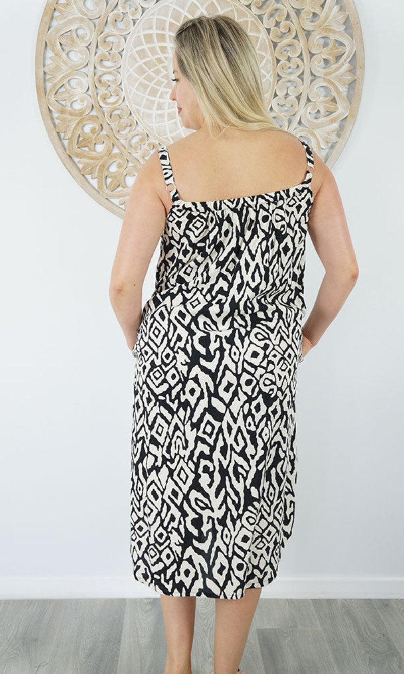 Easy fit mid length dress that falls away from the neckline. Comfortable elastic across the back and adjustable straps.