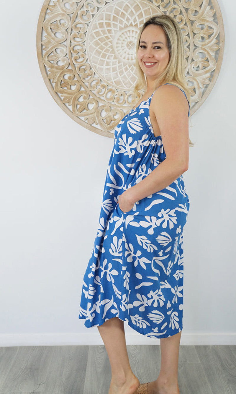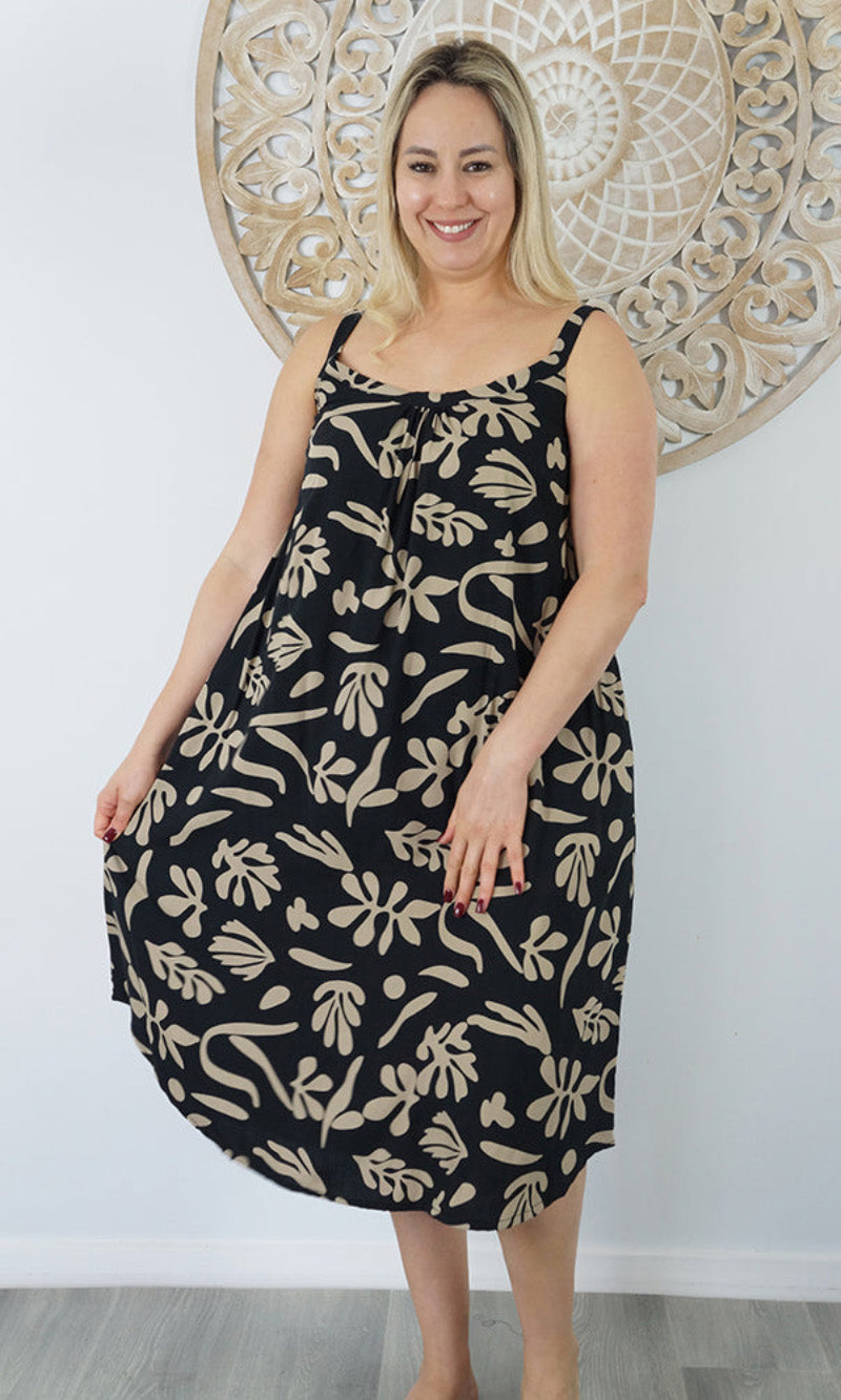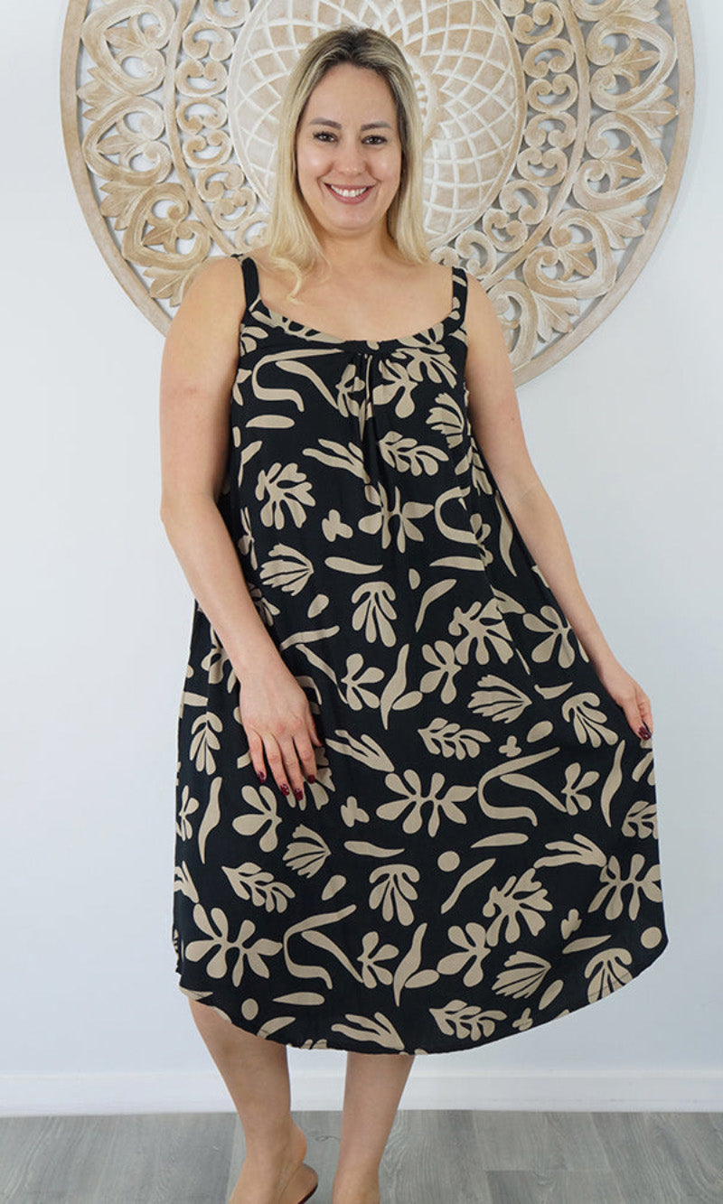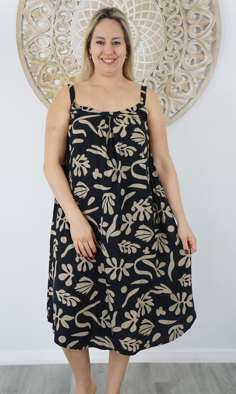 Easy fit mid length dress that falls away from the neckline. Comfortable elastic across the back and adjustable straps.