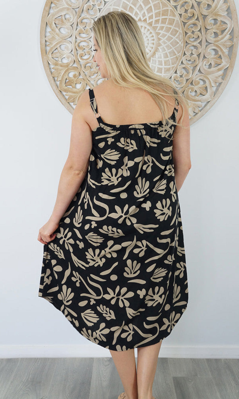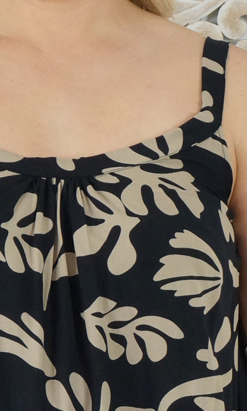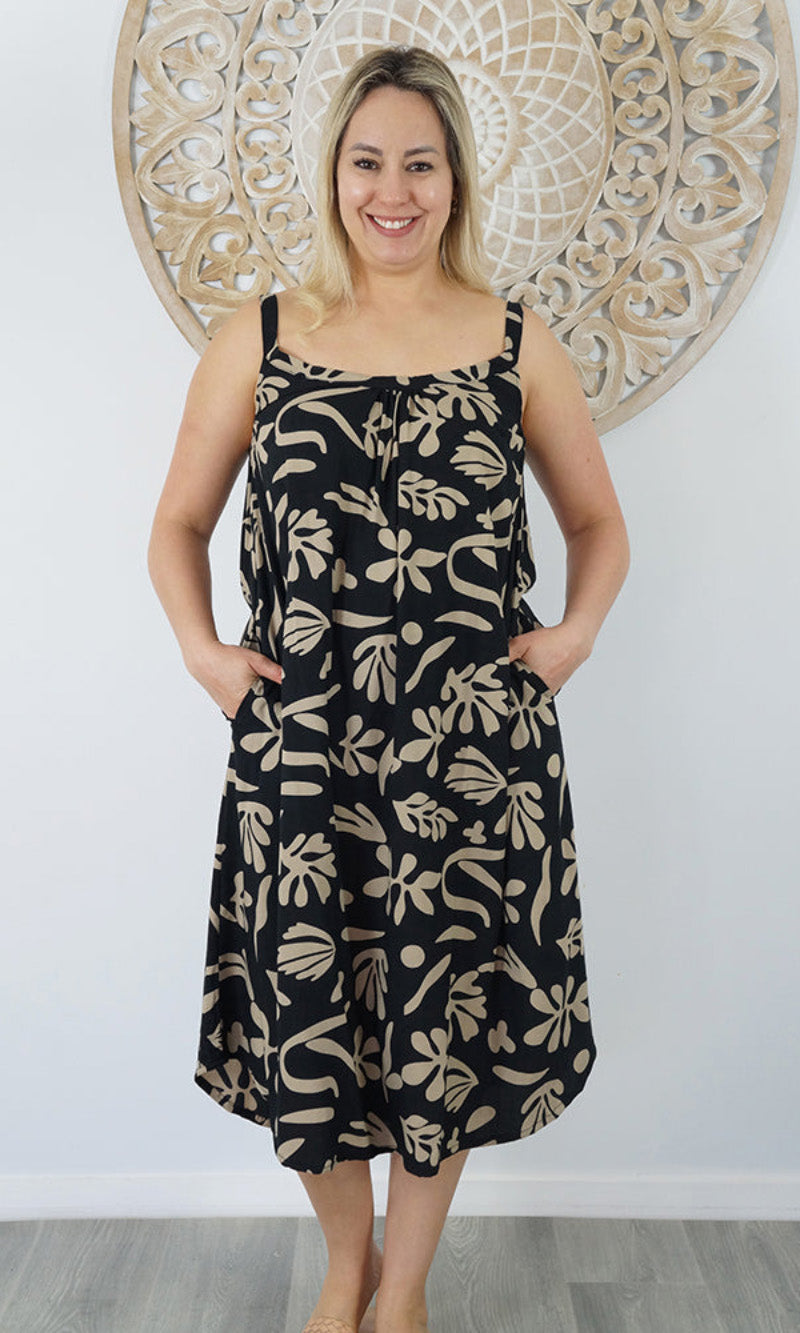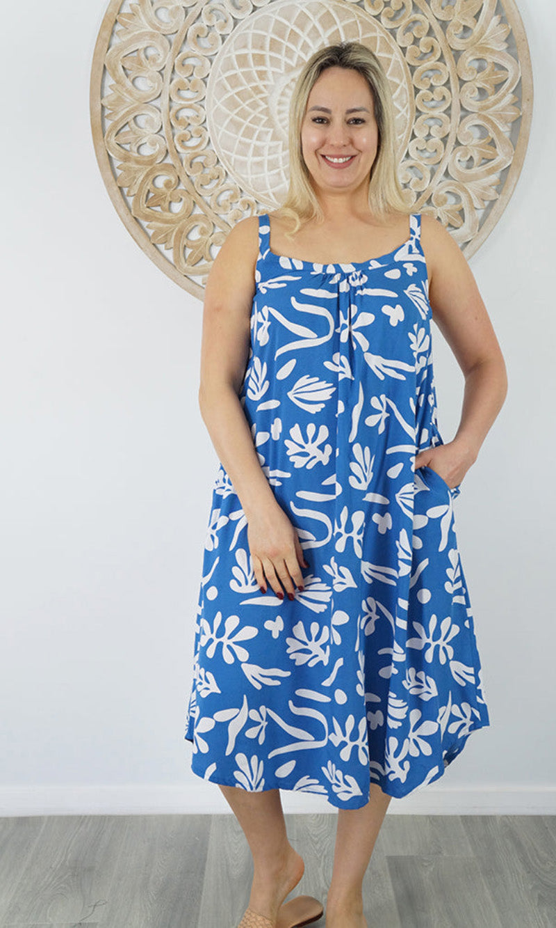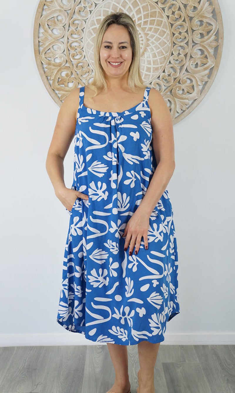 Easy fit mid length dress that falls away from the neckline. Comfortable elastic across the back and adjustable straps.