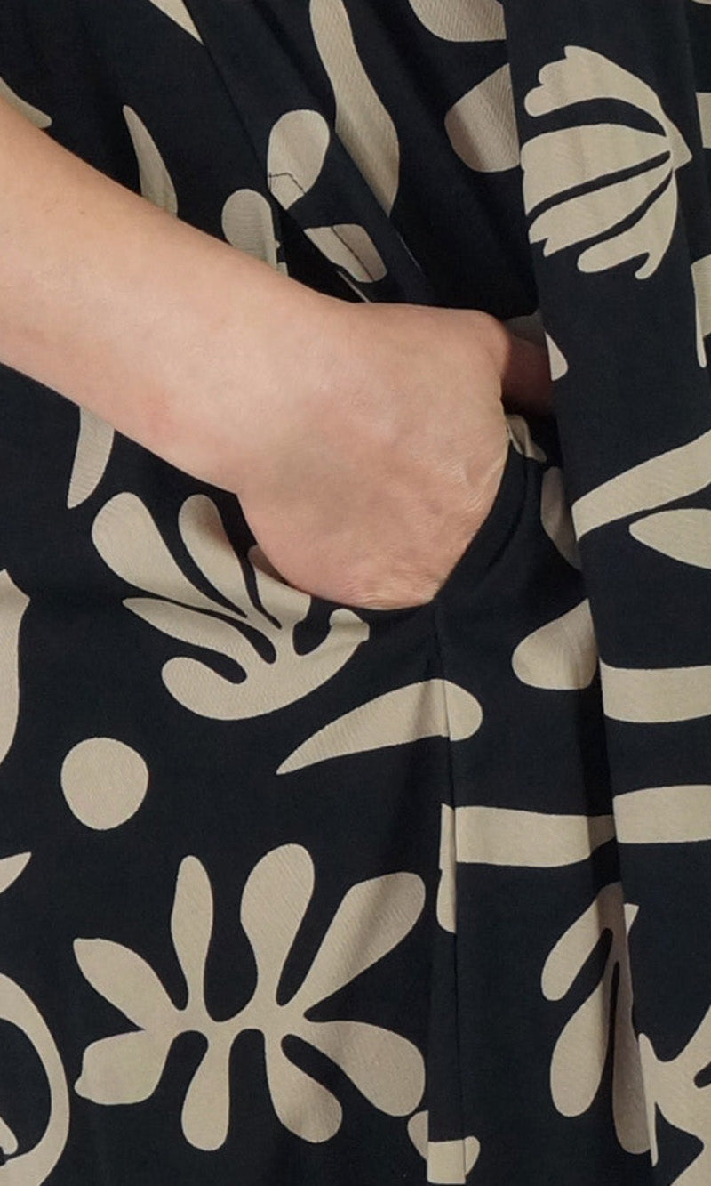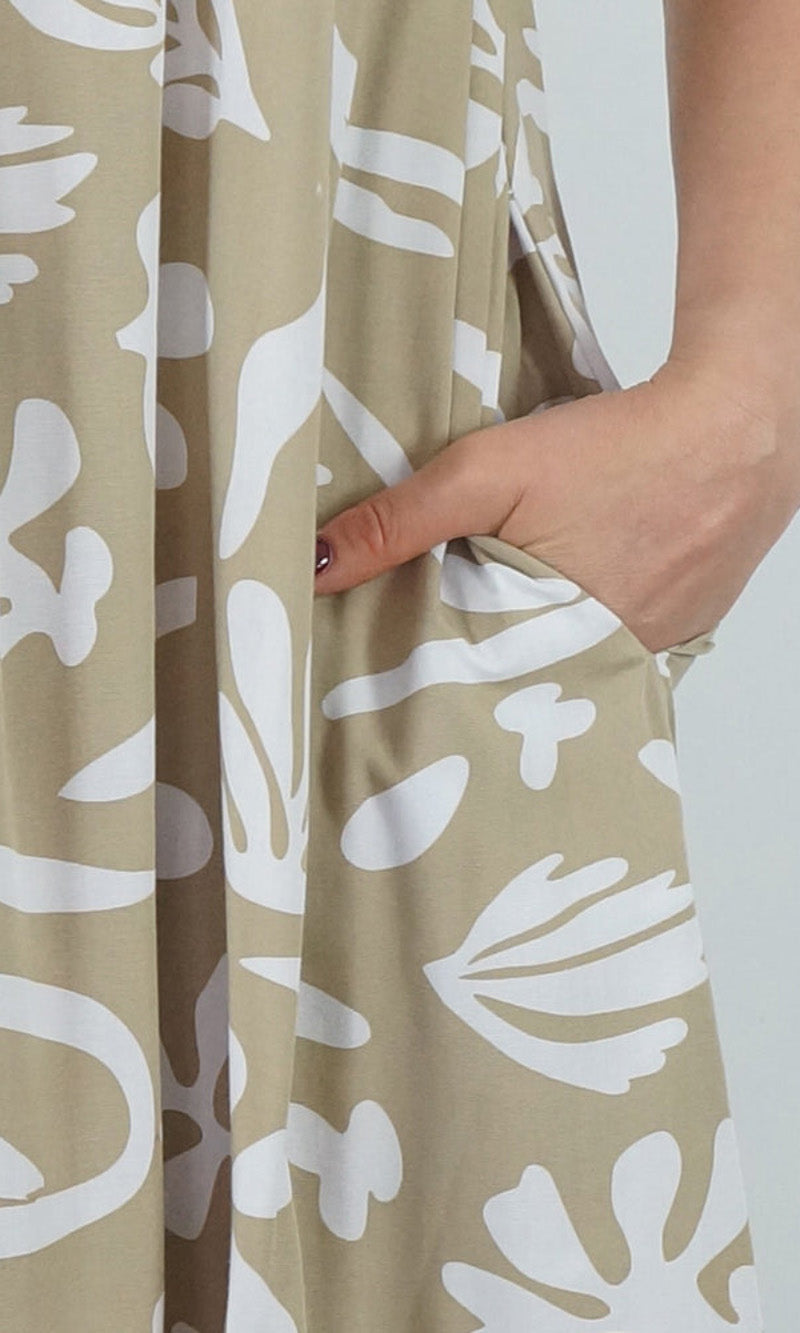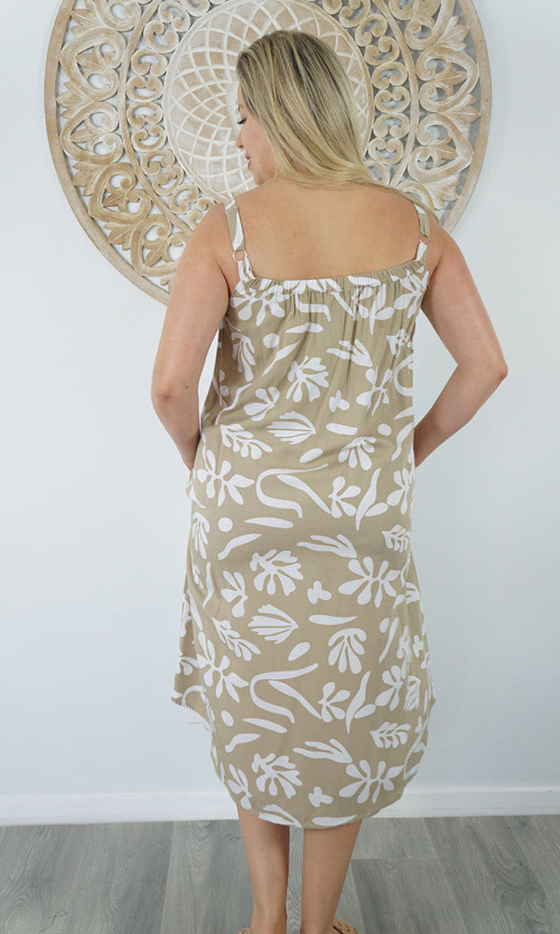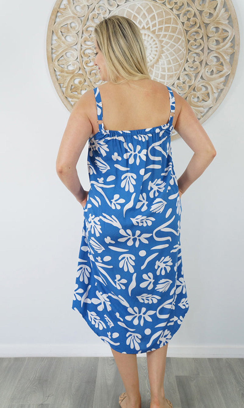 Easy fit mid length dress that falls away from the neckline. Comfortable elastic across the back and adjustable straps.