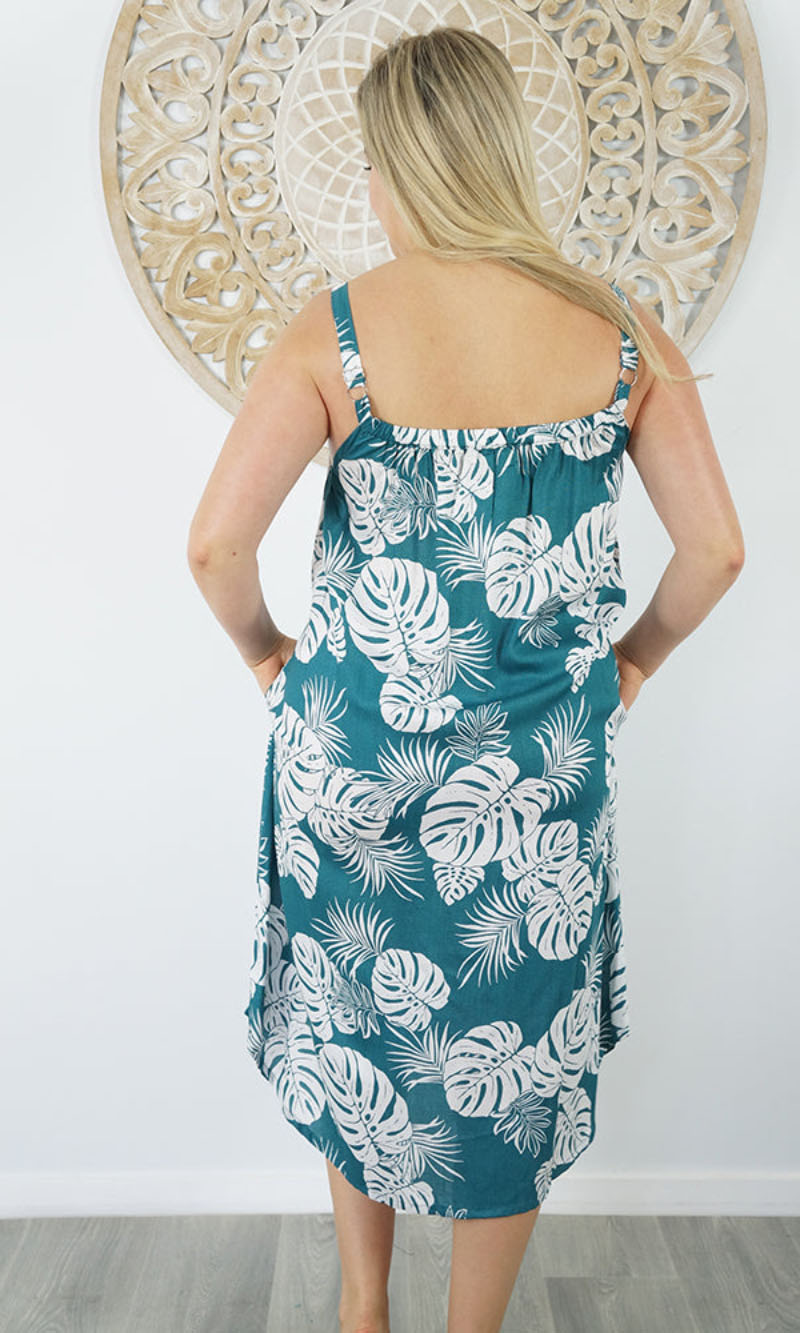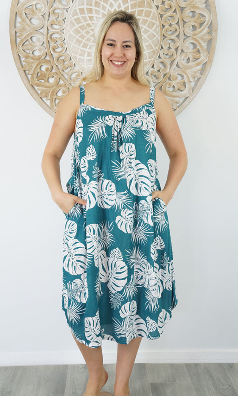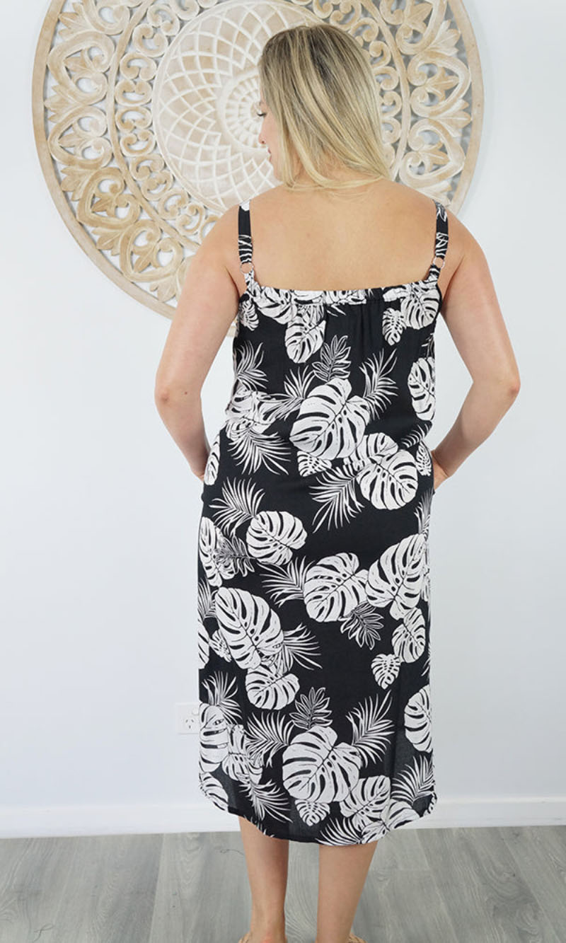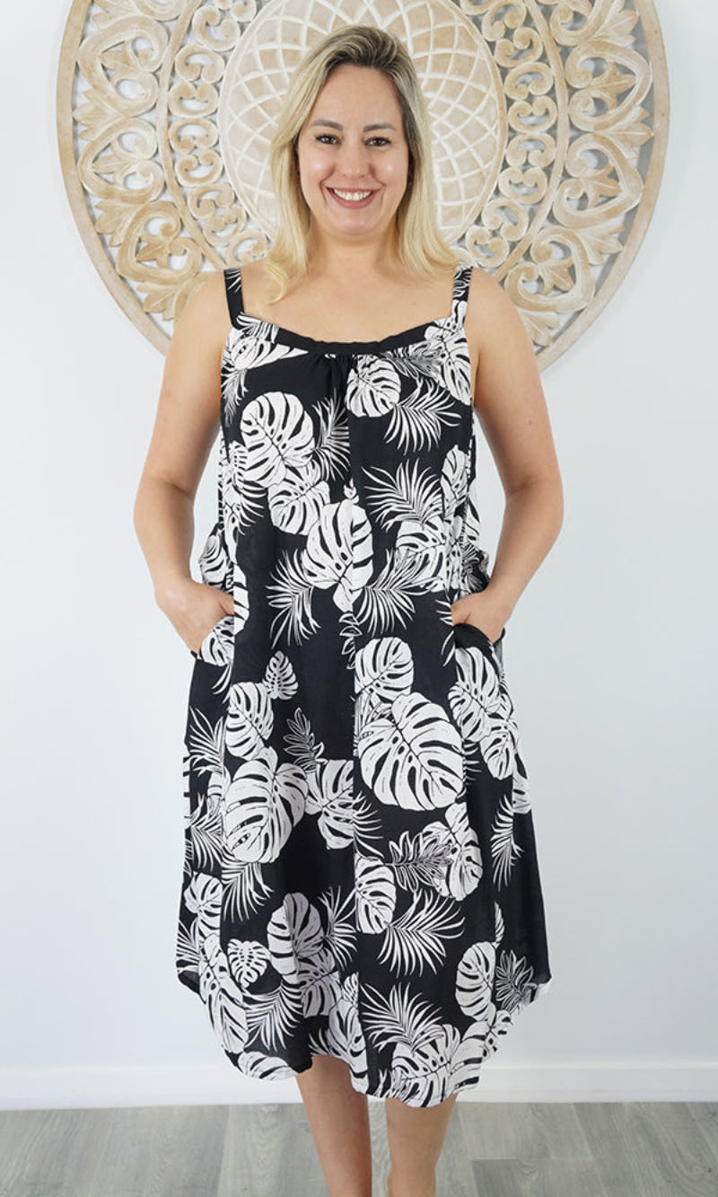 Easy fit mid length dress that falls away from the neckline. Comfortable elastic across the back and adjustable straps.