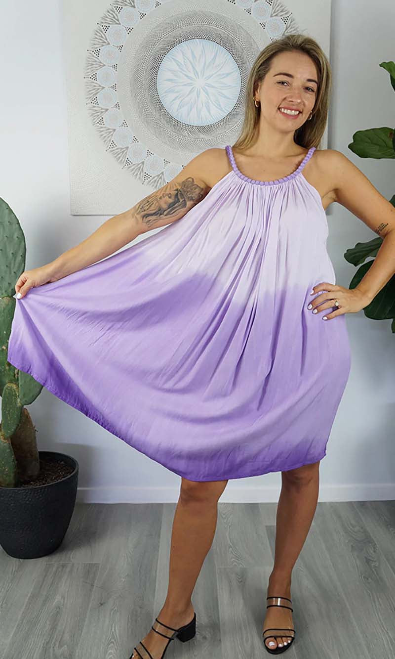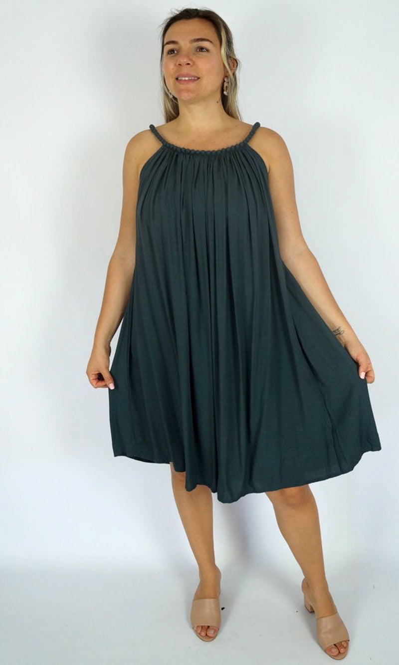 What a great dress for those warm summer days. Made from a plain colour cool rayon, with a stylish beaded neckline covered in fabric.