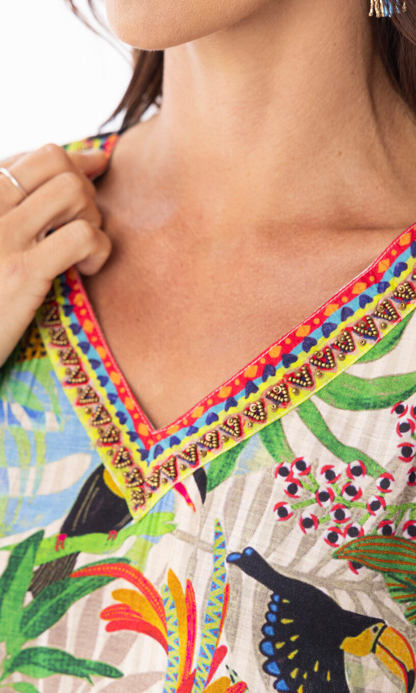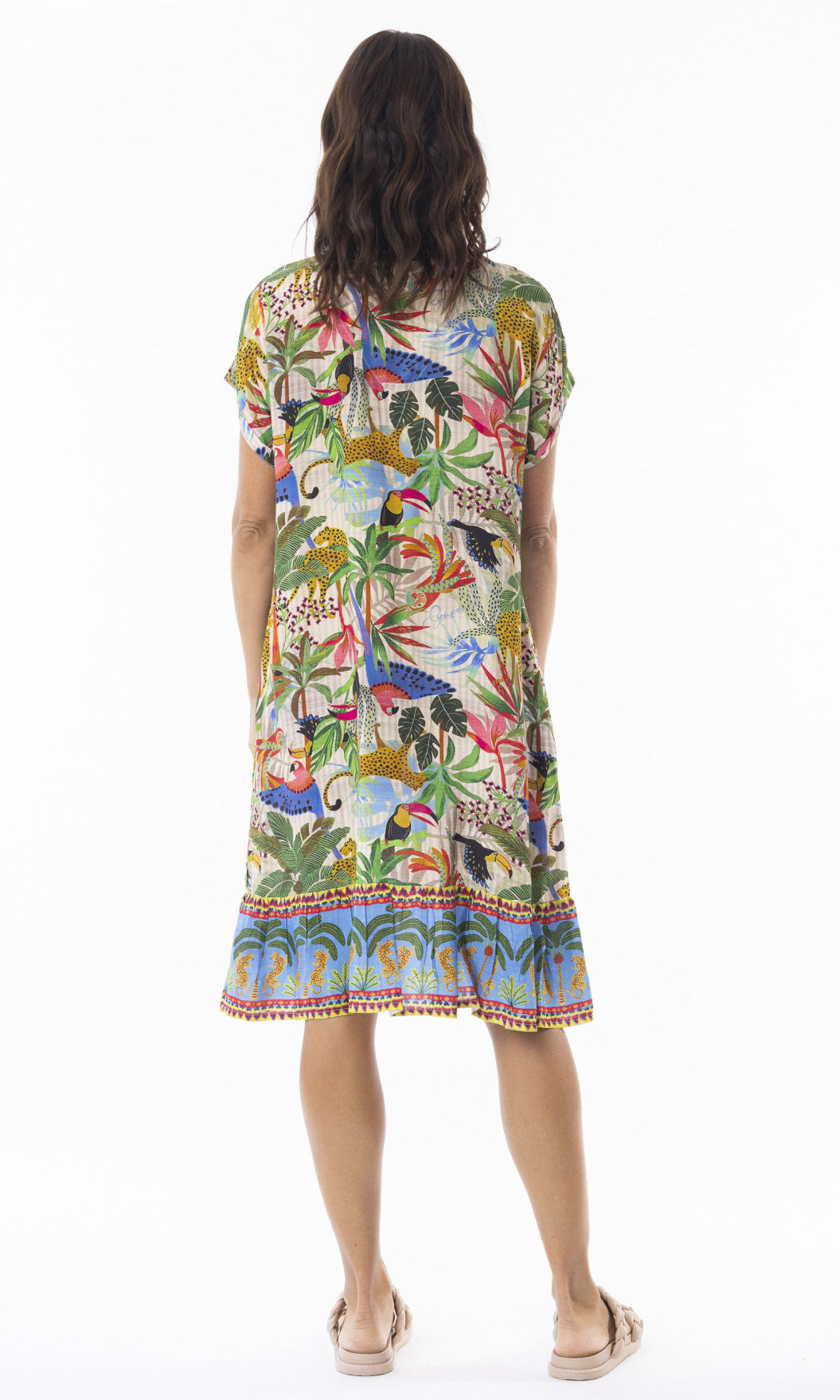 Discover the magic of the heart-stealing Dani Short Sleeve Frill Dress. Featuring Amazonian flora and fauna print, flattering triangle panels at the bust, shirring at the back, maxi length skirt, and frill hem, this dress is a classic silhouette. The gorgeous colours and prints makes this dress the perfect option for any occassion this summer!
