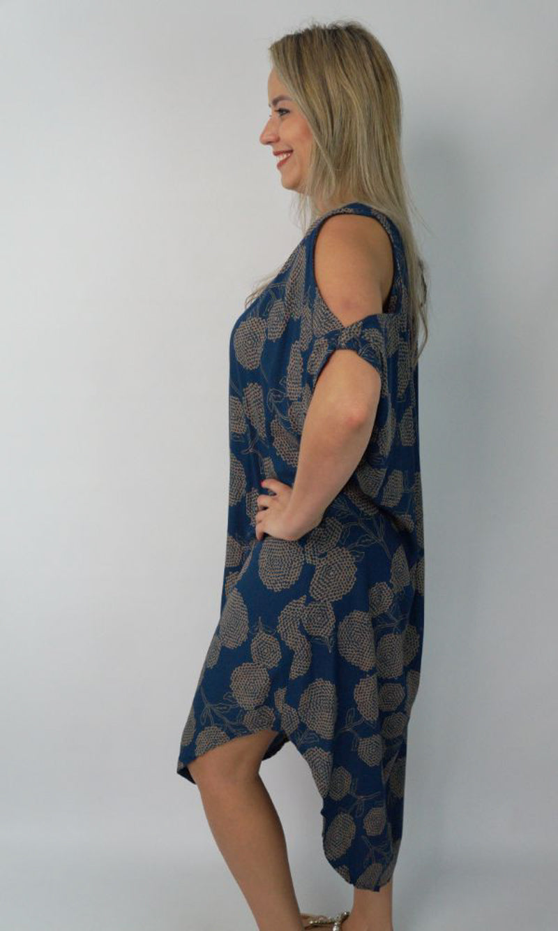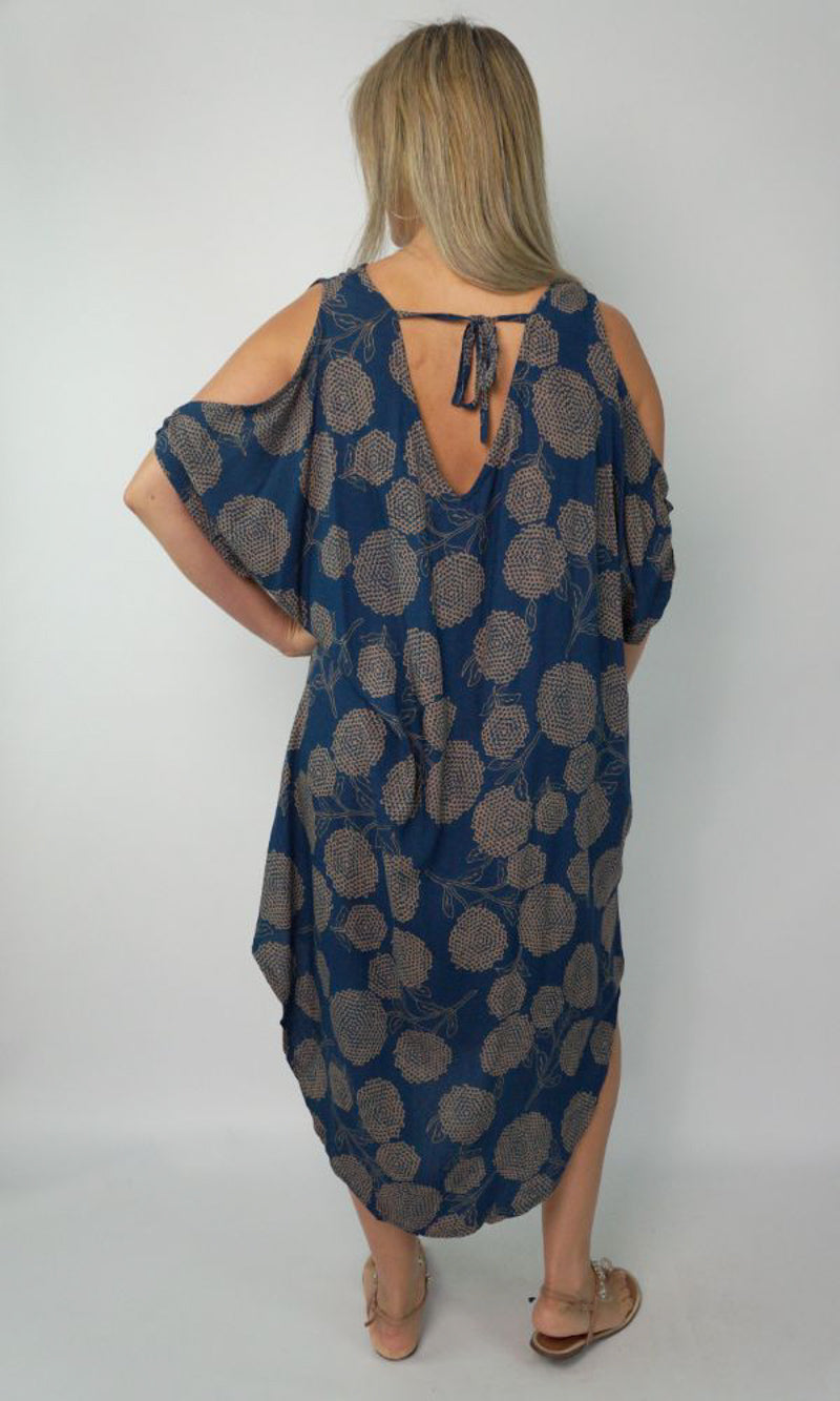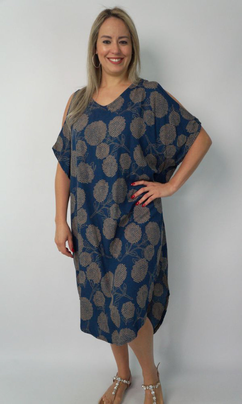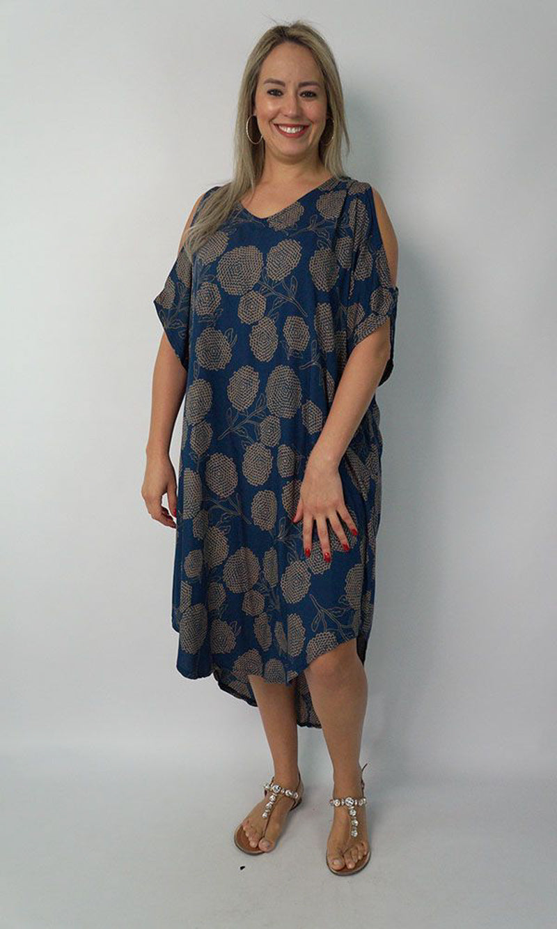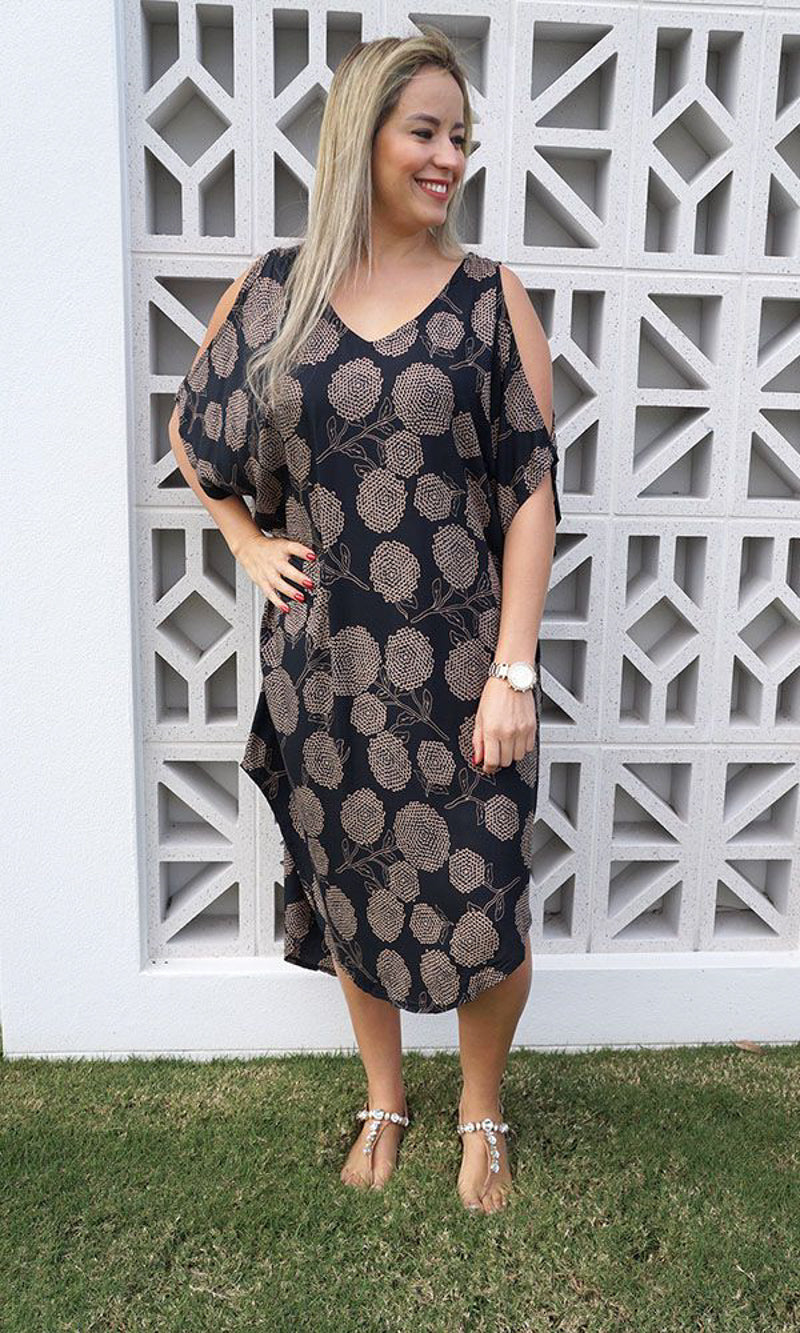 A simple but comfortable day dress. This rayon garment features a V-neck line, split capped sleeves, curved bottom hem and an adjustable tie across the back of the neck. ONE SIZE TO FIT 10-16
