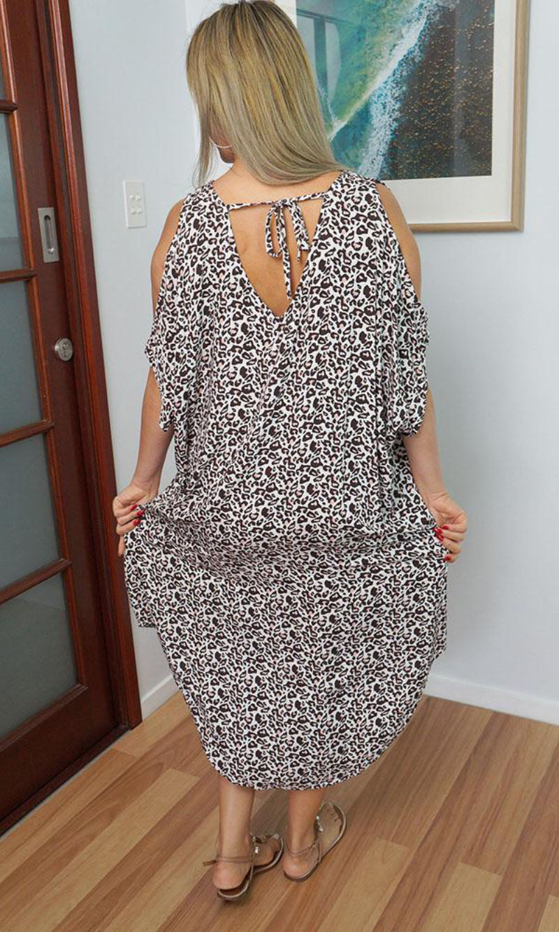 A simple but comfortable day dress. This rayon garment features a V-neck line, split capped sleeves, curved bottom hem and an adjustable tie across the back of the neck. ONE SIZE TO FIT 10-16
