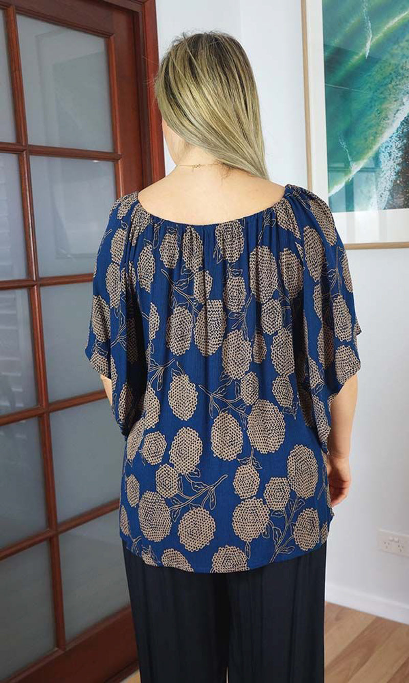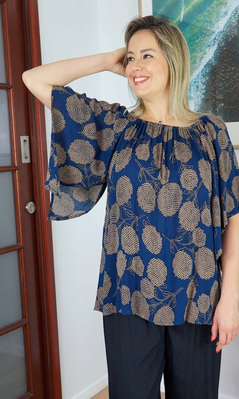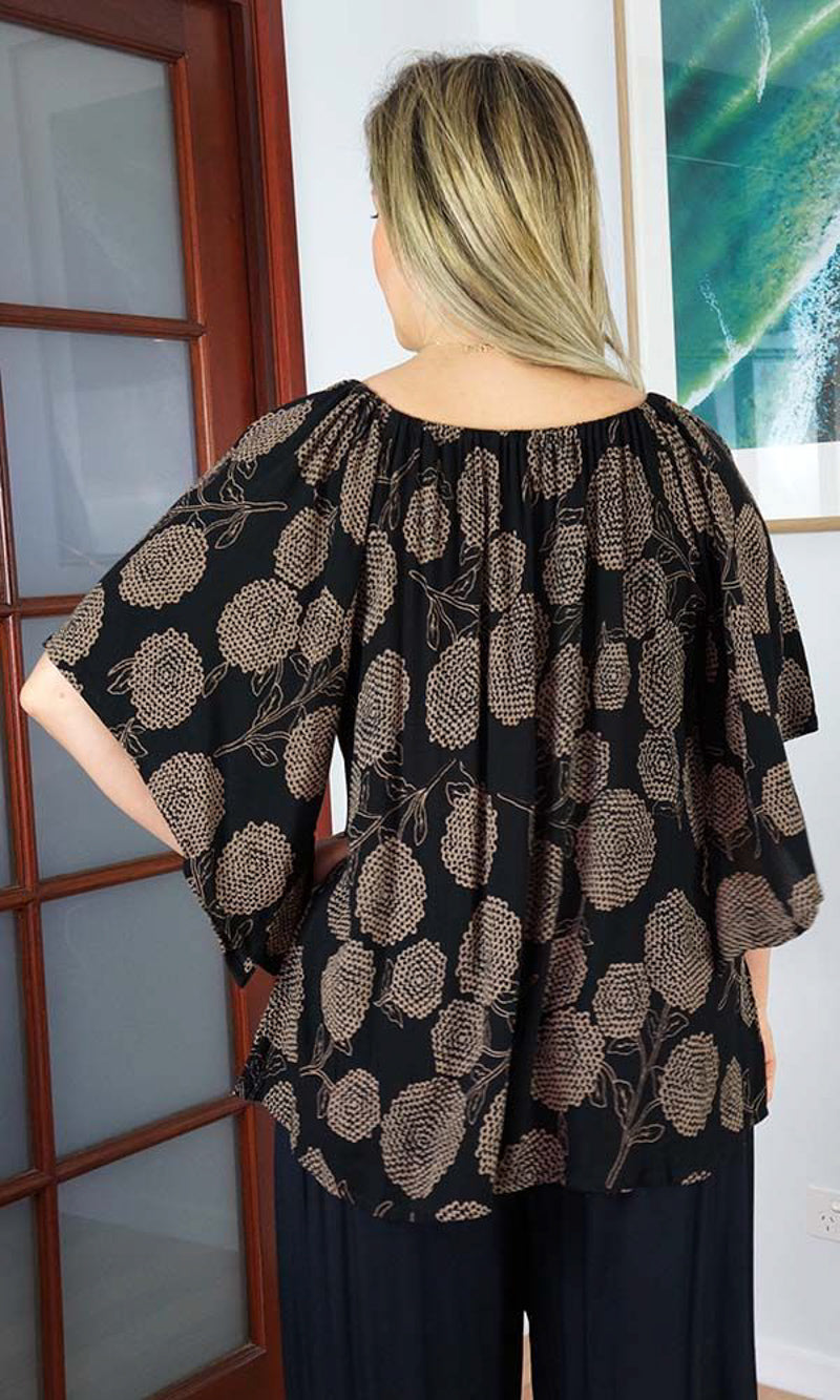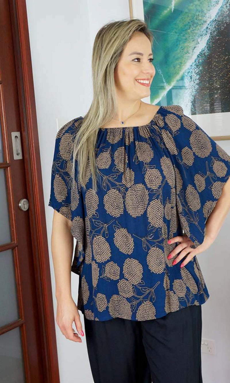 Made from crinkle rayon, featuring elastic around the neck line for an on or off the shoulder look along with angled split sleeves.
