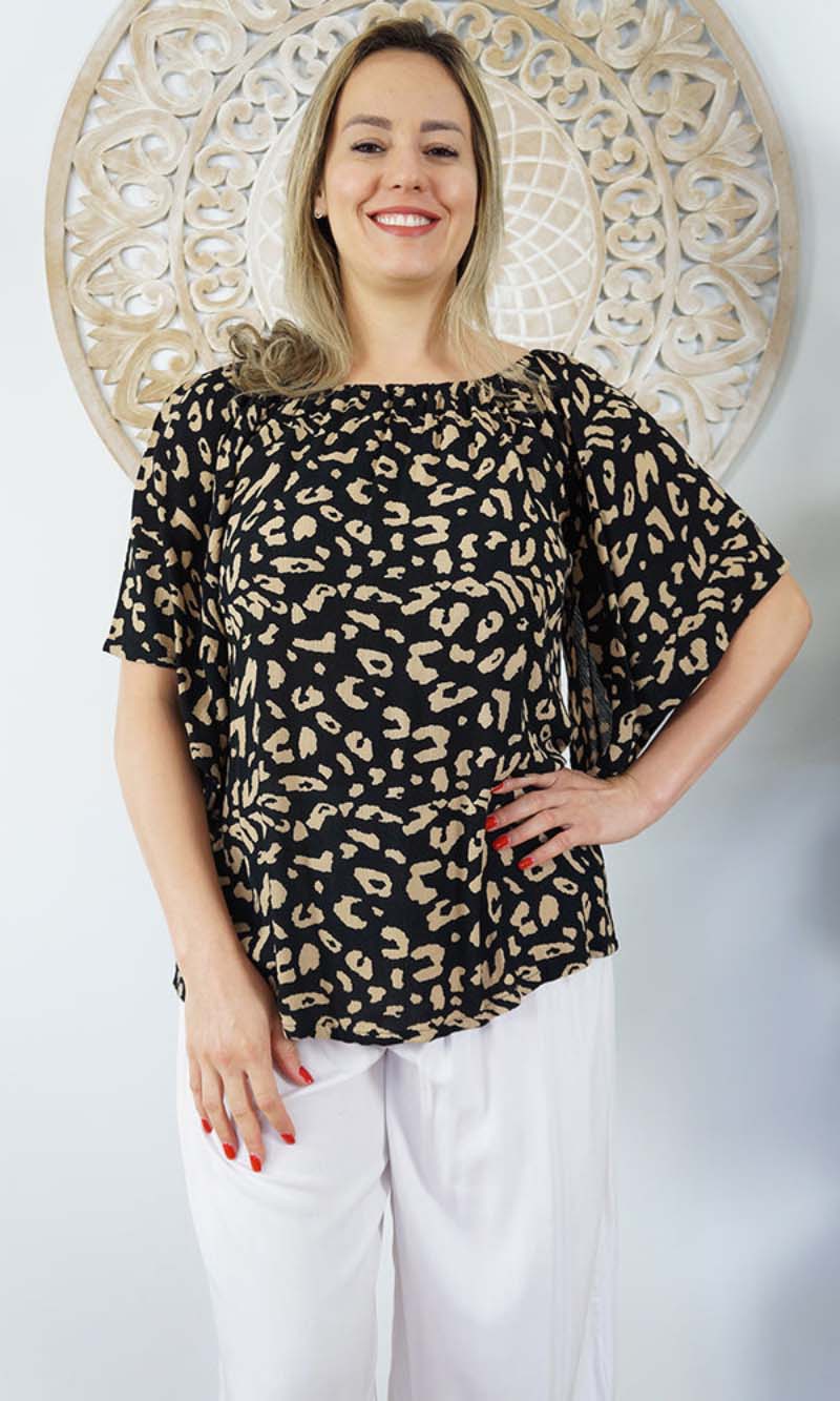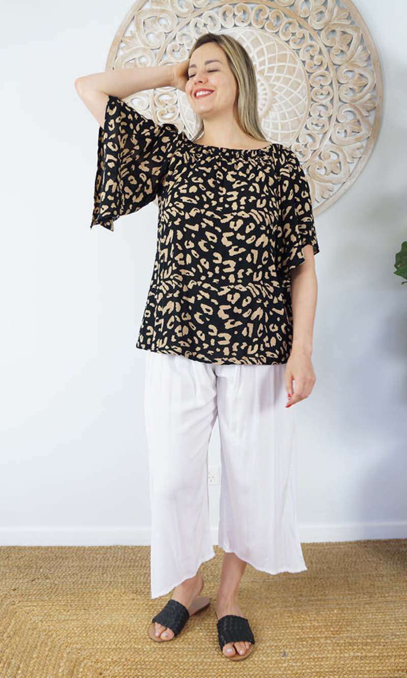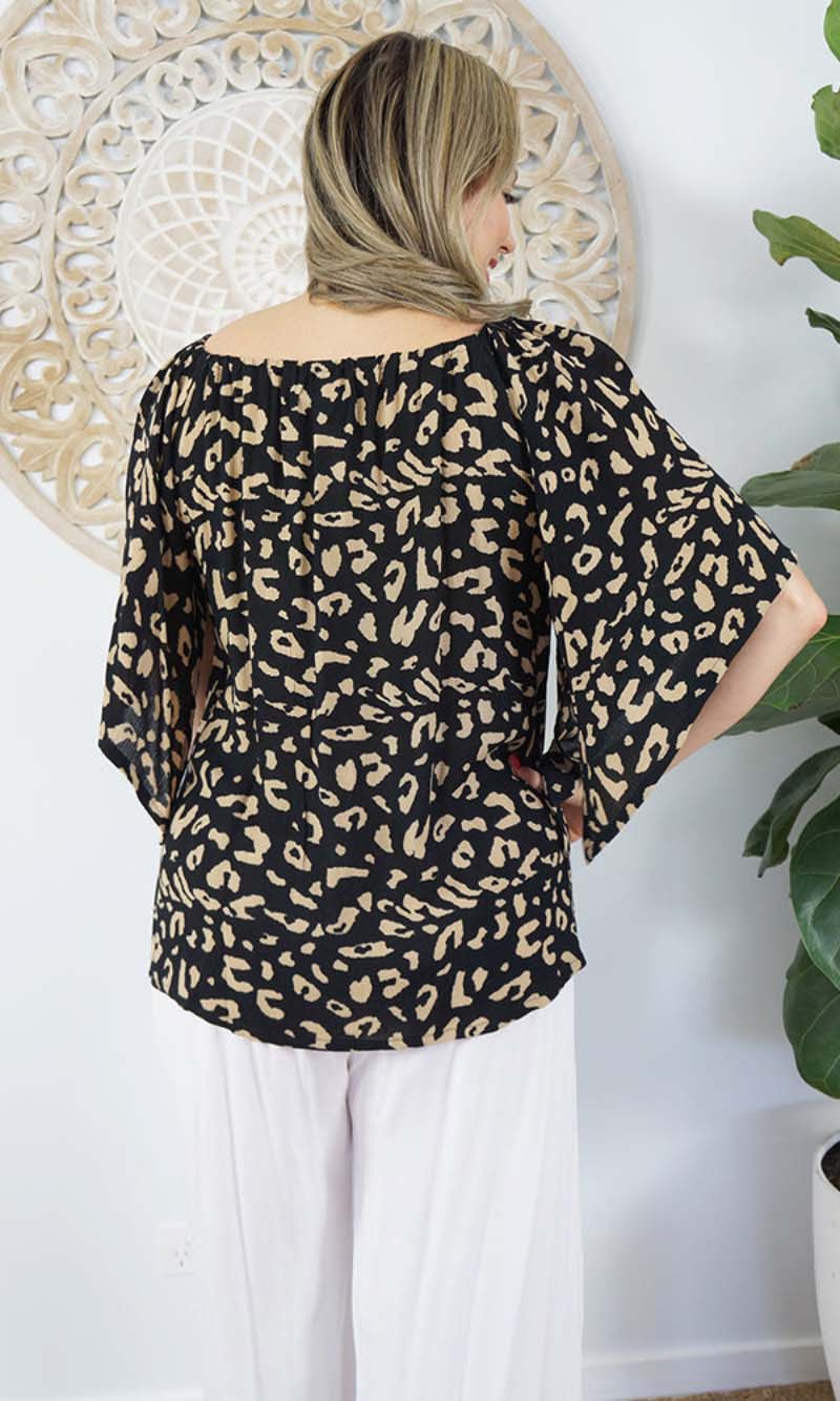 Made from crinkle rayon, featuring elastic around the neck line for an on or off the shoulder look along with angled split sleeves.