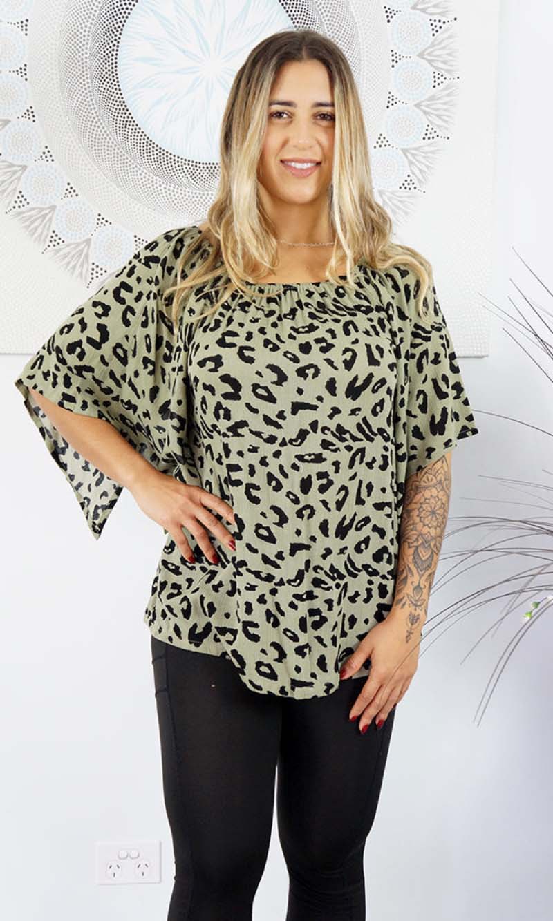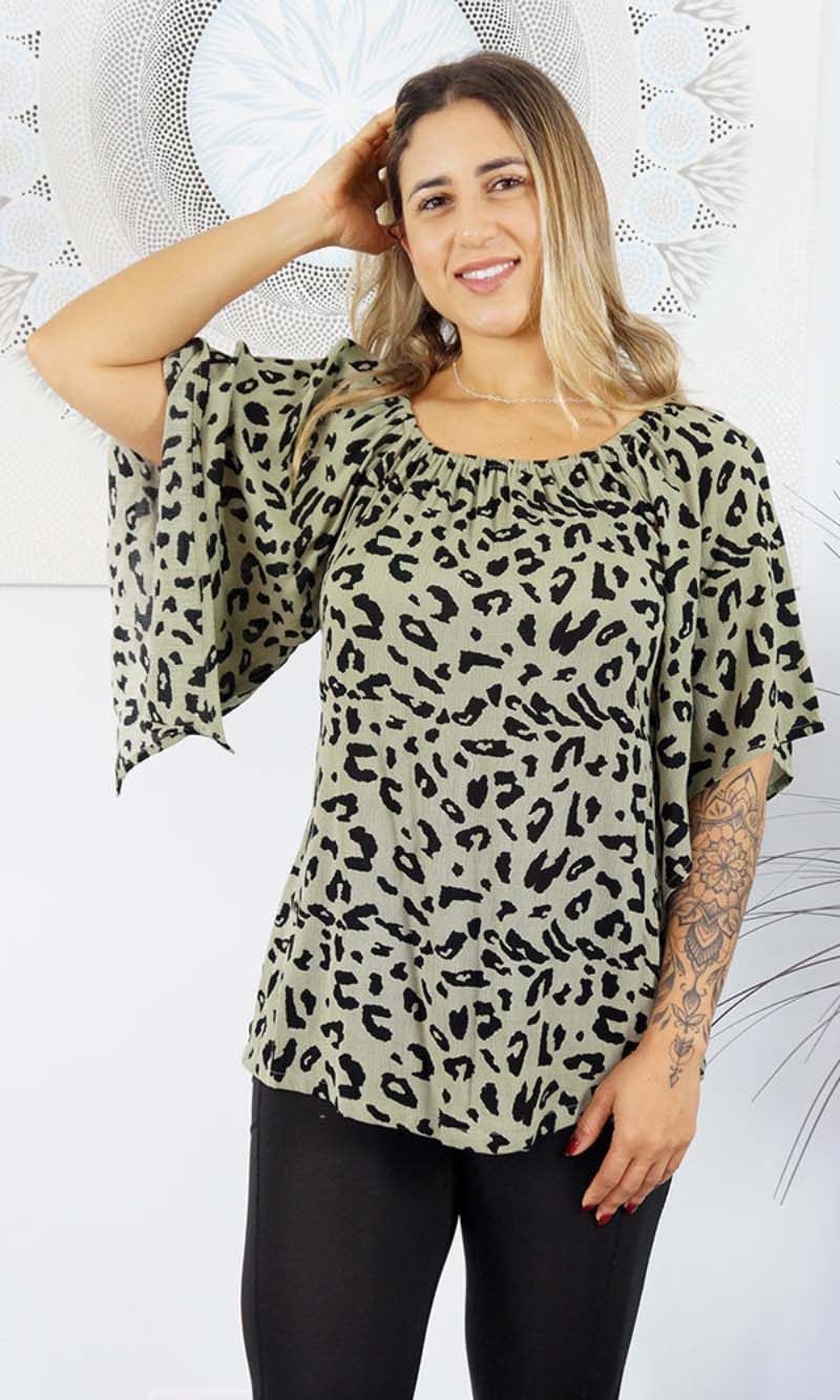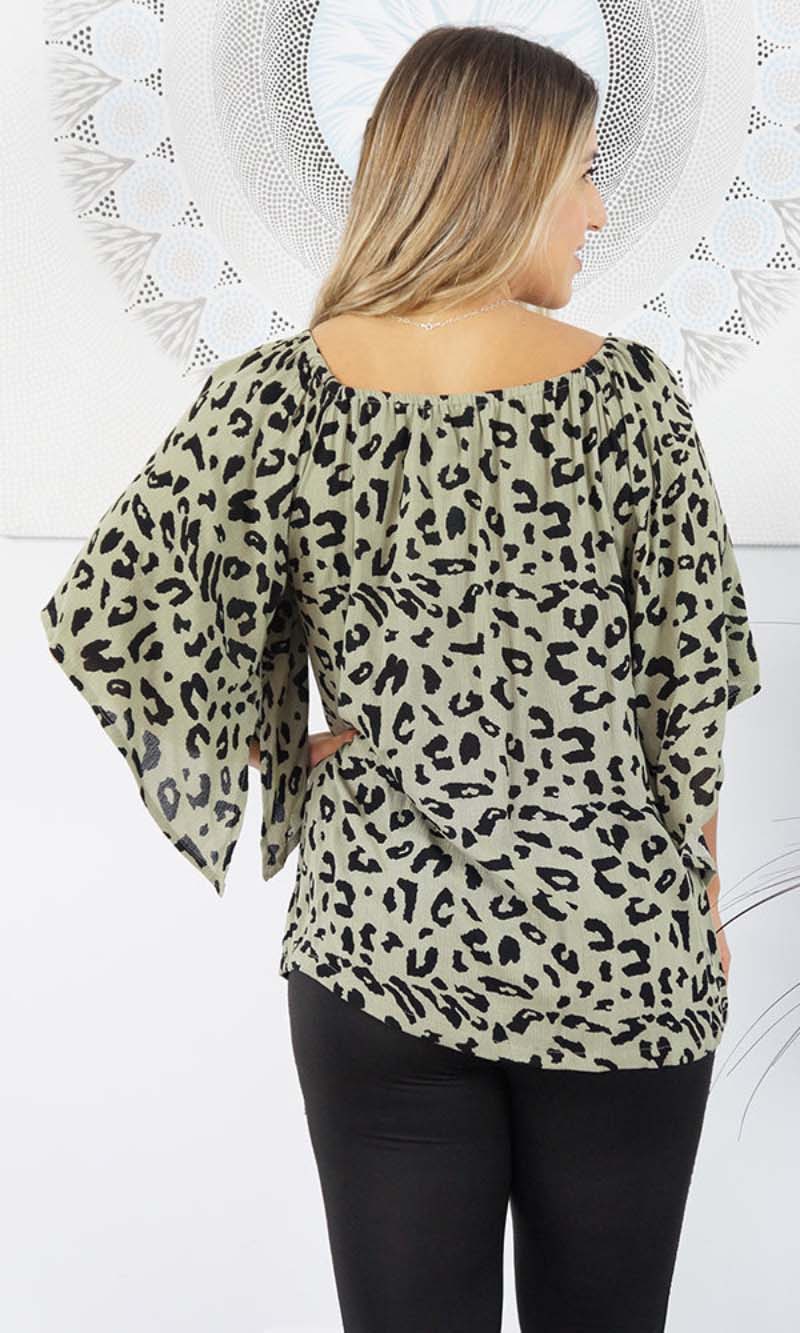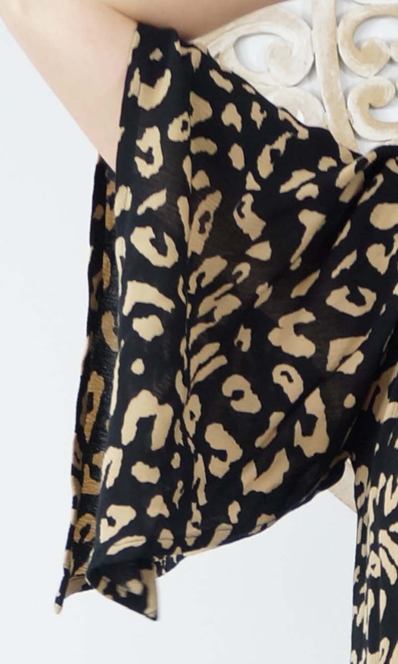 Made from crinkle rayon, featuring elastic around the neck line for an on or off the shoulder look along with angled split sleeves.