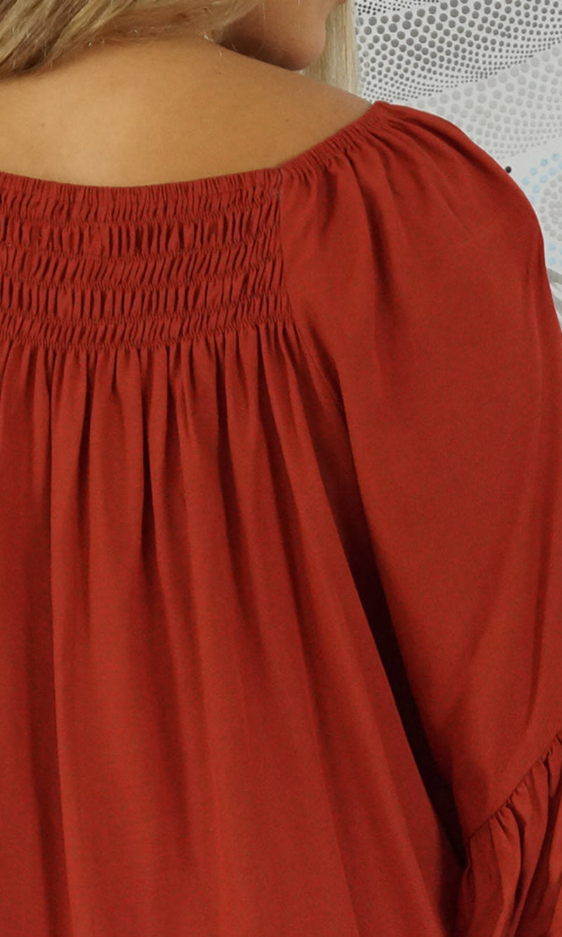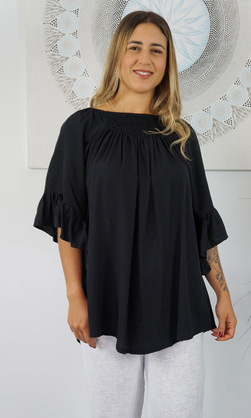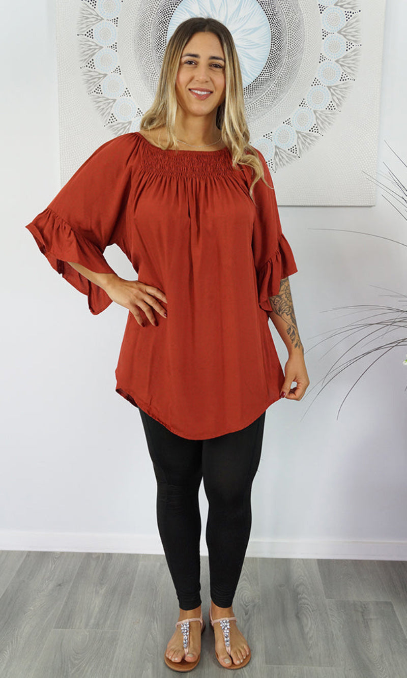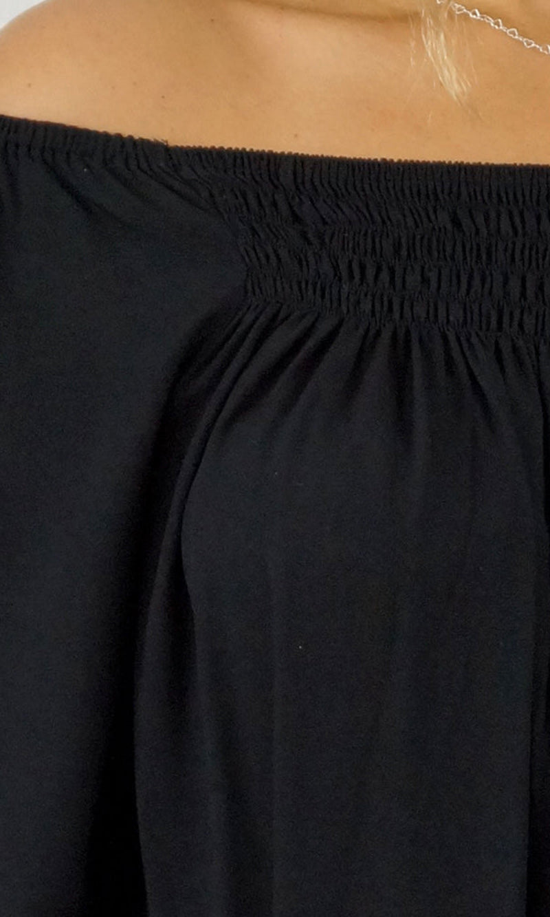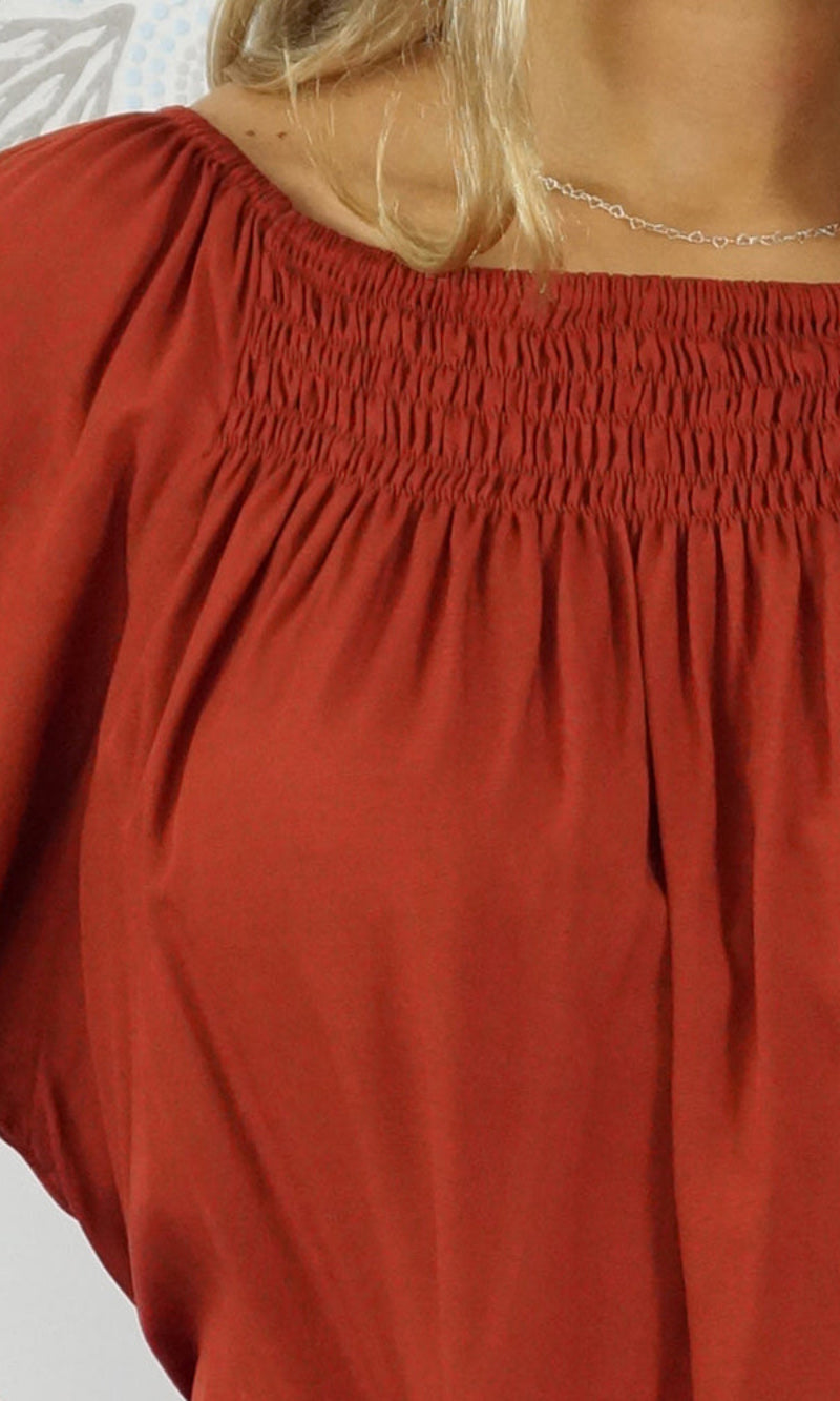 With an option to wear on or off the shoulders as the neckline is elasticated & a extra panel of shirring front and back for more of a comfortable fit.  The 1/2 bell sleeve adds a little bit of flair to the style.