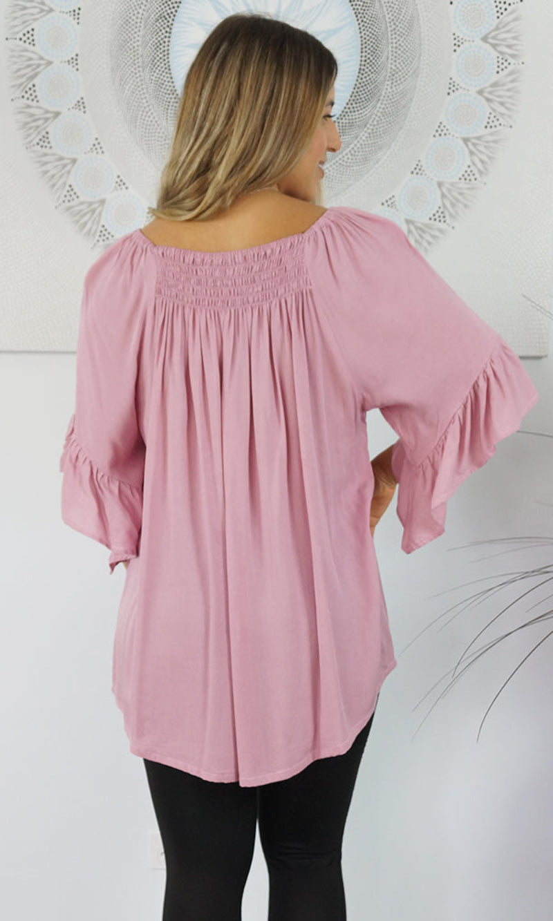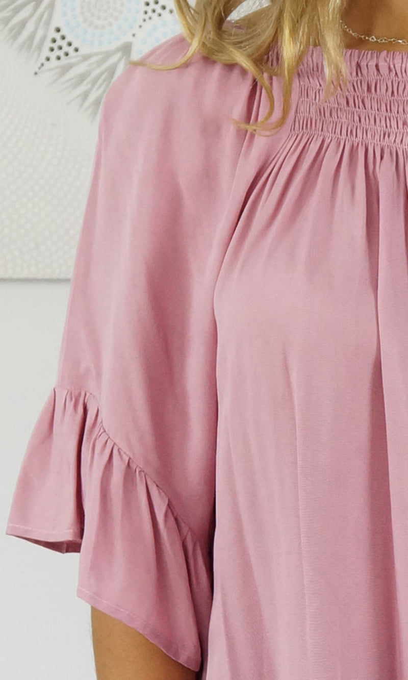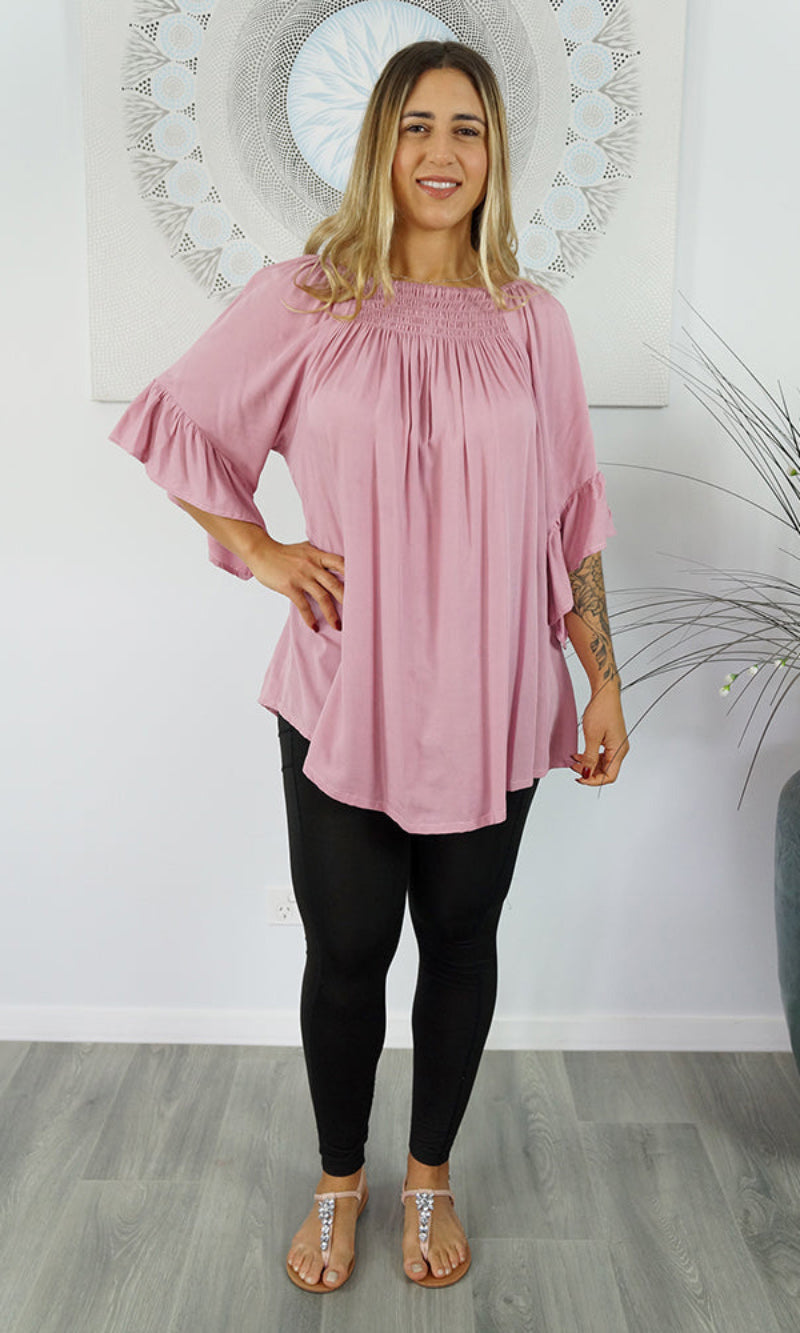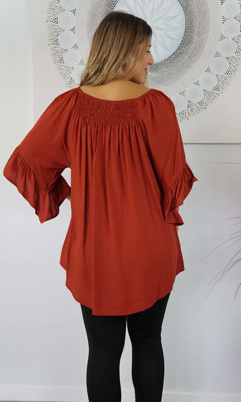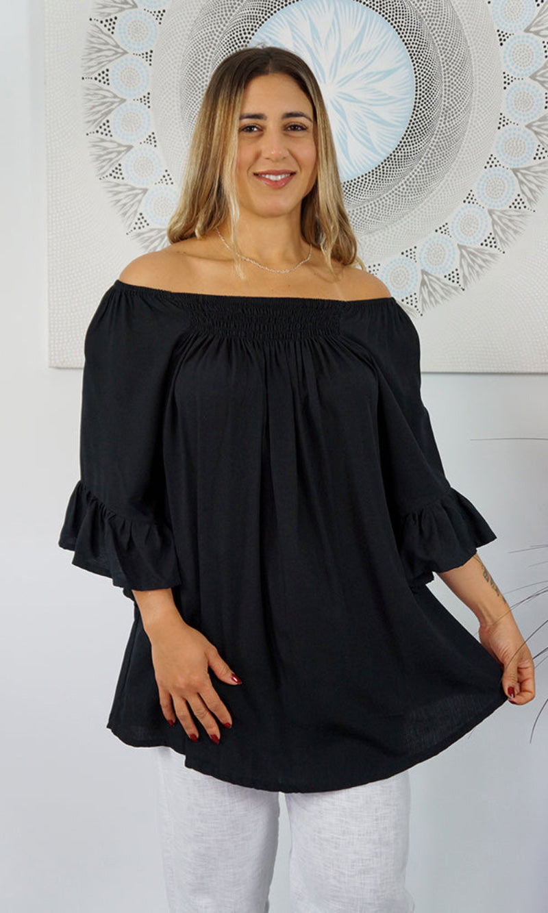 With an option to wear on or off the shoulders as the neckline is elasticated & a extra panel of shirring front and back for more of a comfortable fit.  The 1/2 bell sleeve adds a little bit of flair to the style.