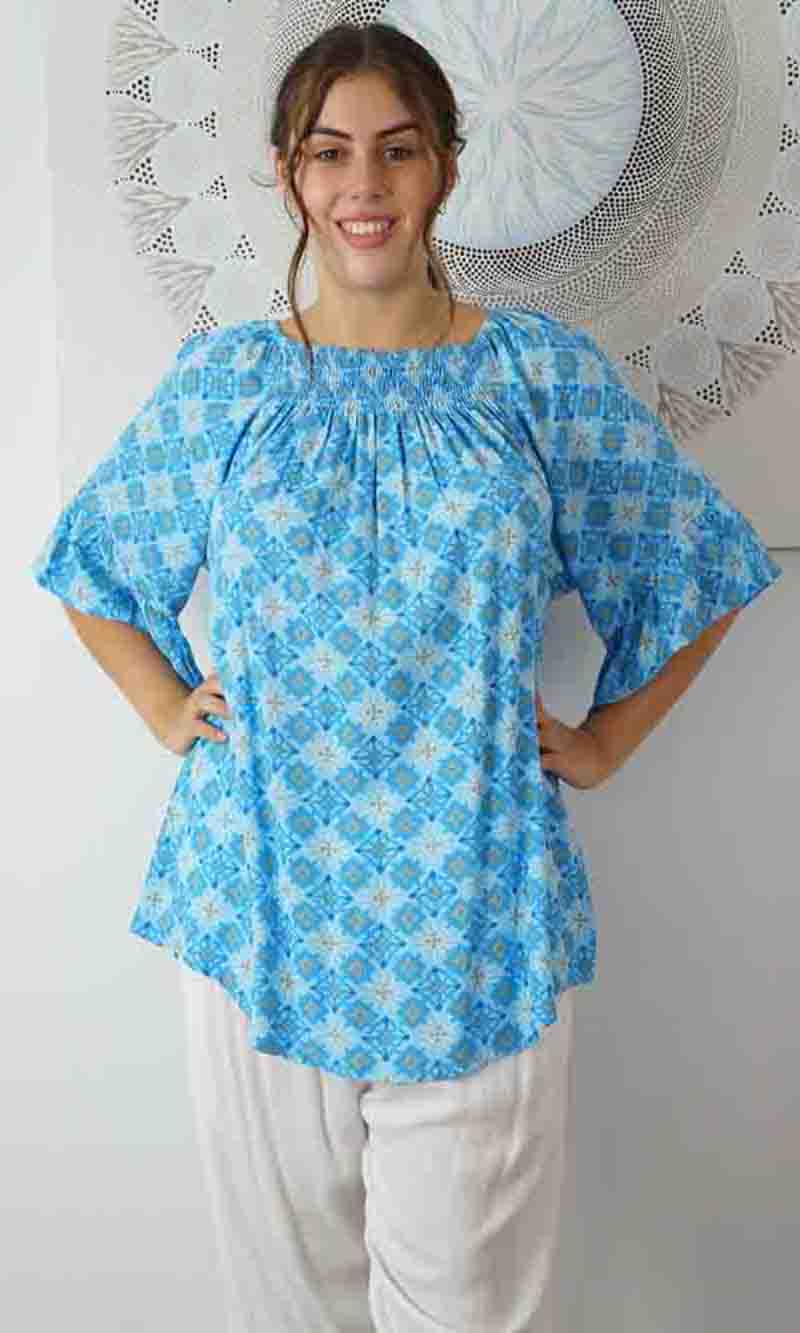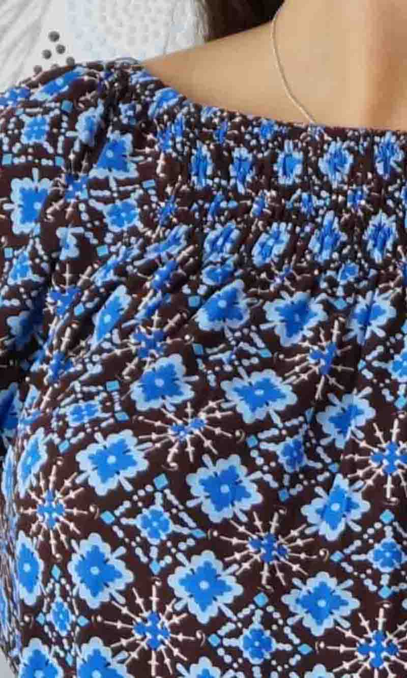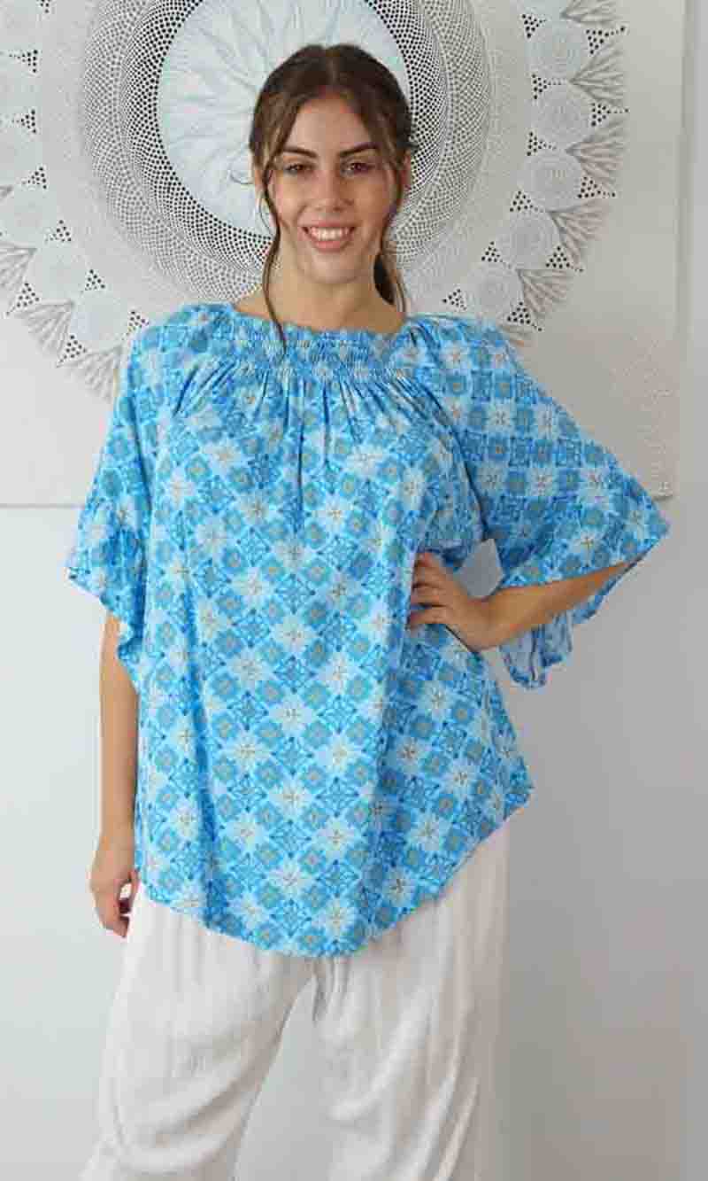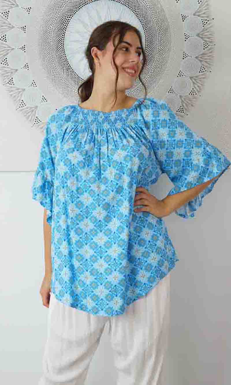 With an option to wear on or off the shoulders as the neckline is elasticated & a extra panel of shirring front and back for more of a comfortable fit.  The 1/2 bell sleeve adds a little bit of flair to the style.