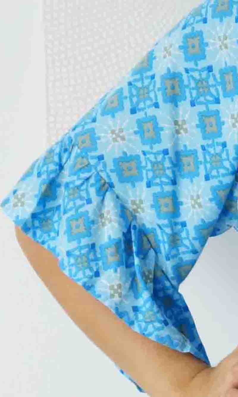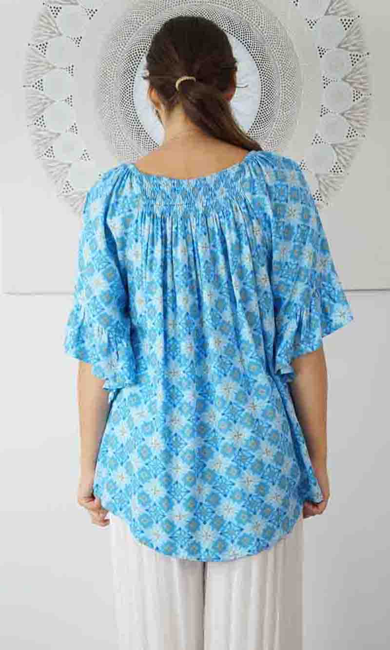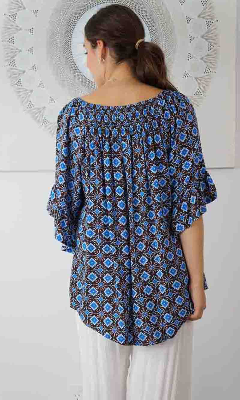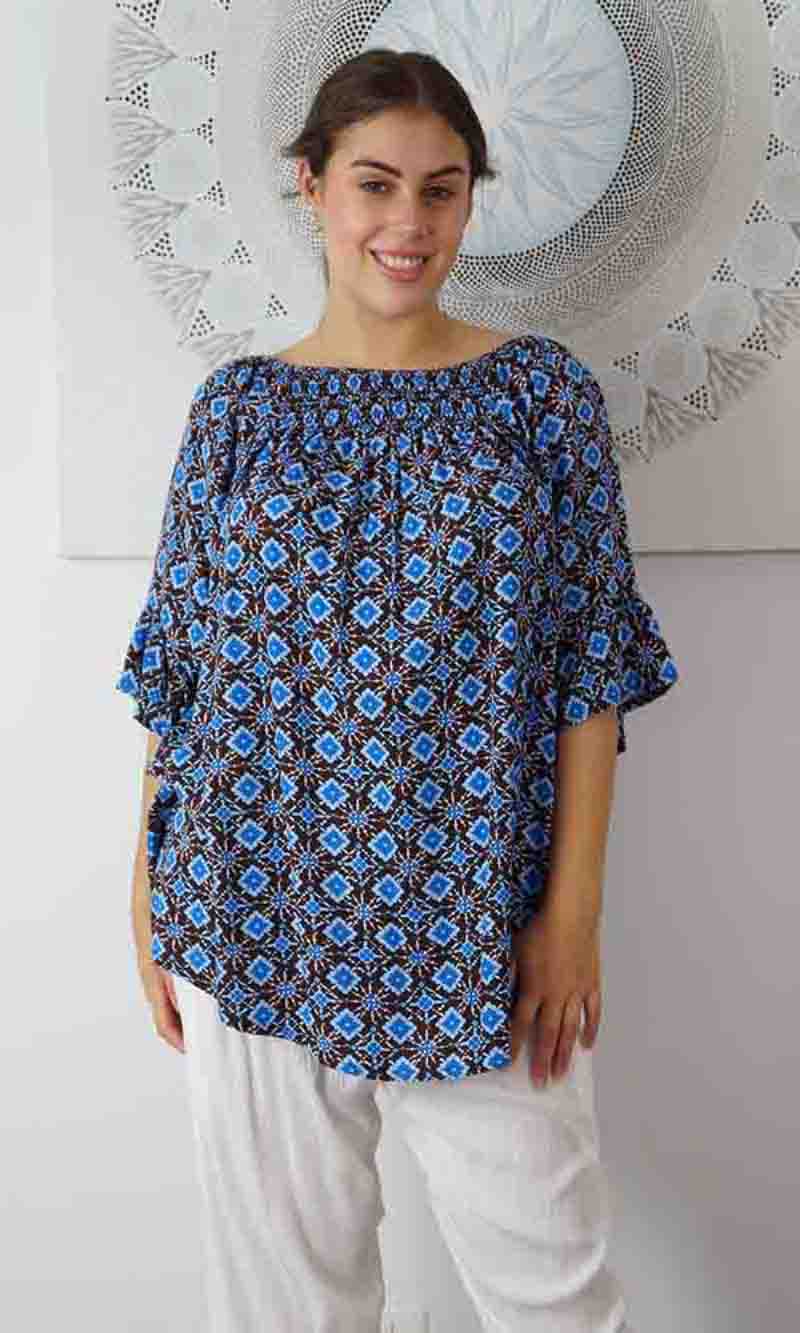 With an option to wear on or off the shoulders as the neckline is elasticated & a extra panel of shirring front and back for more of a comfortable fit.  The 1/2 bell sleeve adds a little bit of flair to the style.