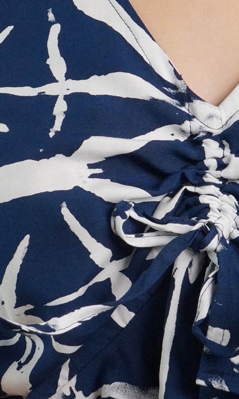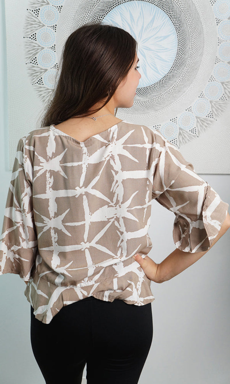 Mid sleeve Top with ruched front ties to wear up or down to suit your mood. Available in 3 sizes.