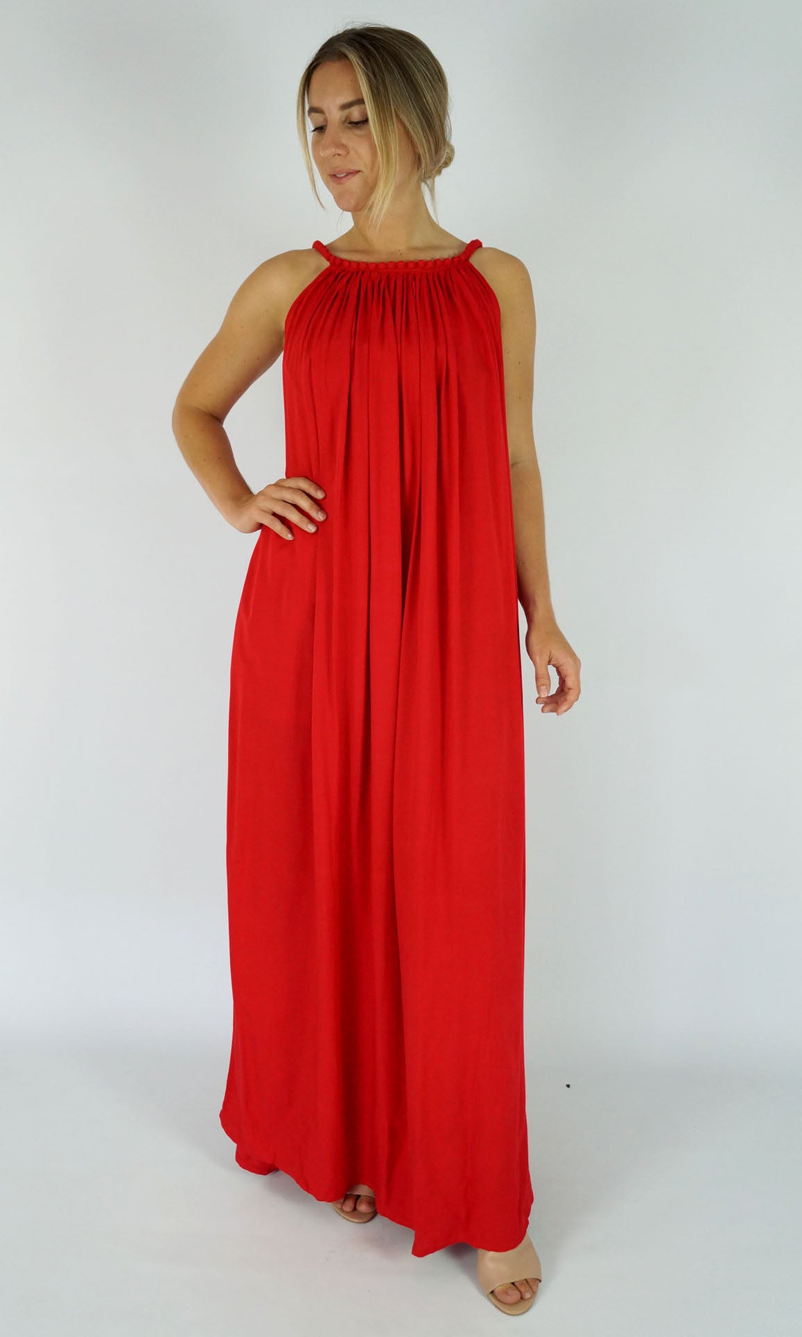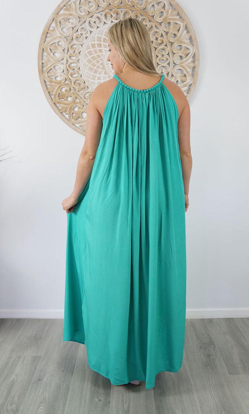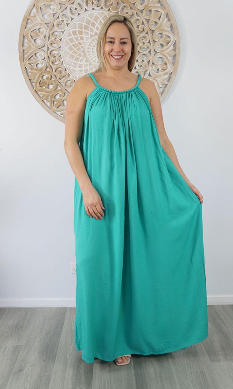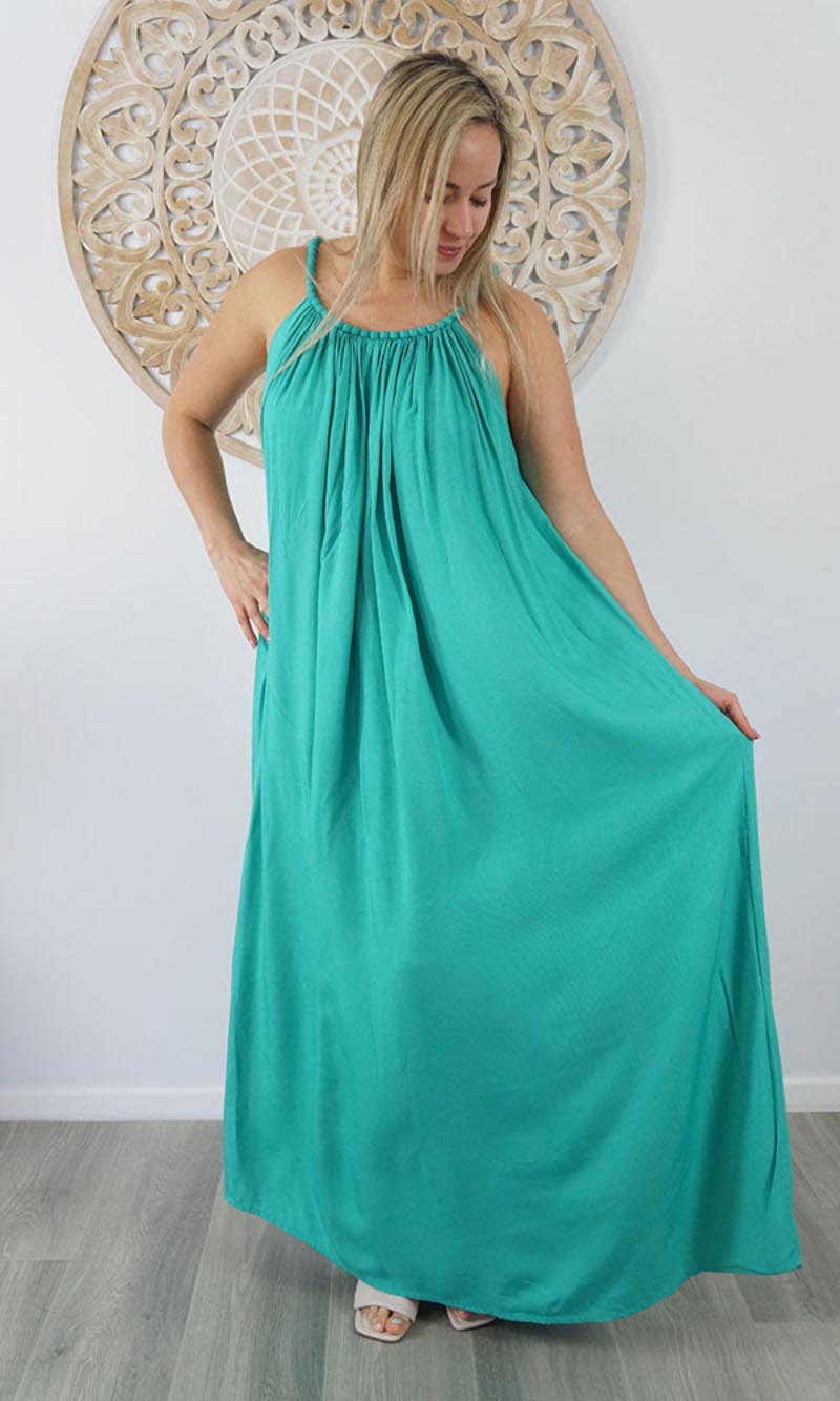 A great summers flowing dress with a bobble neckline. Many colours. Also available in knee length.