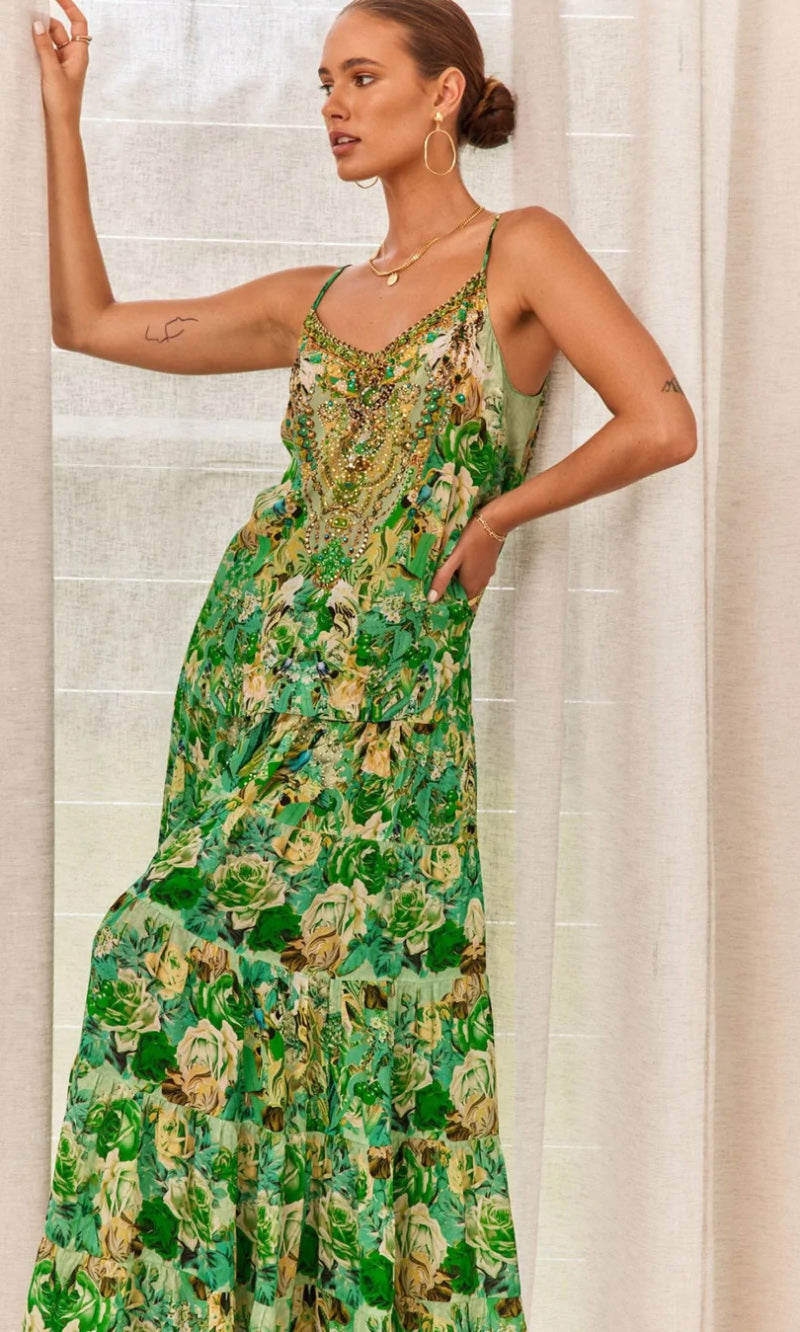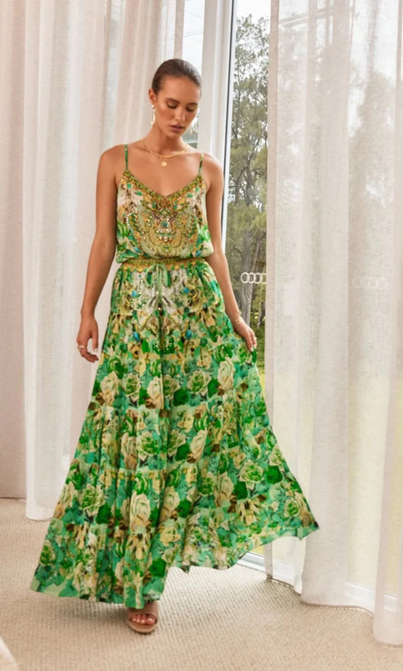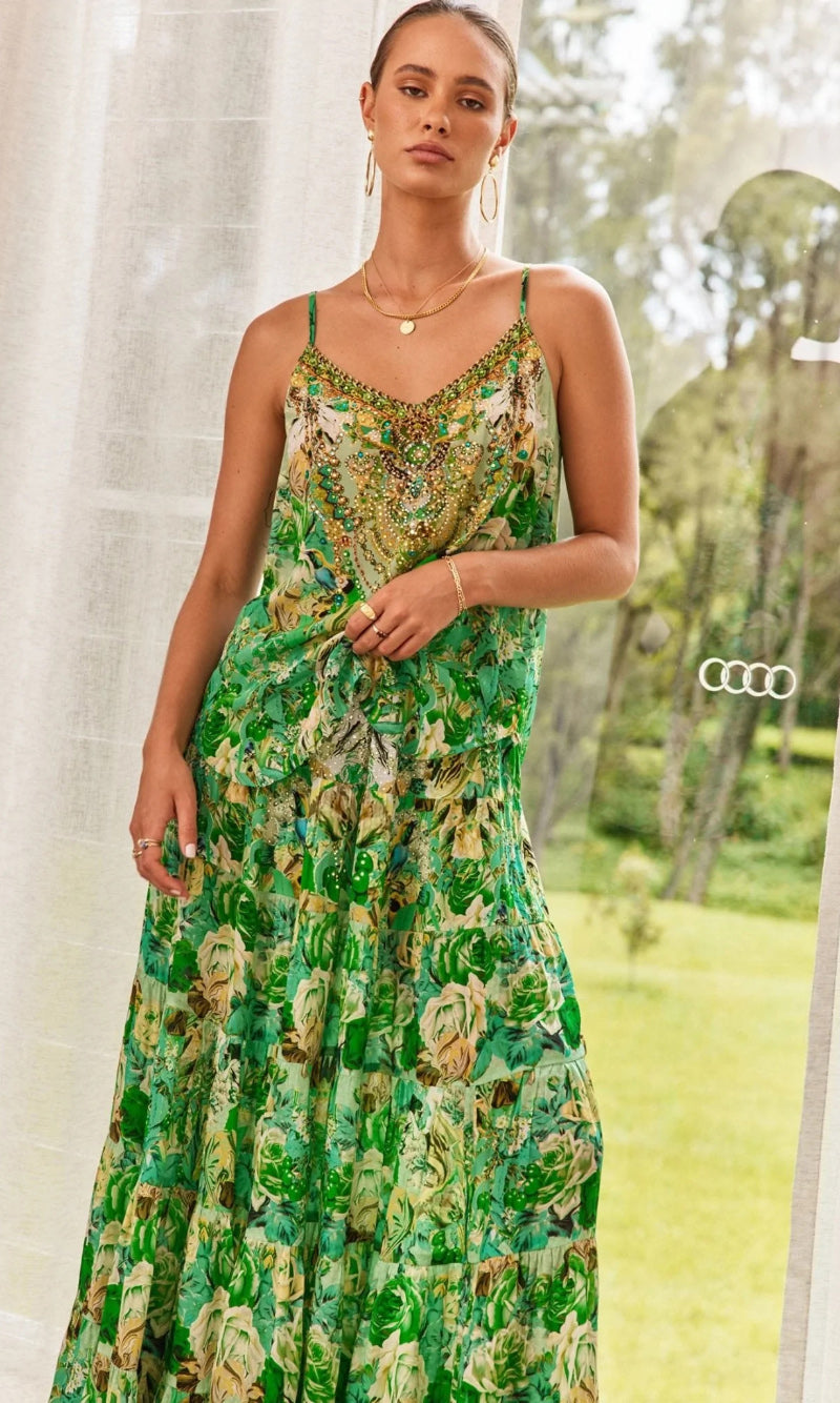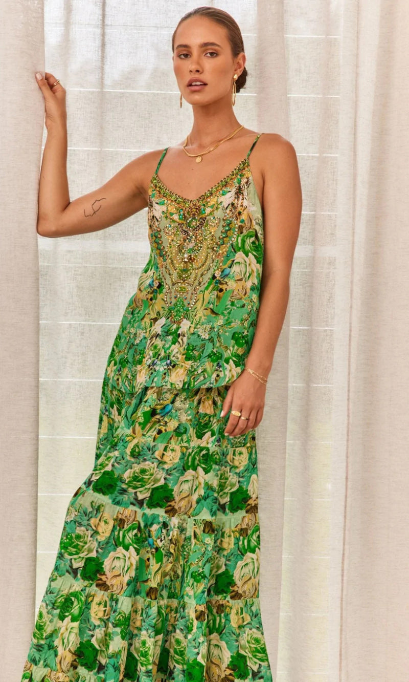 The effortless Cami Top has been recreated in signature Czarina style to be an instant update and lift to your wardrobe. The Green Goddess Cami Top features a flattering v-neckline and with thin straps. The soft mix of pastel greens create warmth on the wearer, and with the twist of signature Czarina detailed printing, makes for timeless luxury.