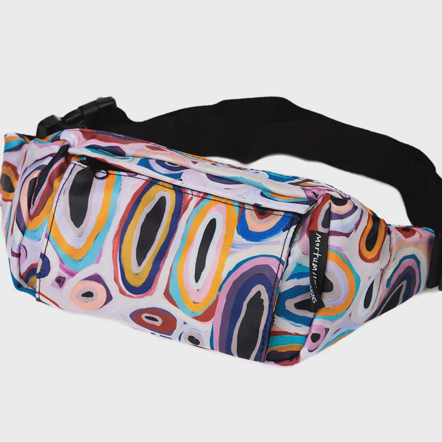 For when you're on the move and don't want to overload your pockets. Don't leave those essentials behind! Grab your waist bag, bum bag, or hip pack and head out in style! Featuring artwork, reproduced under license by Gladys Kuru Bidu, courtesy Martumili Artists.