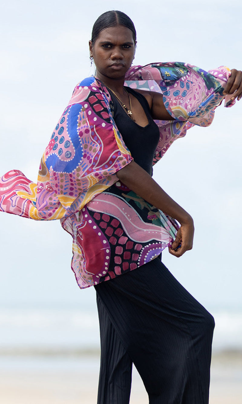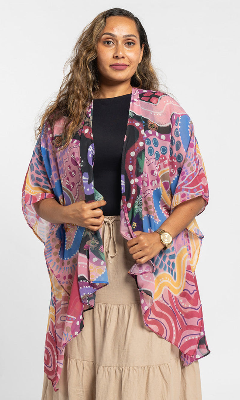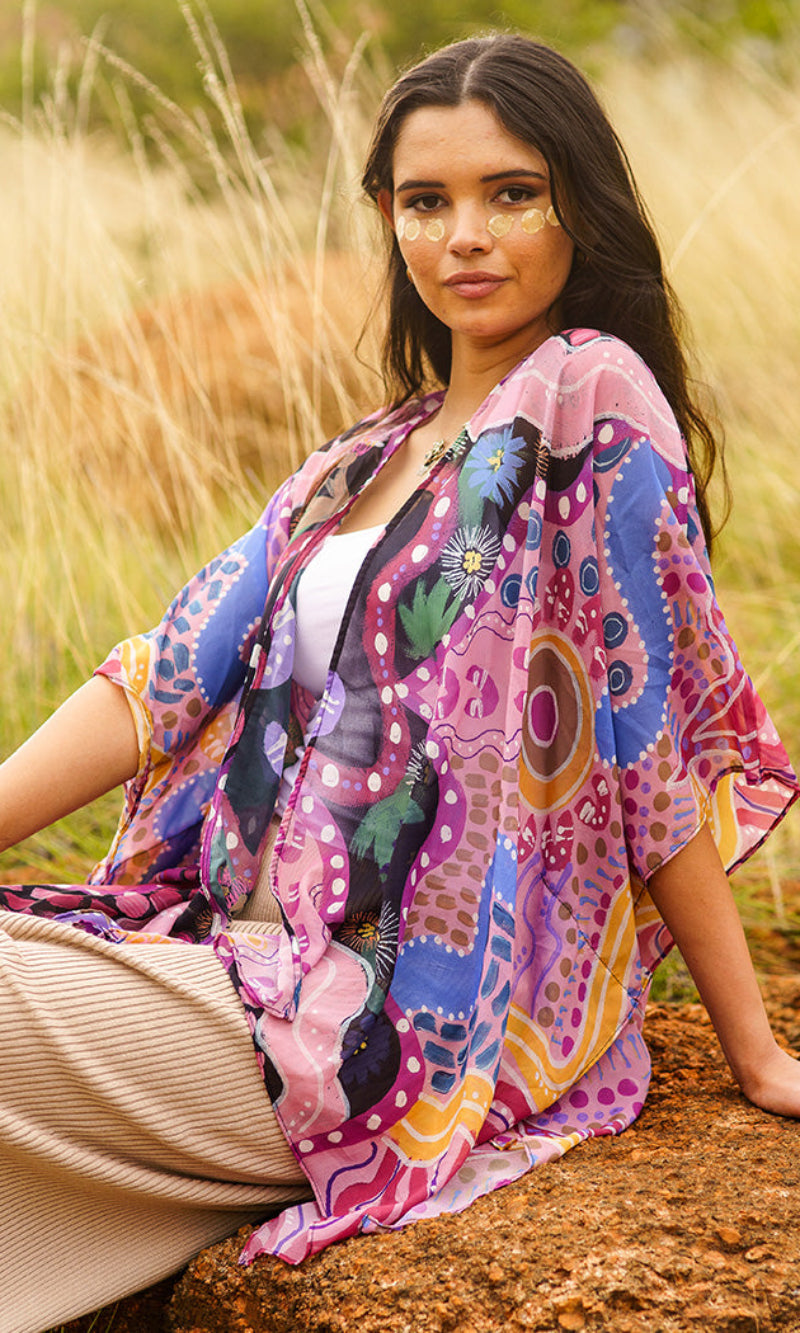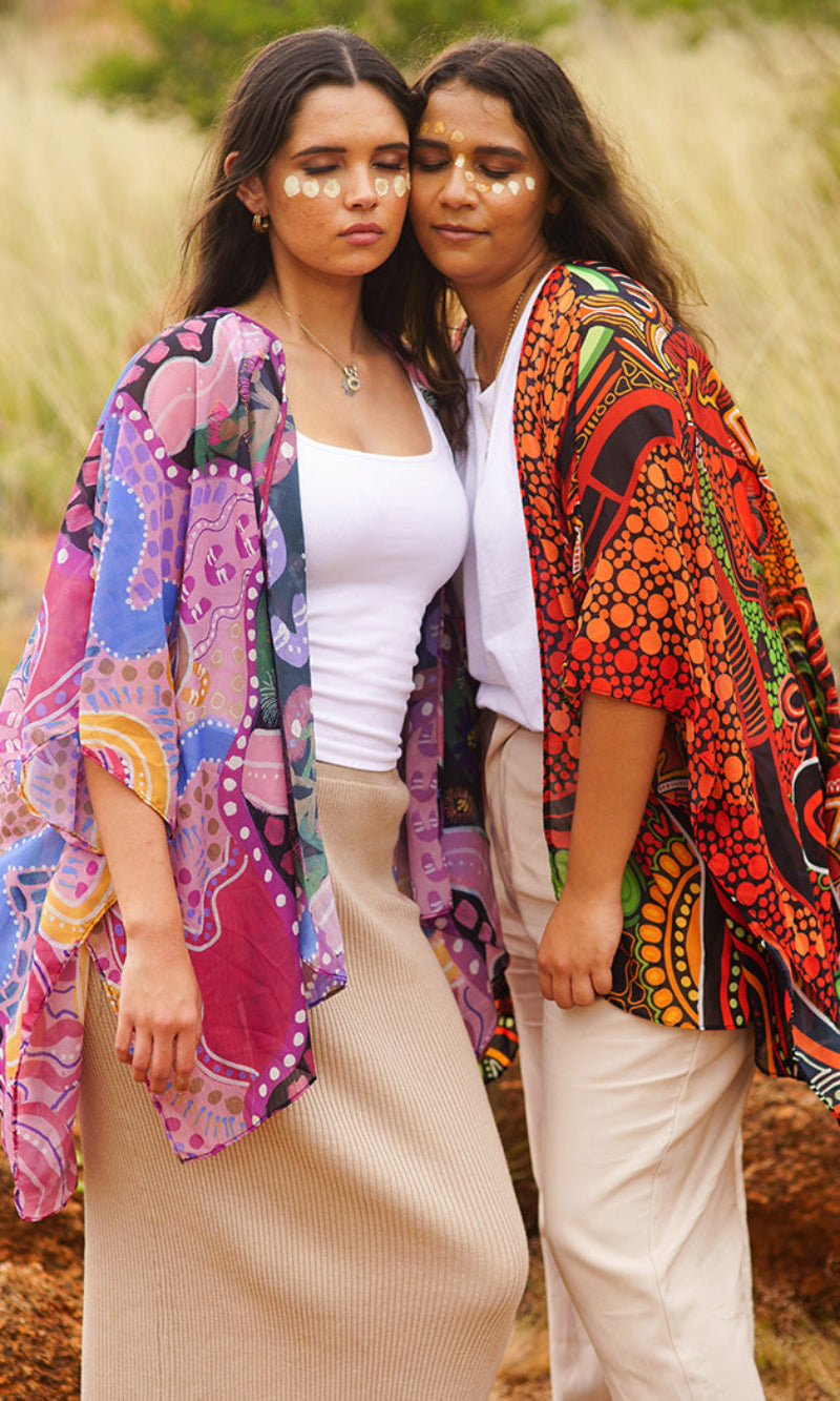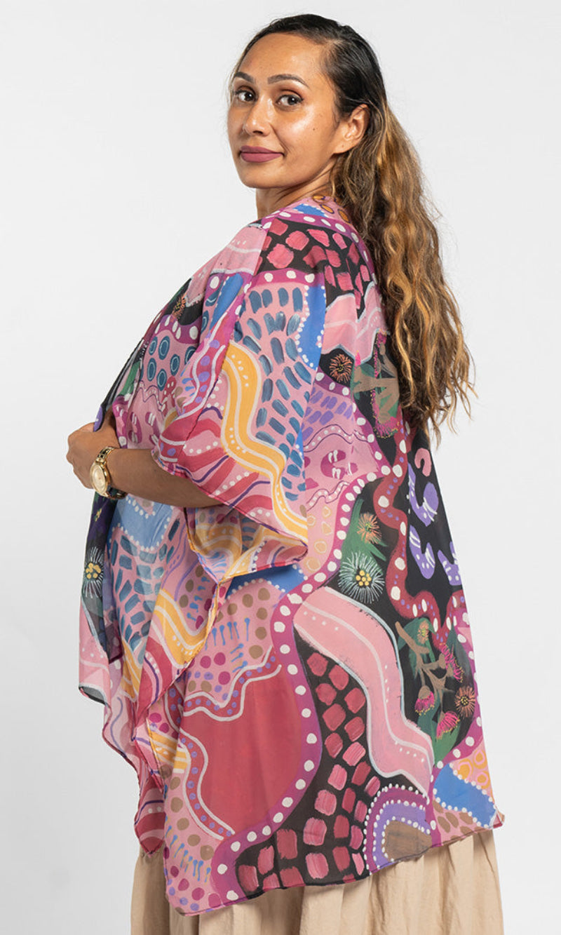 'Guiding Light' is a painting about strength, perseverance and a tribute to the strong community Caitlyn is lucky to be surrounded by. This year's NAIDOC theme of, 'Keep the Fire Burning, Blak, Loud and Proud' is represented throughout this painting. There are four campsites across this painting that each represent a community/place Caity feels or has felt immense strength and pride from. All of these places are connected through a journey line as they are all elements of Caitlyn's life that are connected to each other. Broken Hill and Adelaide are represented at the top and bottom of the canvas. She feels the strength and presence of Broken Hill every time she is with her father and is fortunate and proud to live on Kaurna country. The right campsite represents a previous school community she was a part of and pays respect to the deep connections she built and still has with many of the Aboriginal students and families there. The left campsite is representative of the community Caitlyn has yet to build and is a symbol of what she wants to create with her psychology career in the future. The little person facing Caitlyn, represents her son, Dusty. Within the centre of the painting, you can see four people represented and one star. Caitlyn wanted to pay tribute to three special mentors in her life, who have taught her to always be proud, strong and to remember that our fire was never put out. One of these people is represented through a star as they have passed away but their influence and guidance will always be felt by Caitlyn throughout her life. The river is seen throughout this painting and represents the Barka and the strength and connection Caitlyn feels to it. This painting is a reminder that after everything we have been through, the light and spark within us still shines bright. Caitlyn has been fortunate to learn and grow from leaders who show her their light and fire in everything they do. The fire within us can never put out, we are forever 'Blak, Loud and Proud.'