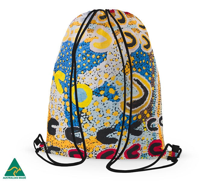 Step out in style with these great new Australian Made cotton drawstring bags featuring artwork by Rosie Lala from Yarliyil Art Centre.
