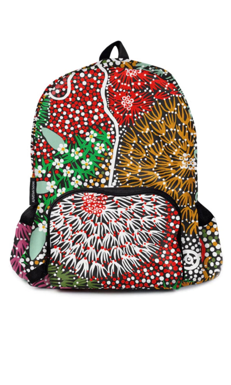 Fold up backpack features Artwork by Coral Hayes Pananka.