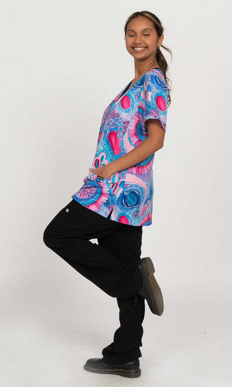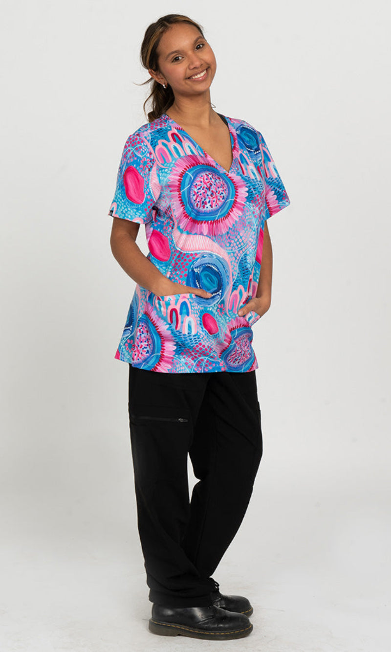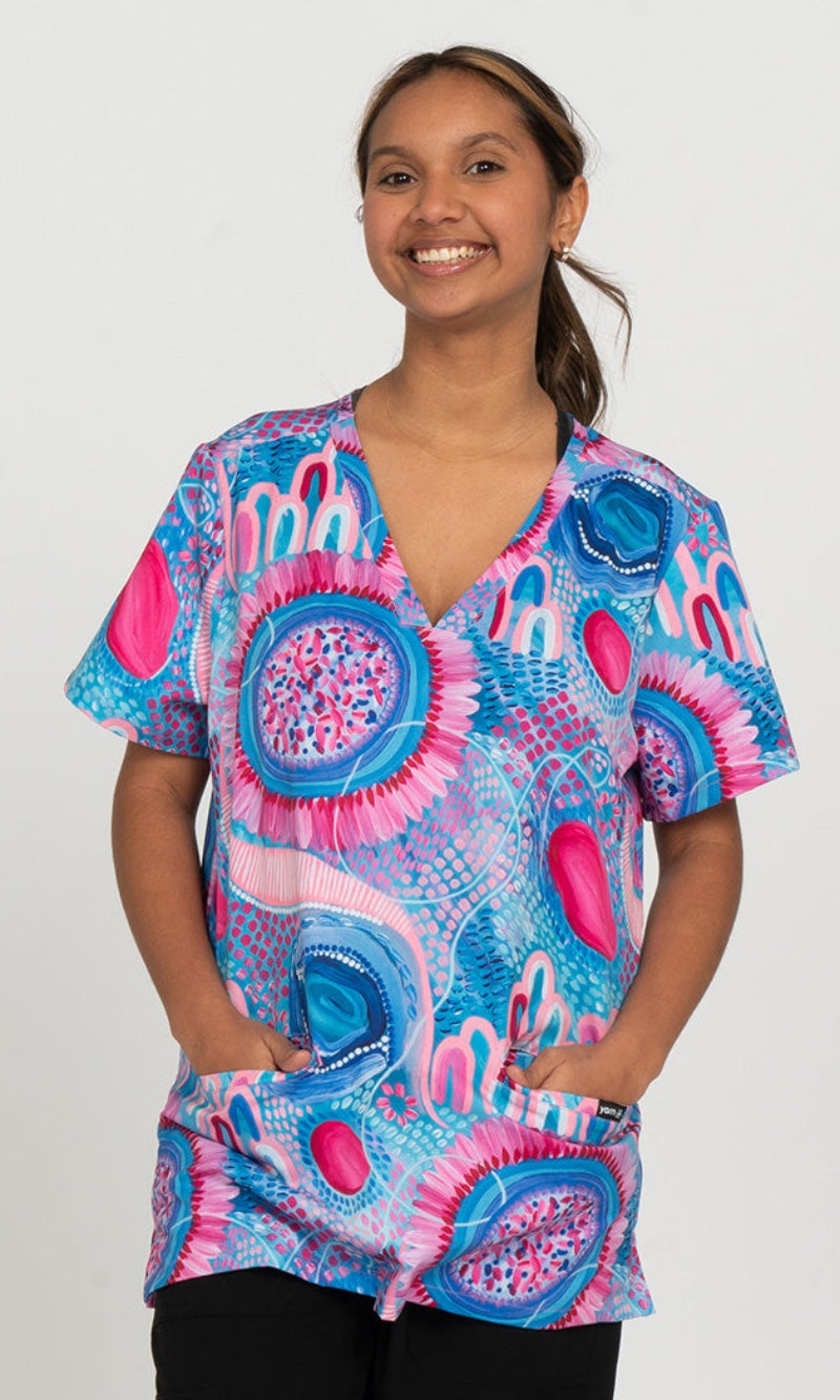 Brighten up long days on your feet caring for those who need it most! Our scrubs feature First Nations artwork printed onto excellent quality workwear that is both practical and beautiful.