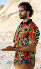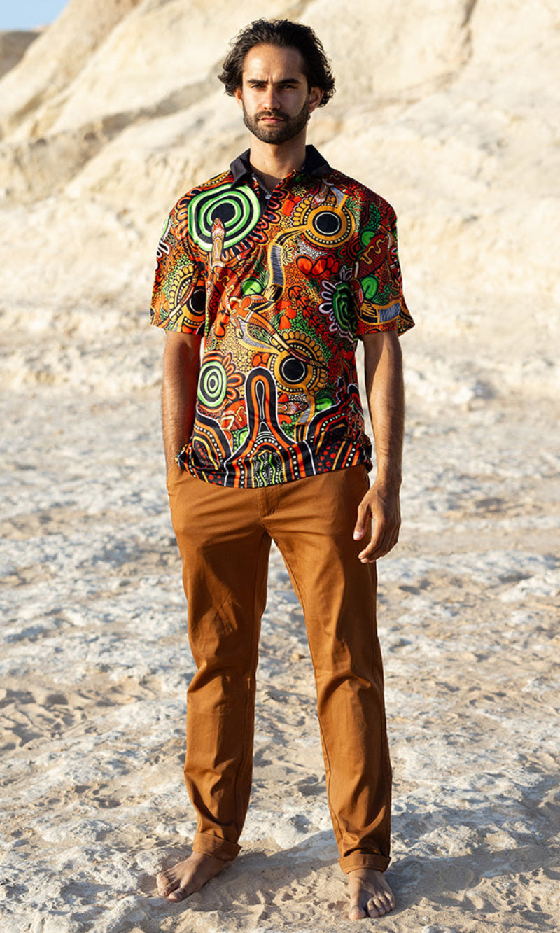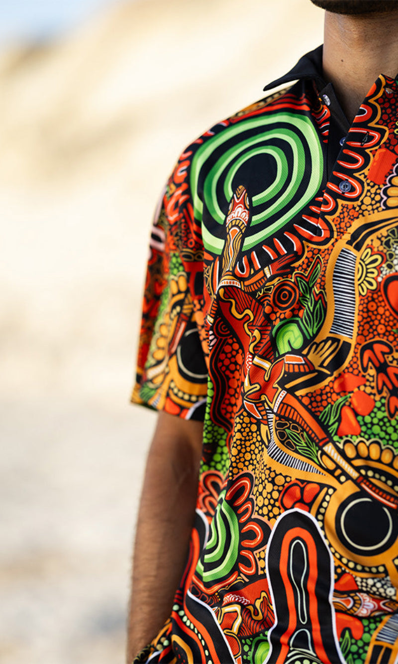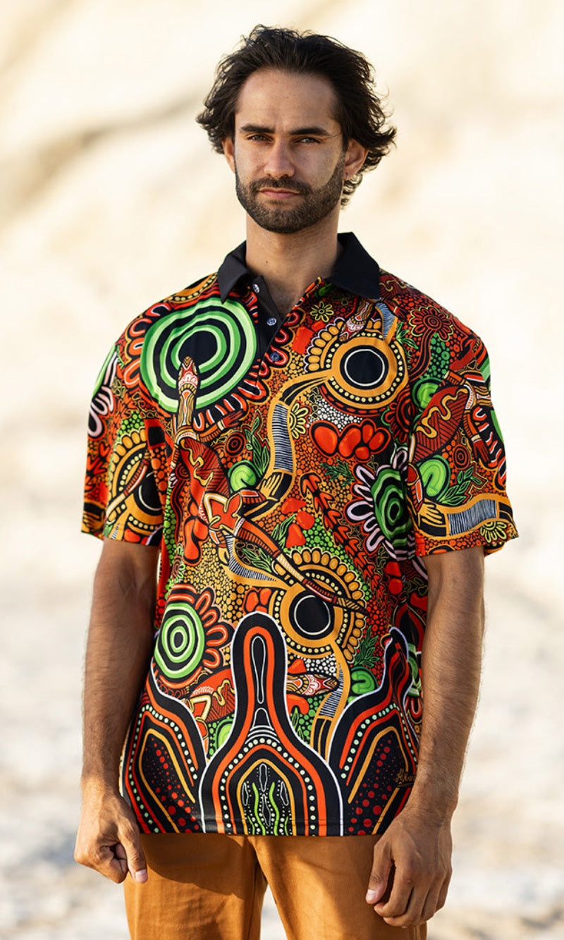Our polos provide strong sun protection and a stylish and comfortable look that can be worn anywhere. A true wardrobe essential available in fitted, unisex and childrens styles and featuring vibrant First Nations artwork created especially for the 2024 theme.