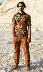 This artwork was originally created in response to the theme of Keep the Fire Burning! Blak, Loud and Proud and is appropriate for anyone to wear. The artist's unique vision is a testament to the diversity of ways we celebrate Culture, Identity and Knowledge.