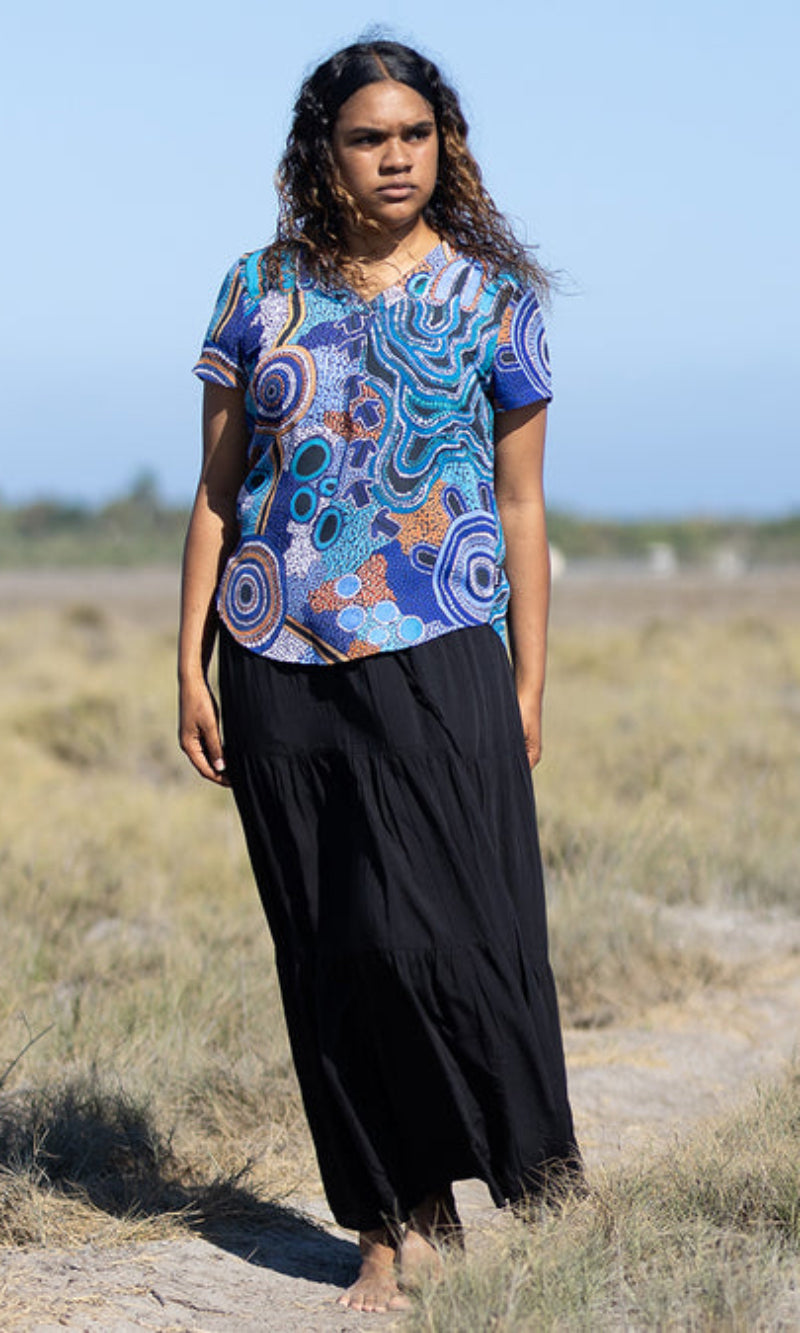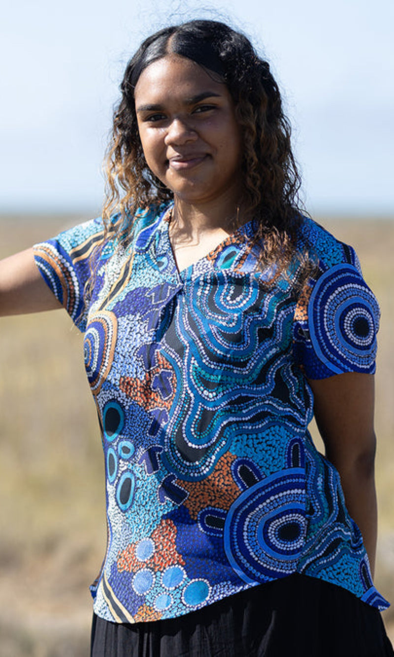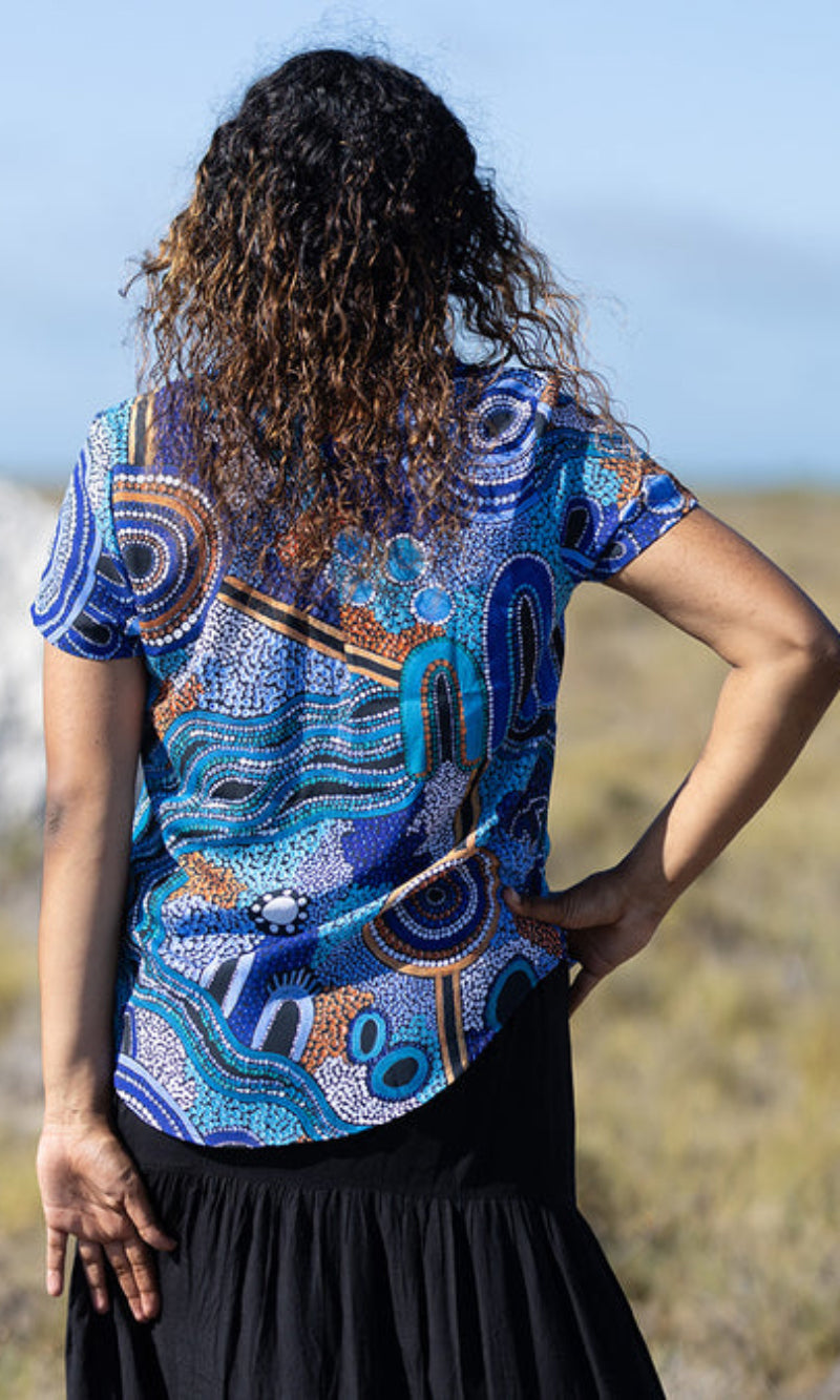Jessica's art is inspired by family, Country, and Culture in the Yued region in Western Australia. In her debut polo and fashion range she celebrates and honours her heritage through vibrant pieces that each tell a distinct yet connected story.