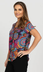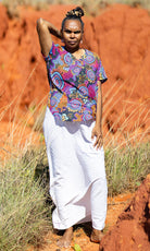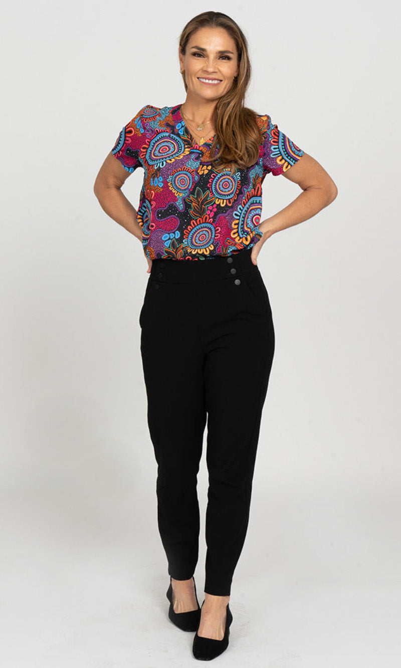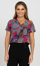 This elegant and vibrant short sleeve blouse is a unique take on the everyday office look. It combines smart style and fit with the bright designs of Merindah-Gunyah.