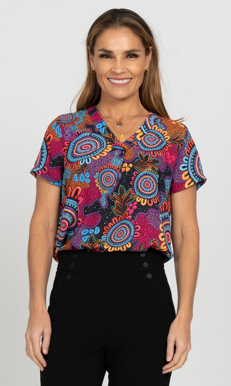 Aboriginal Art Women's V Neck Blouse Short Sleeve Celebration