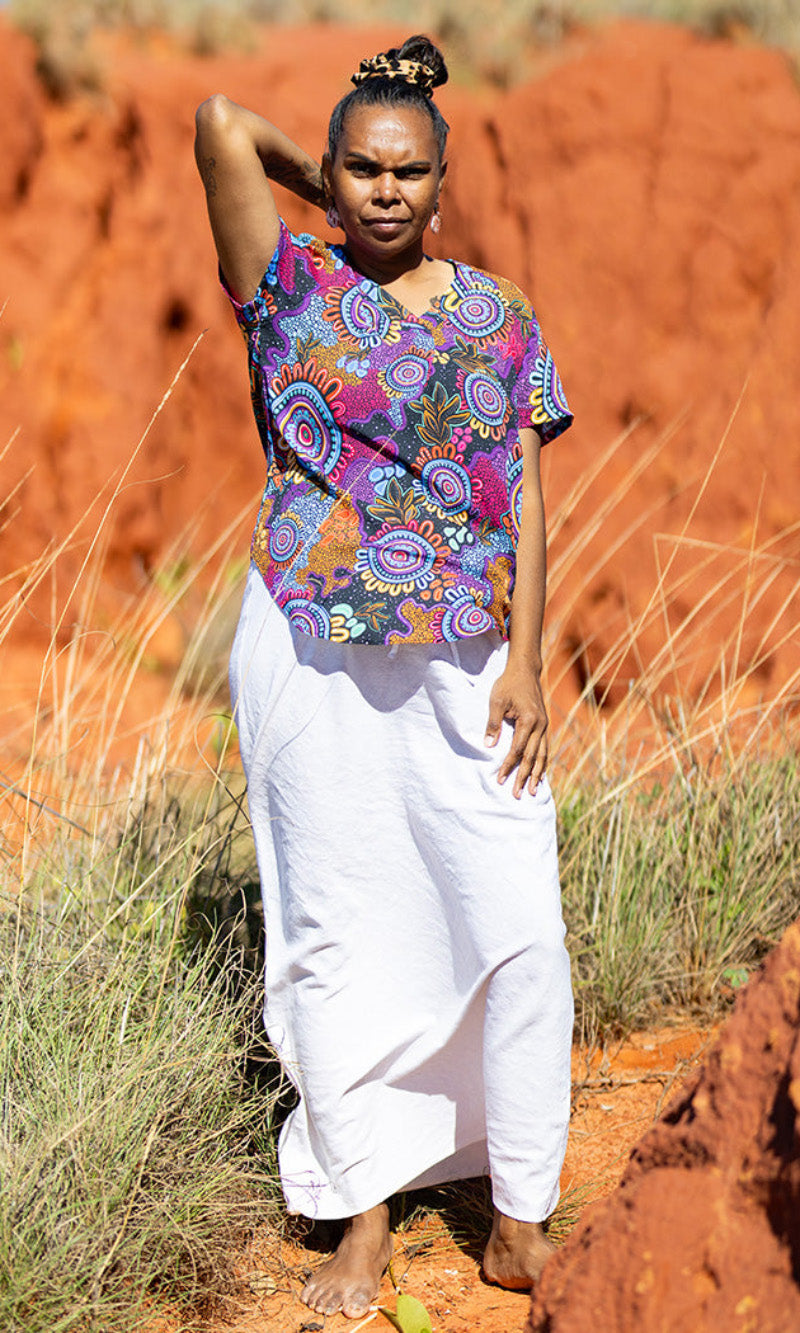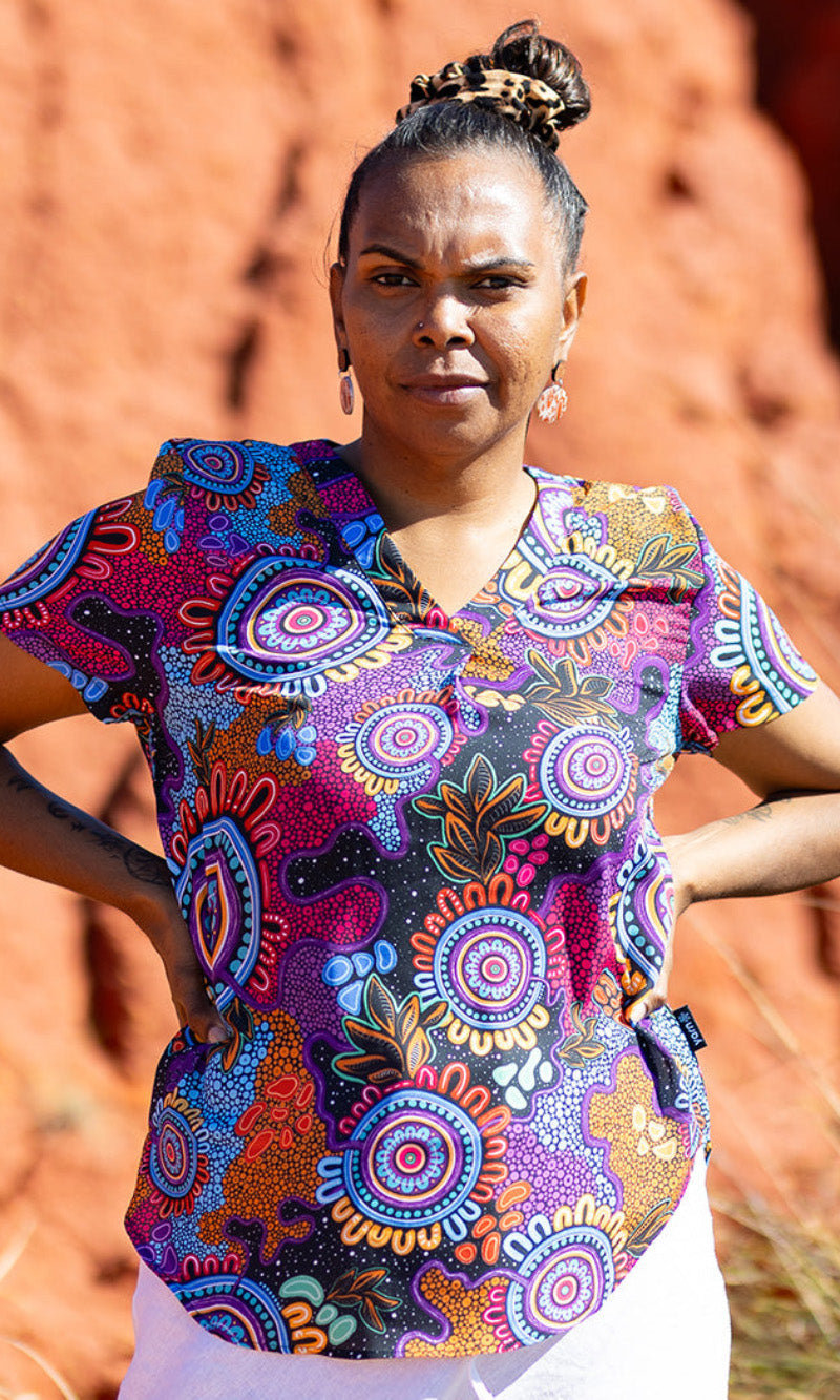 "This design represents people from all nations coming together to celebrate our beautiful cultures. With all our Elders surrounded watching the next generation grow with strong identities while they practice culture, dance, language, art and story telling." -Alkina