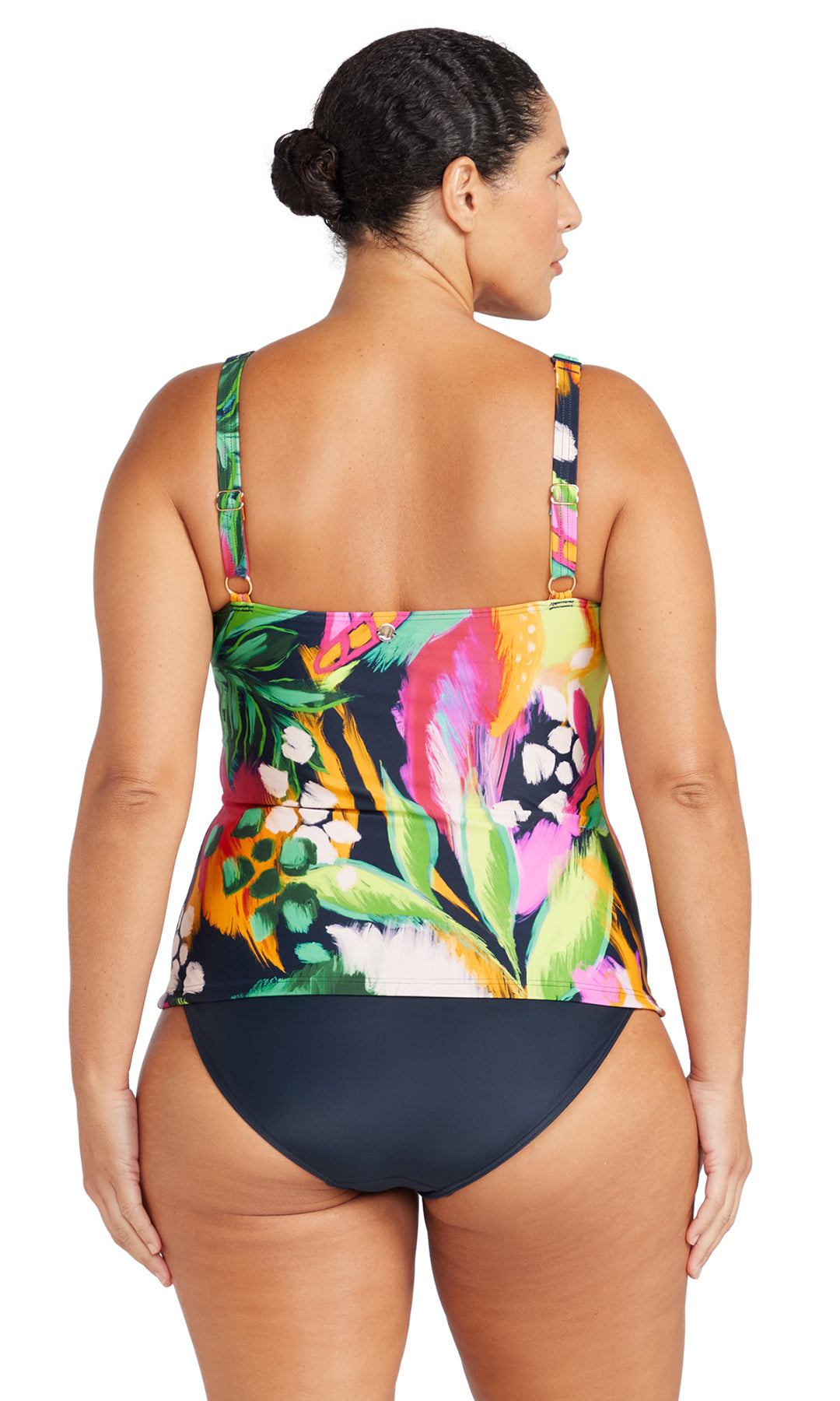 - Long line tankini top - Our curve fit and plus size tankini top is designed to be fitted to the body. This features a long line length to avoid any riding up while swimming or lounging around the pool. Designed to look like you are wearing a one piece when paired back with the matching swim pant.