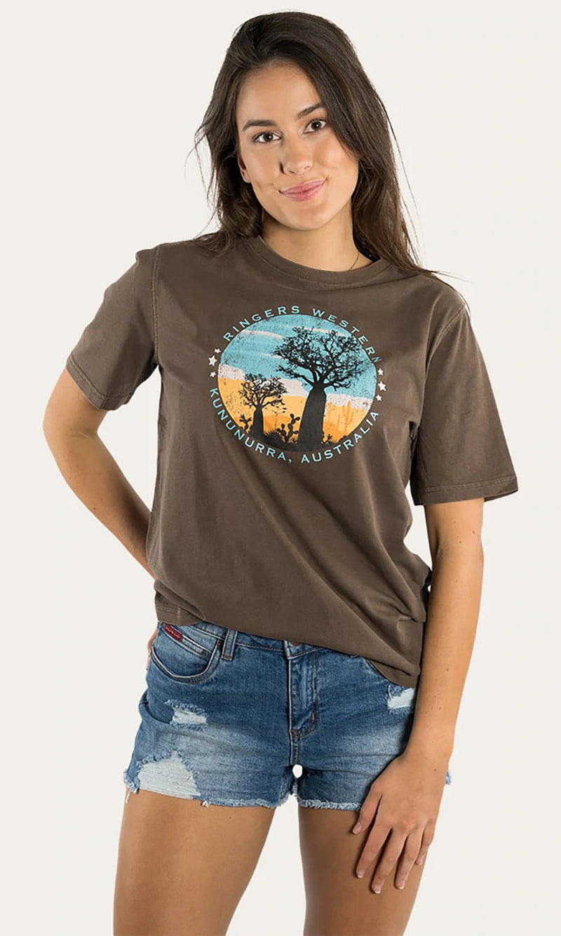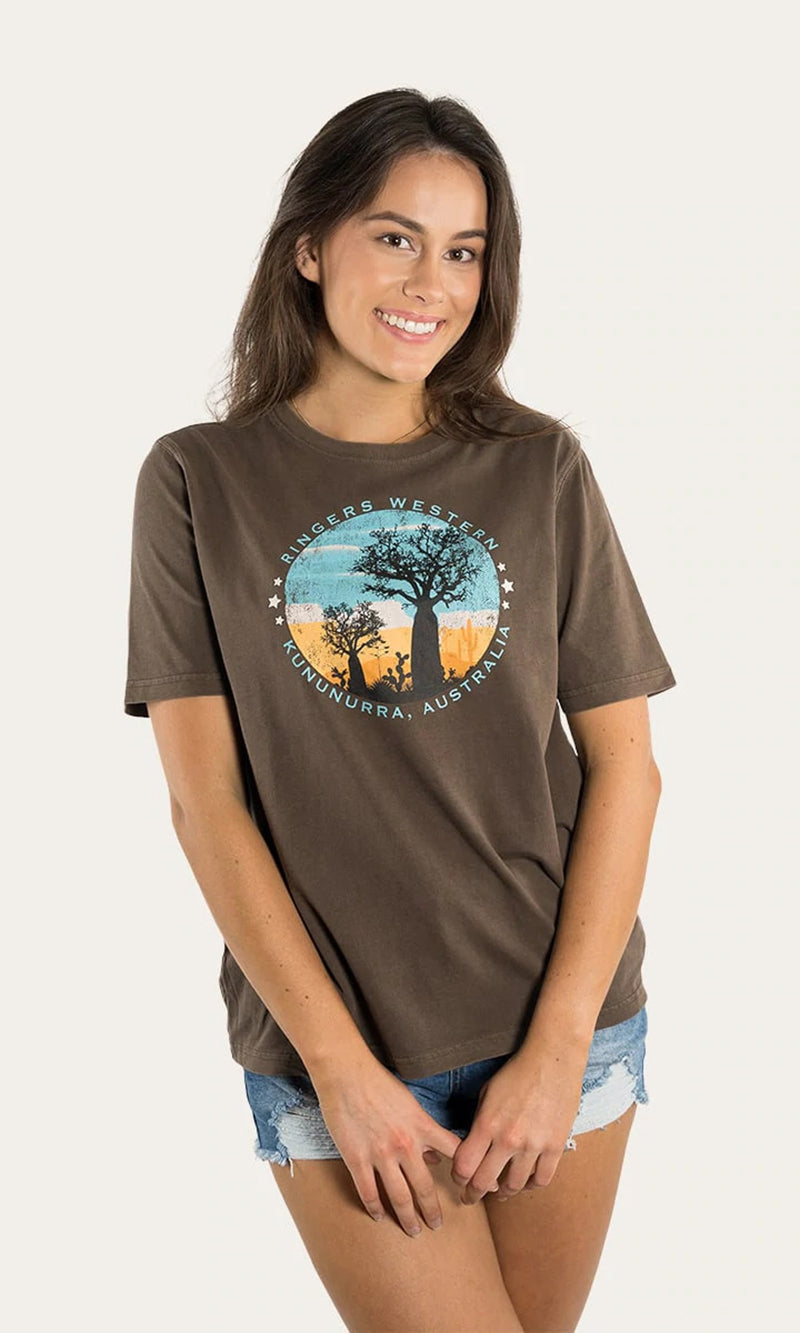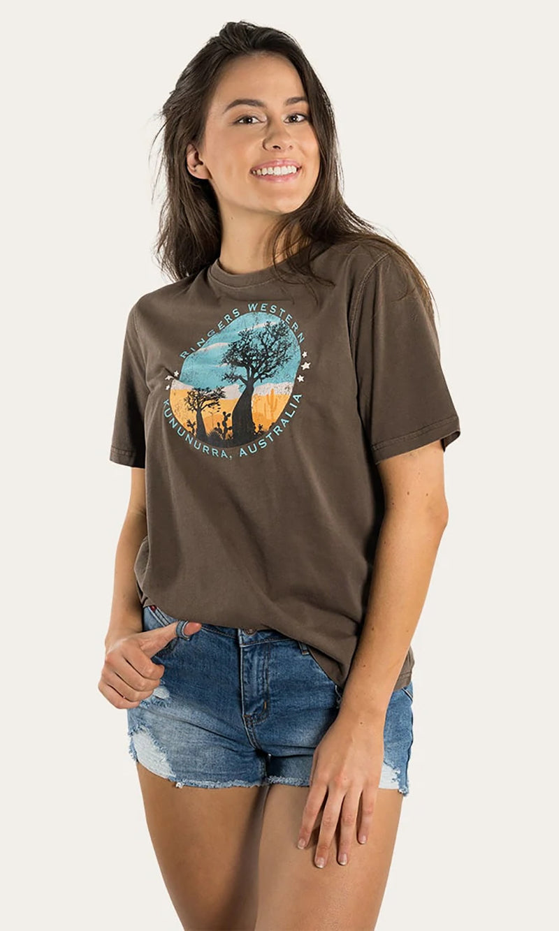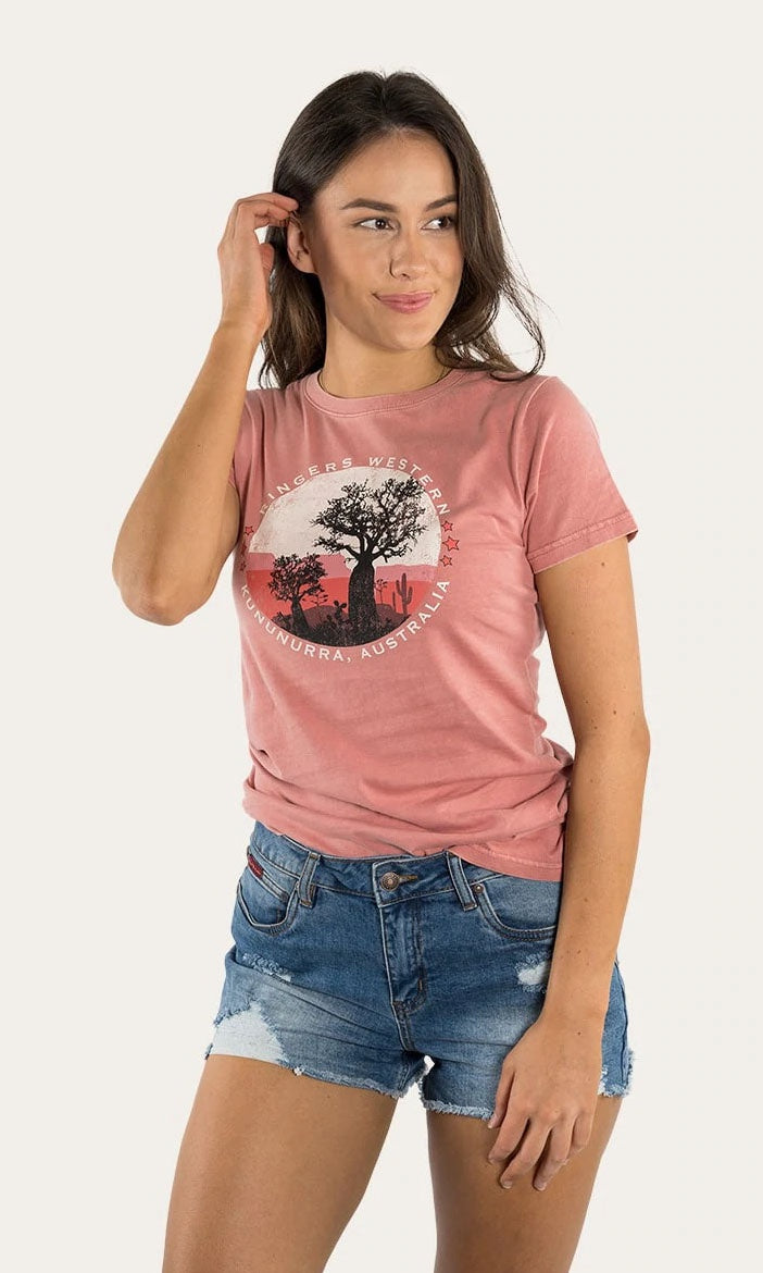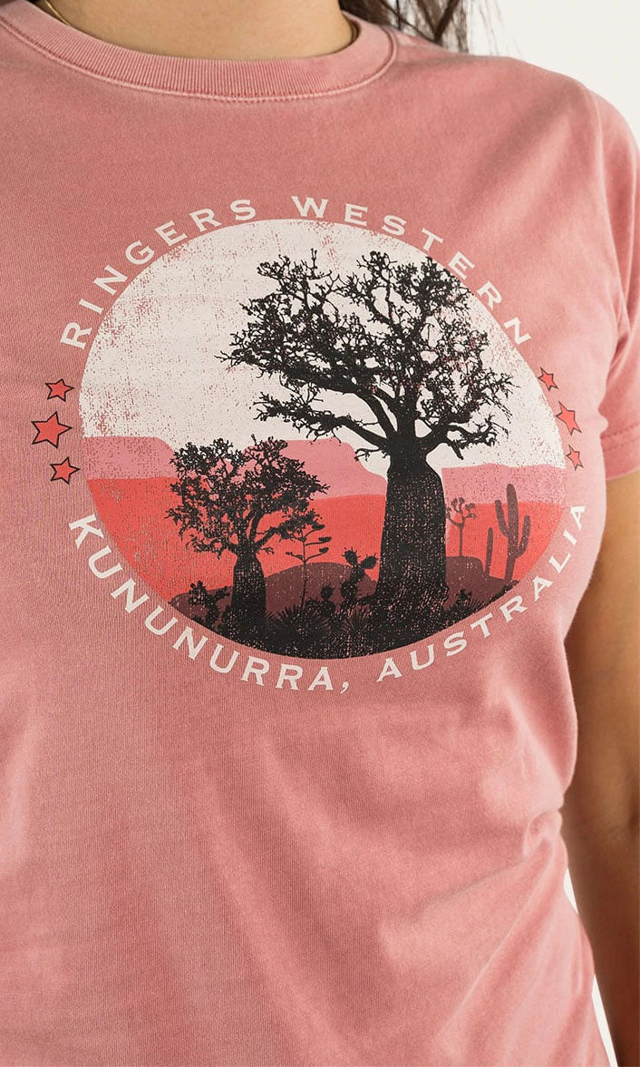 The RW Summer T-Shirt collection will have your Summer wardrobe sorted. The Boab Womens Classic Fit T-Shirt is available in Dusty Rose. It features a Circular Boab Tree Art Print surrounded by Ringers Western, Kunununurra Australia lettering.
