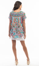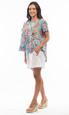 The Orientique frill sleeve top is a round neck top with a scalloped hemline and elbow length sleeve. It has placket and buttons below the yoke down the back.