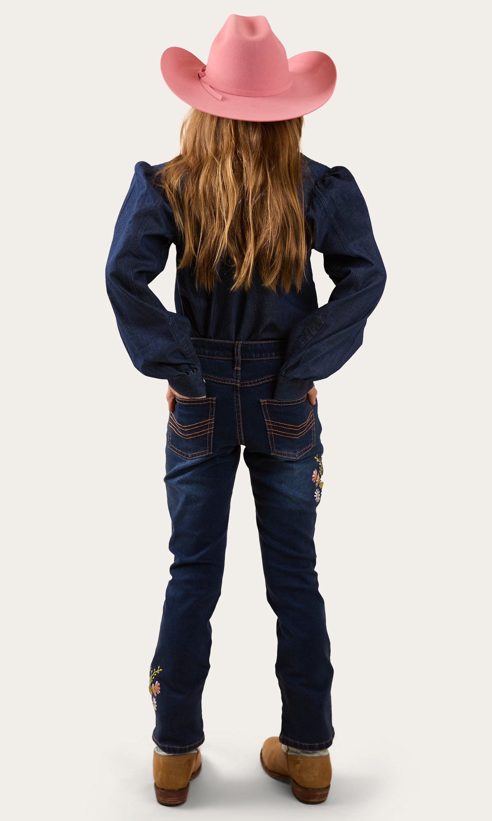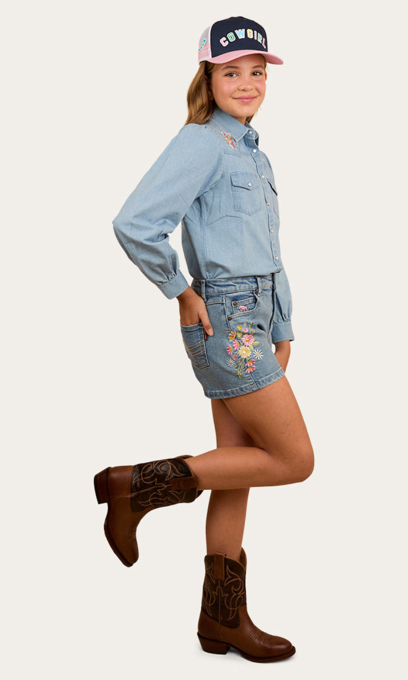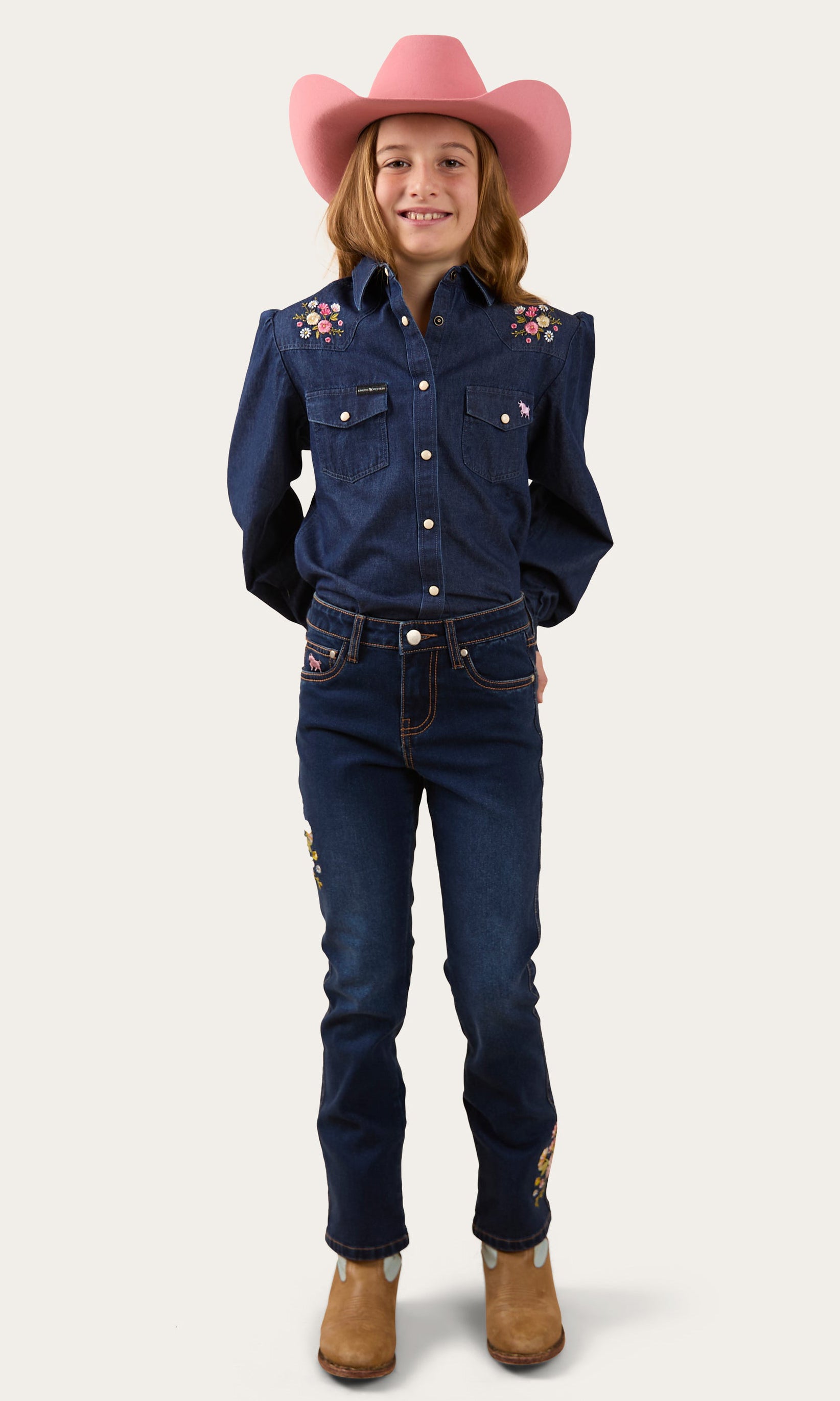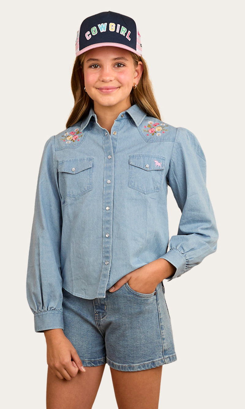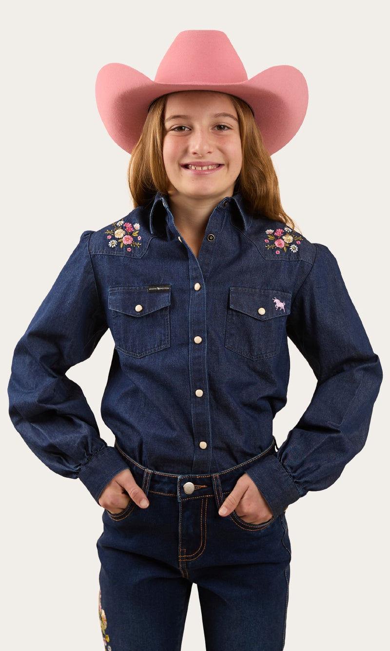 The Dahlia is a long sleeve design, featuring charming floral detailing on the front yoke panels. Elegant pearl snap buttons complement this beautiful western shirt and make buttoning up a breeze. Double chest pockets with a snap button are a handy addition - a perfect place for storing little treasures. Created from 100% cotton denim, the Dahlia is stylish, versatile and comfortable.