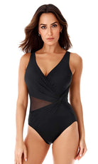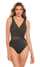 Get instant hourglass curves in this tummy-flattering one-piece swimsuit from Miraclesuit's Illusionists collection, which combines shaping fabric with clever draping to flatter your figure. The Miratex fabric delivers powerful all-over slimming in a single layer, but it's the triangular mesh insert and crossover design that really shine when it comes to visual shaping - culminating in a chic, twisted knot design at one side, this asymmetric swimsuit provides maximum definition to your waistline for a beautifully curvy look.