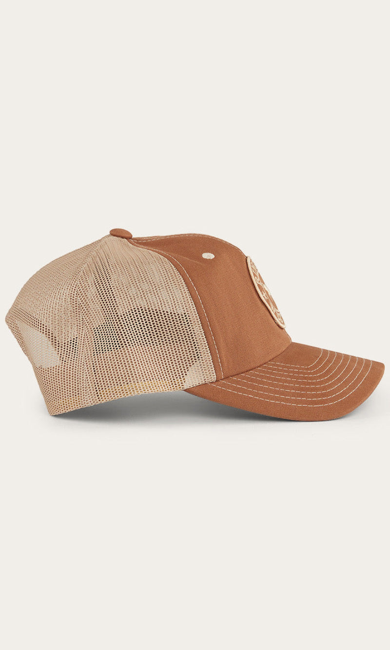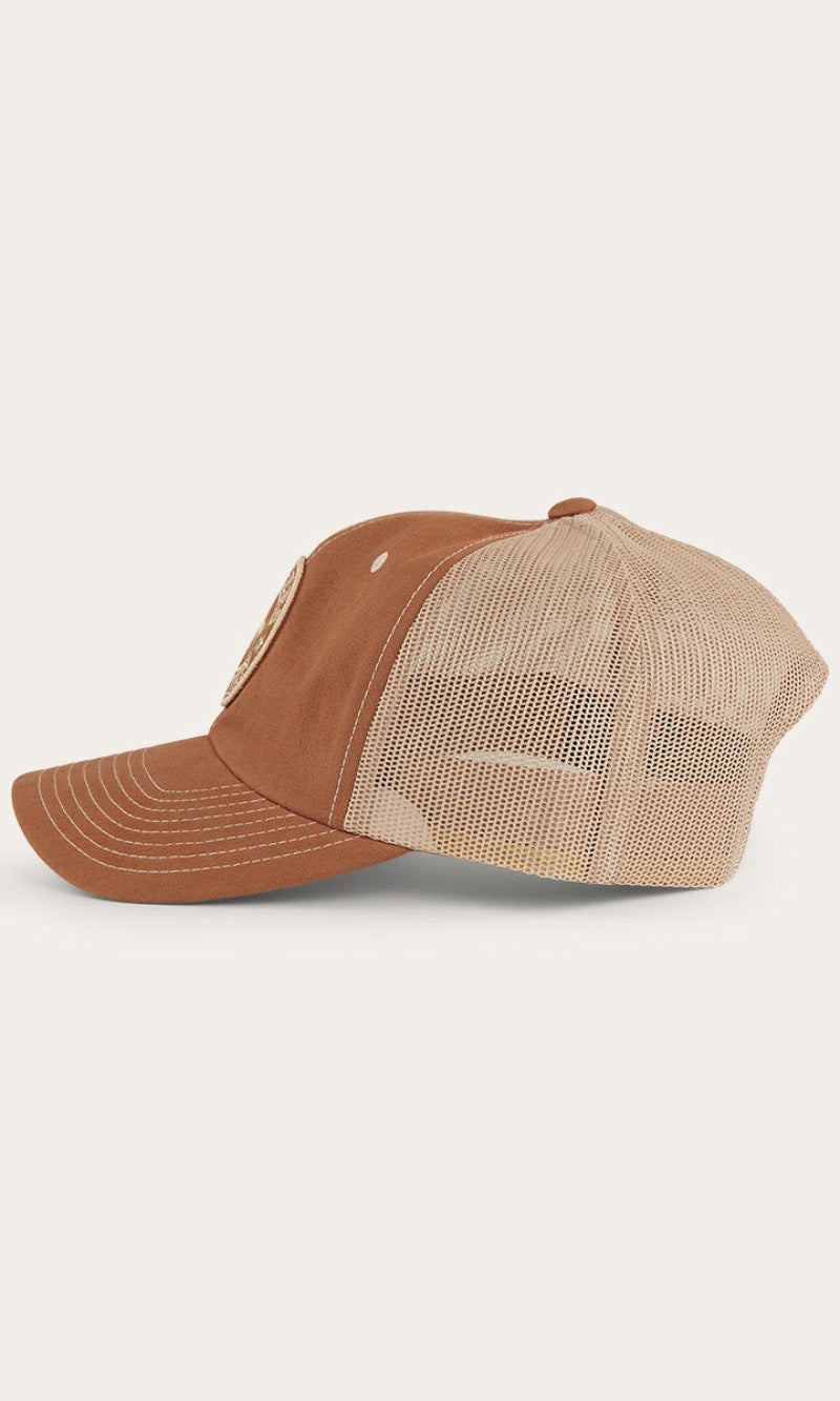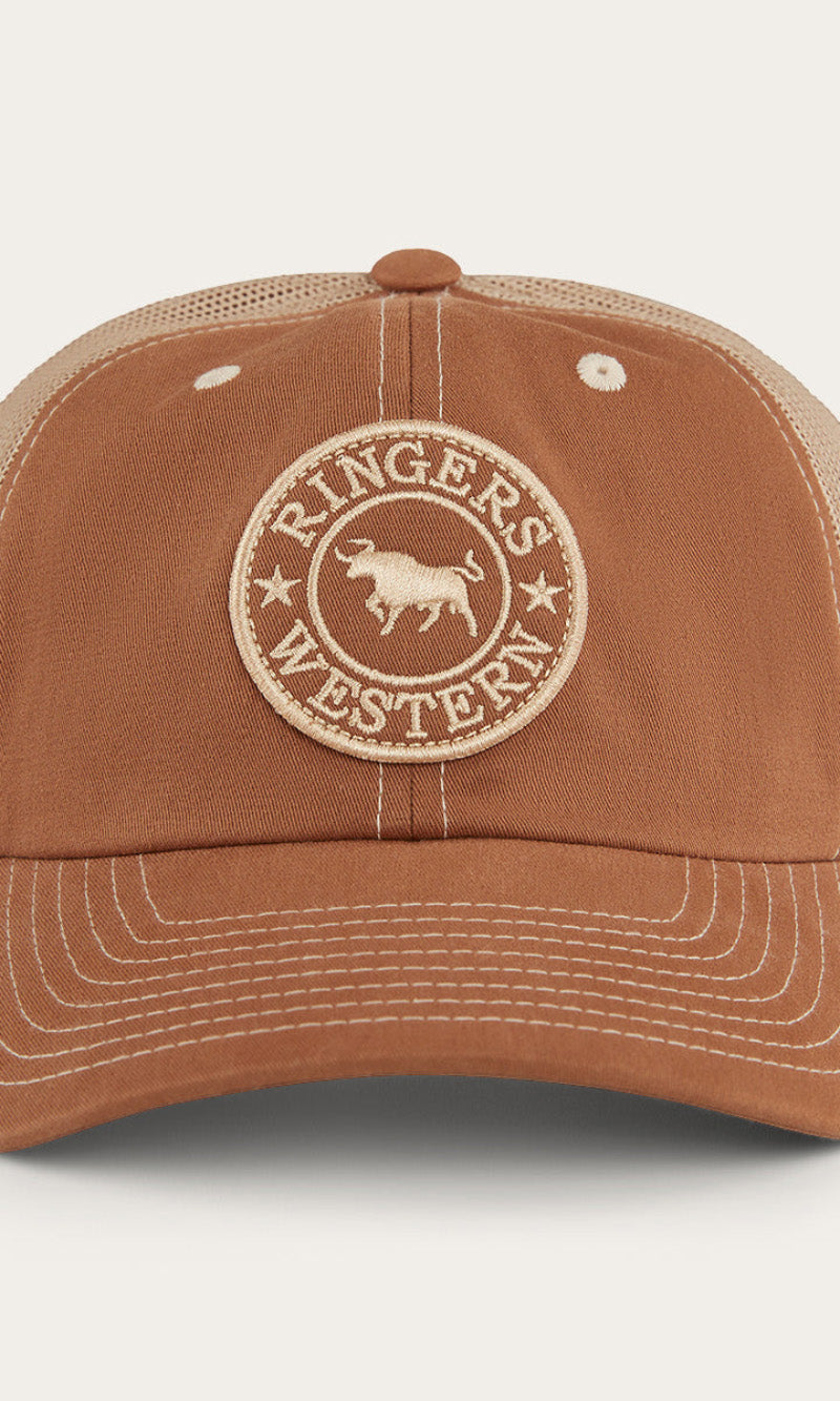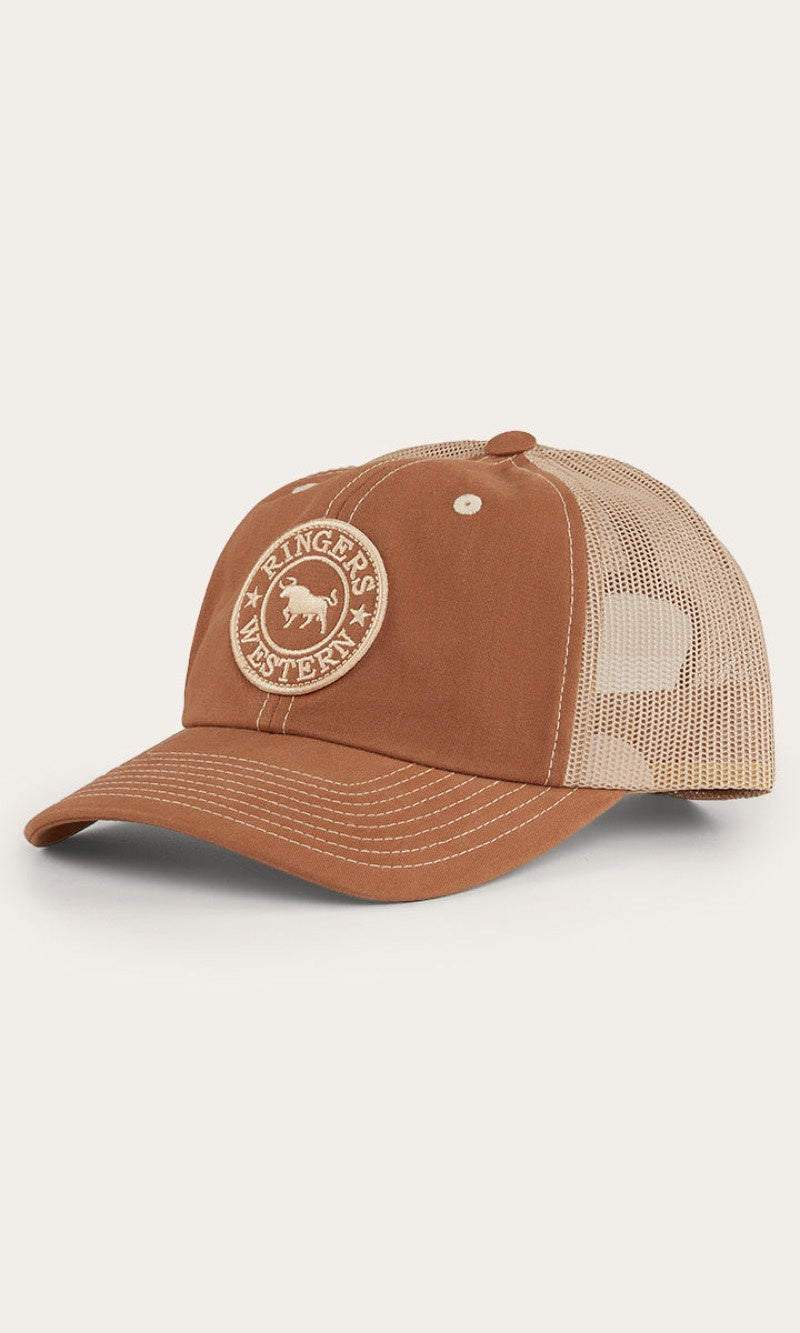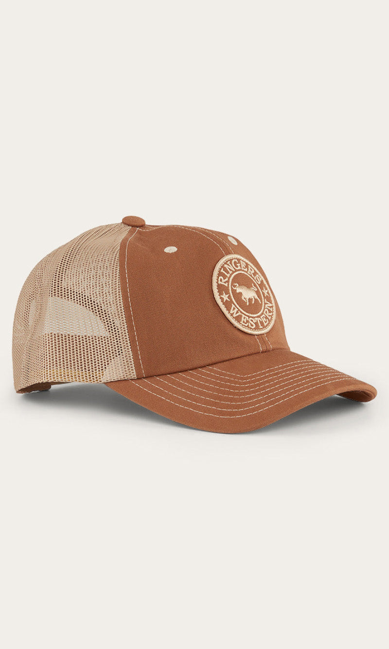 The Lakelands cap is an unstructured, six-panel design made from recycled materials. This design features a cotton twill front panel, a lightweight, breathable mesh back panel with a snap back closure for an adjustable fit. A Ringers Western embroidered logo patch is featured on the front panel, with a small branded tag on the back.