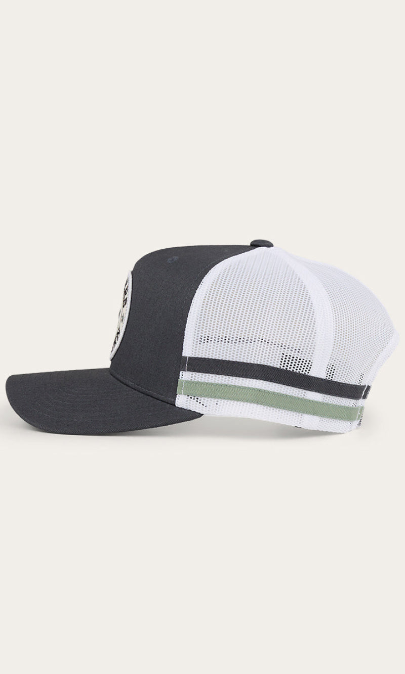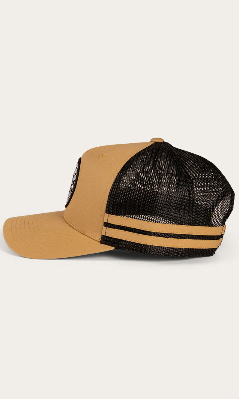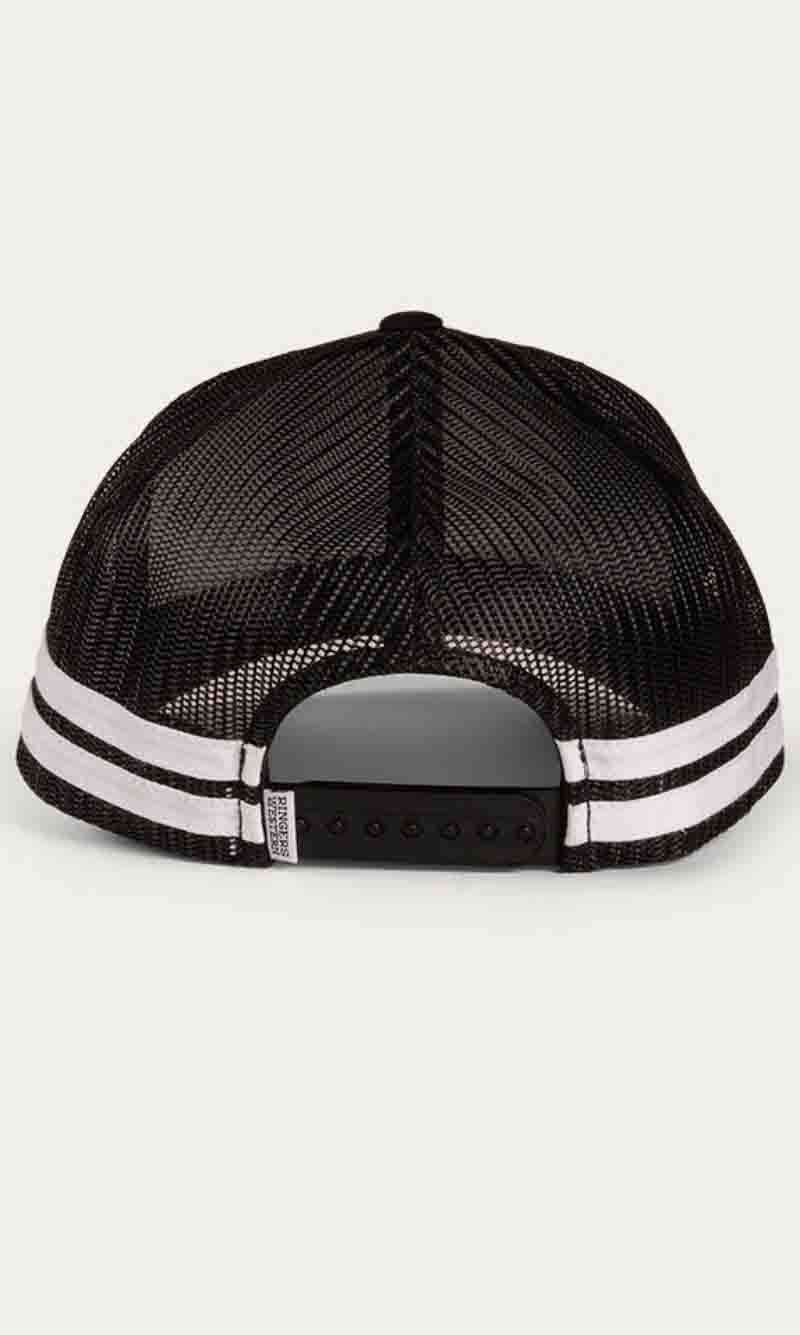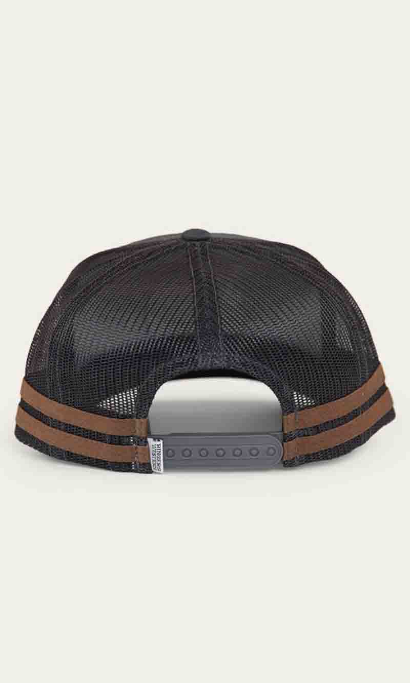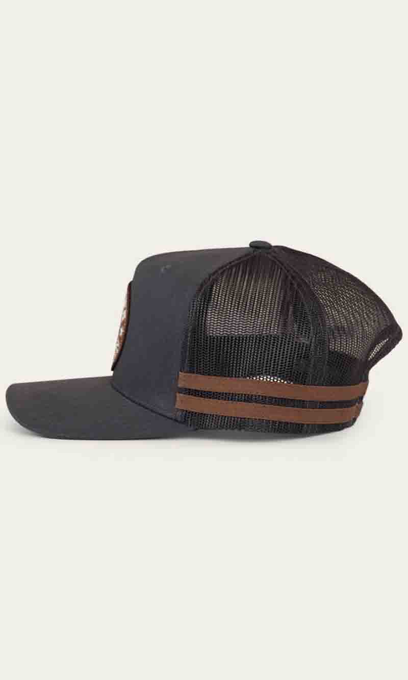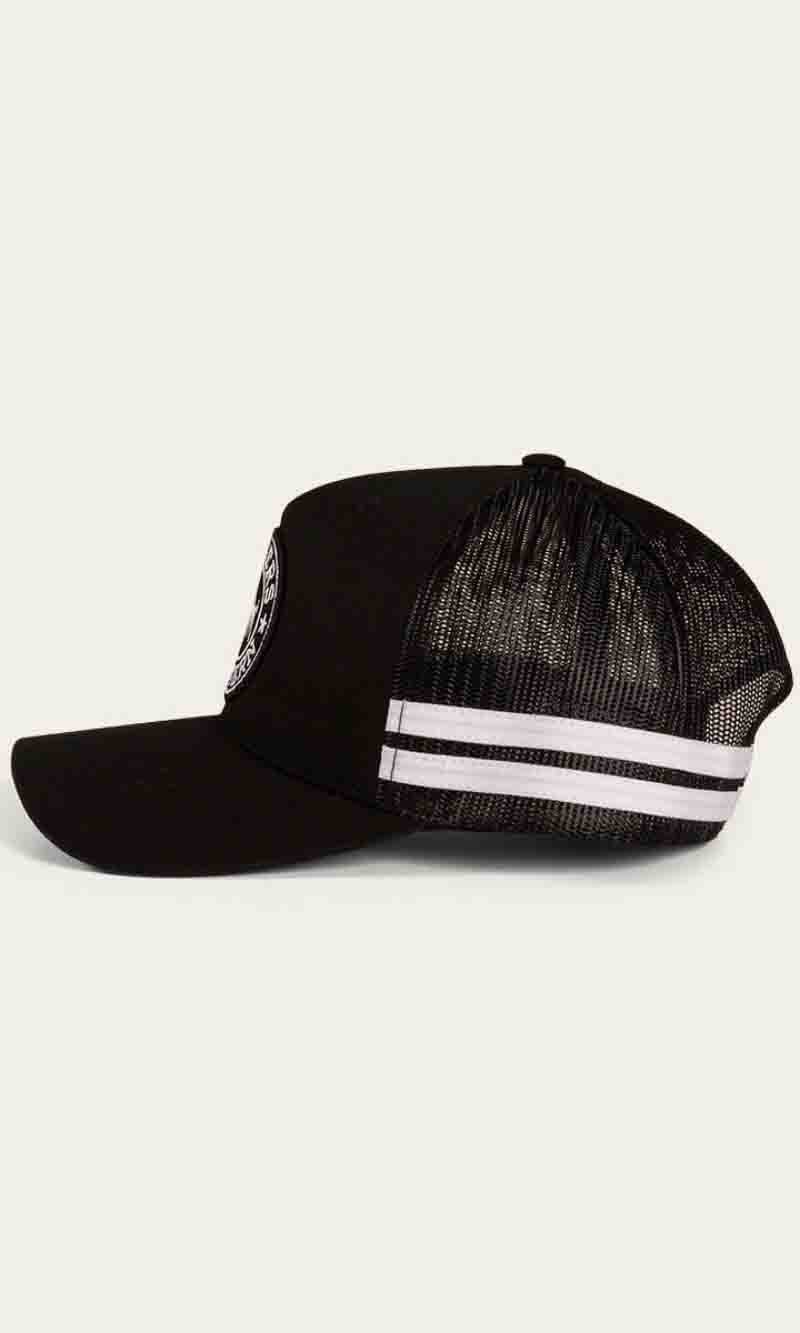 The McCoy Trucker cap features an embroidered logo patch. This hat has our classic trucker cap shape, black mesh back panels and a black snap closure.