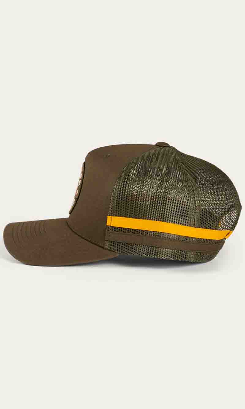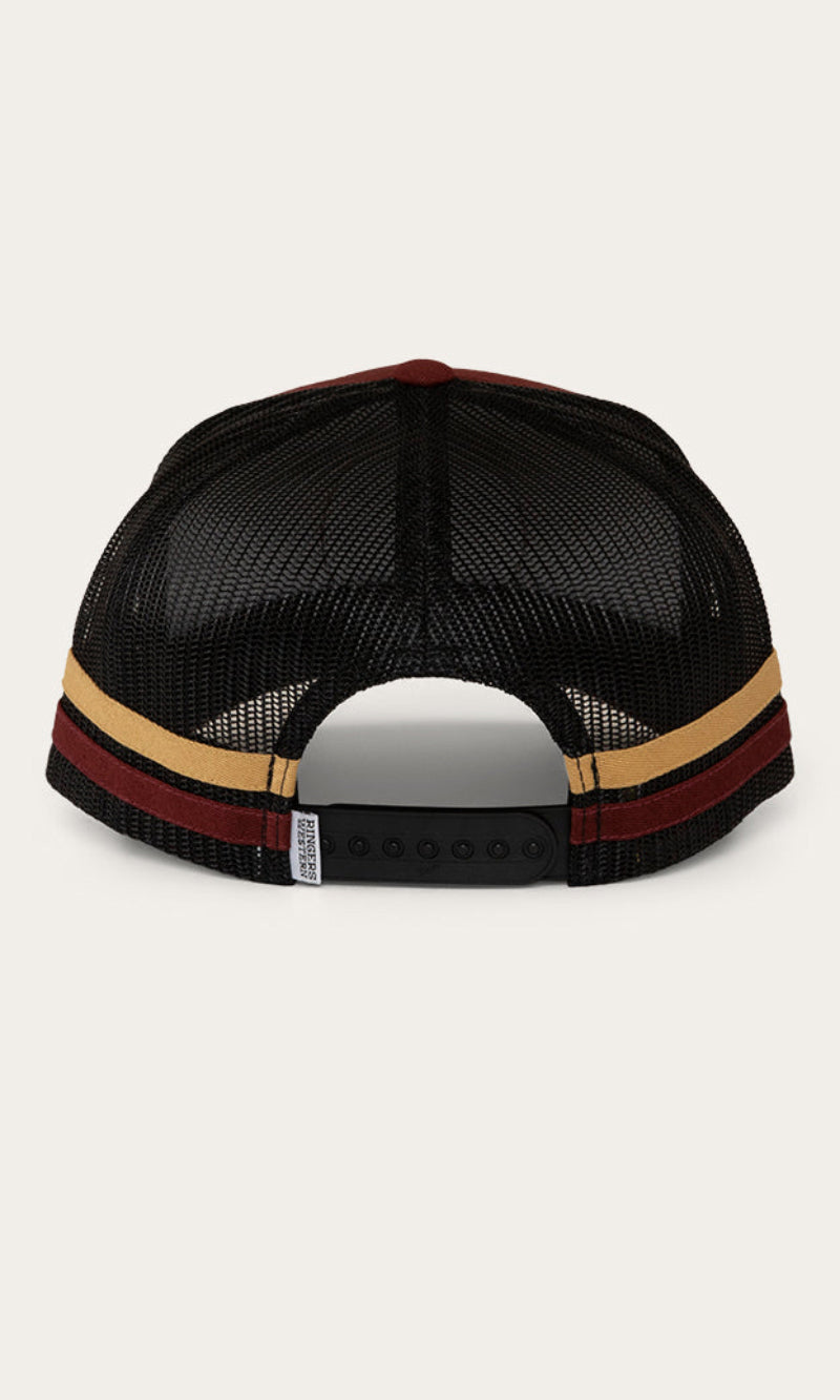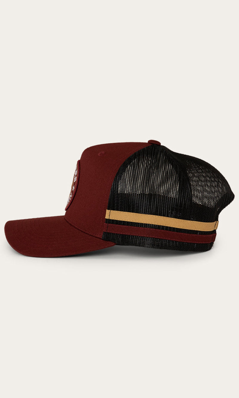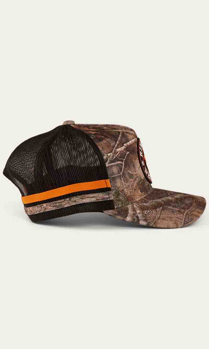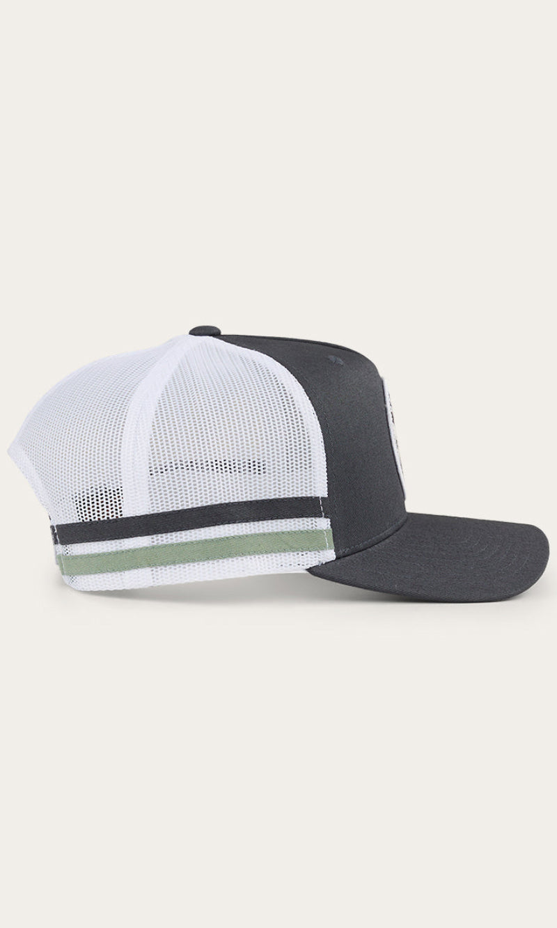 The McCoy Trucker cap features an embroidered logo patch. This hat has our classic trucker cap shape, black mesh back panels and a black snap closure.