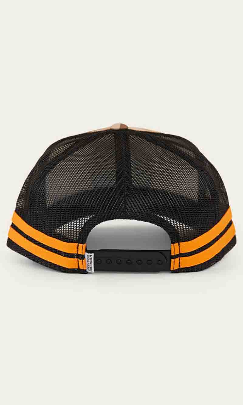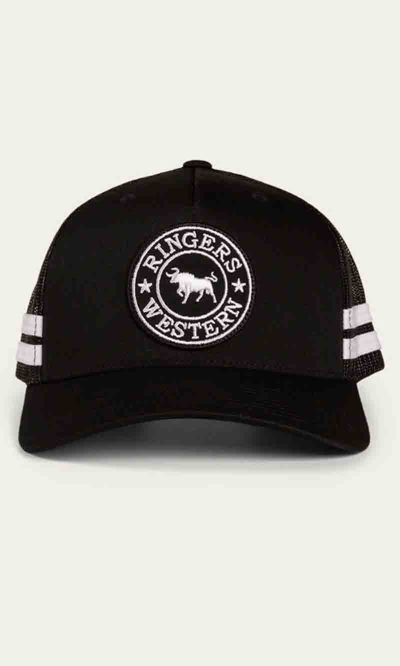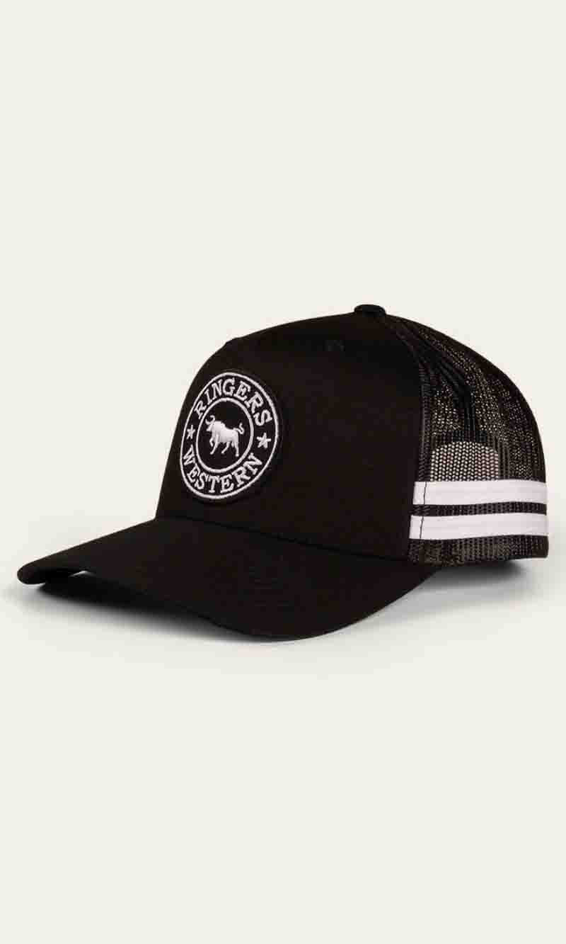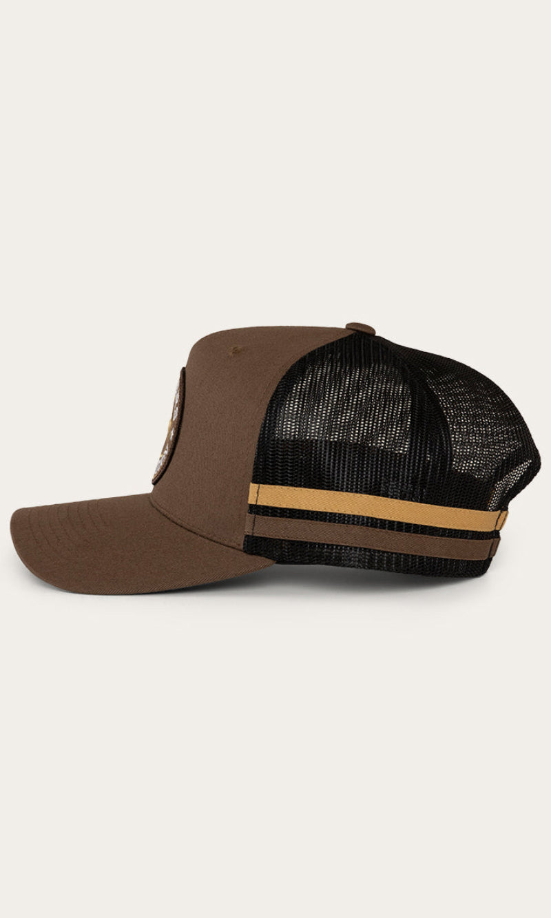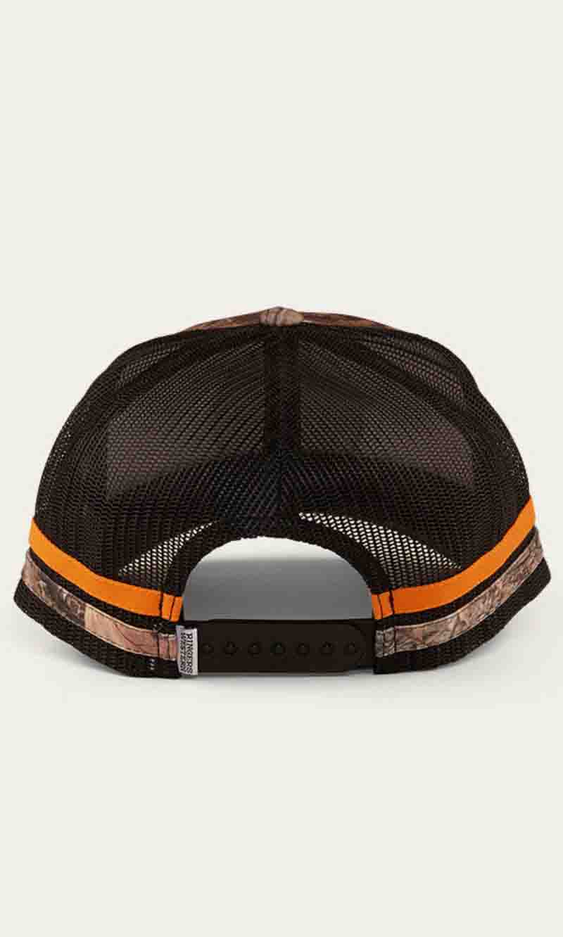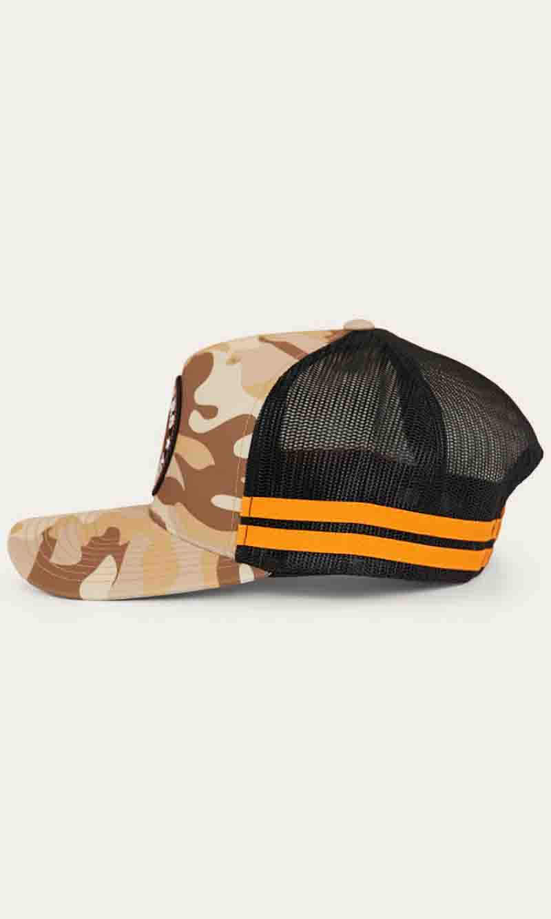 The McCoy Trucker cap features an embroidered logo patch. This hat has our classic trucker cap shape, black mesh back panels and a black snap closure.