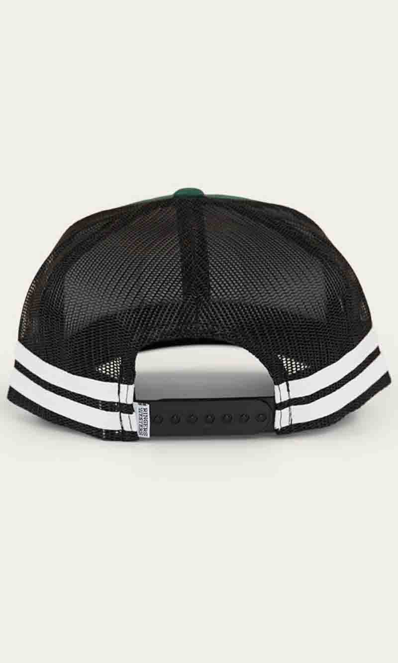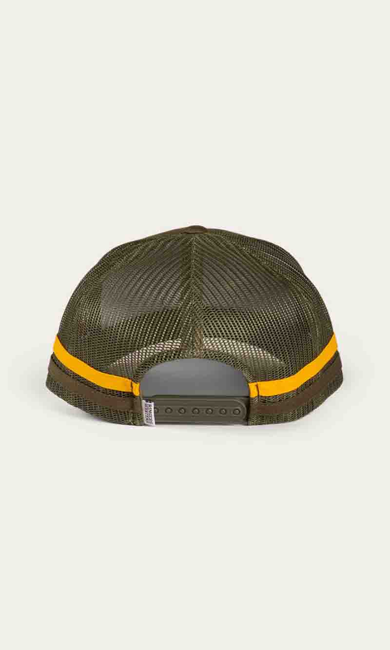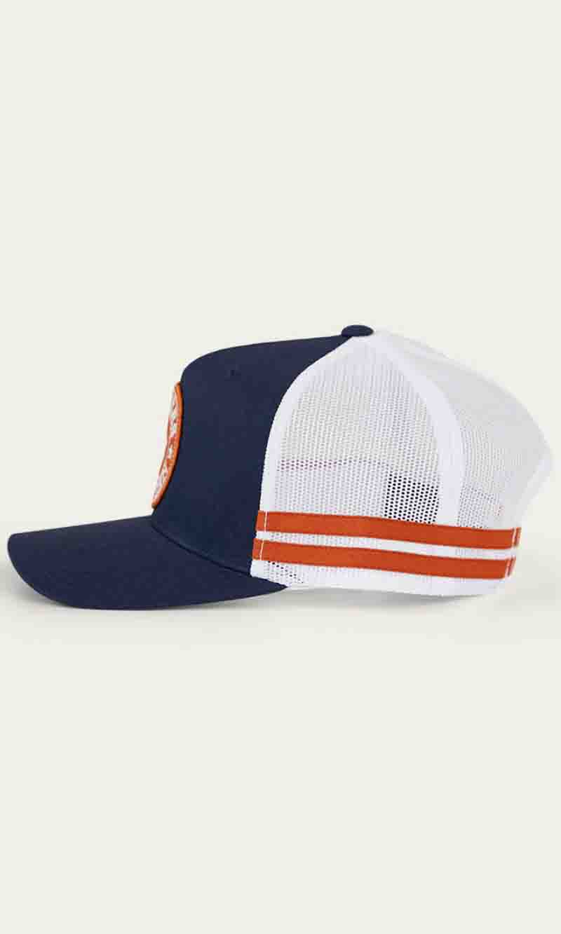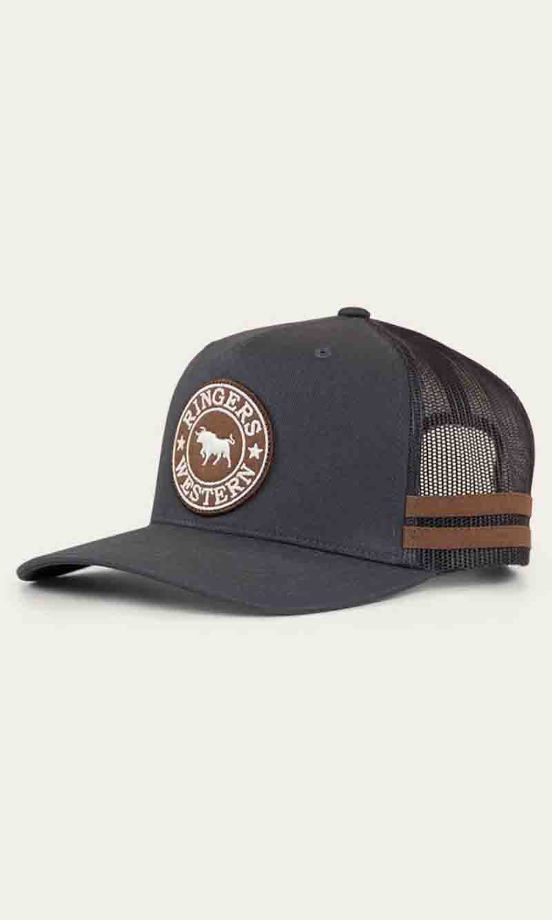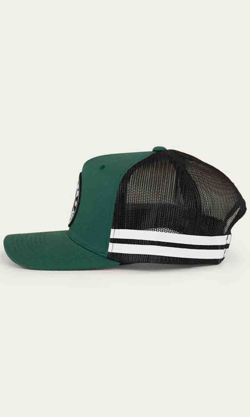 The McCoy Trucker cap features an embroidered logo patch. This hat has our classic trucker cap shape, black mesh back panels and a black snap closure.