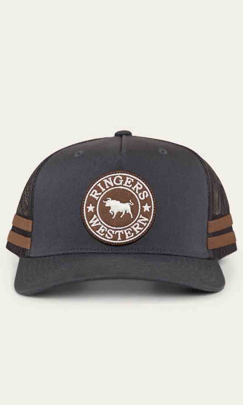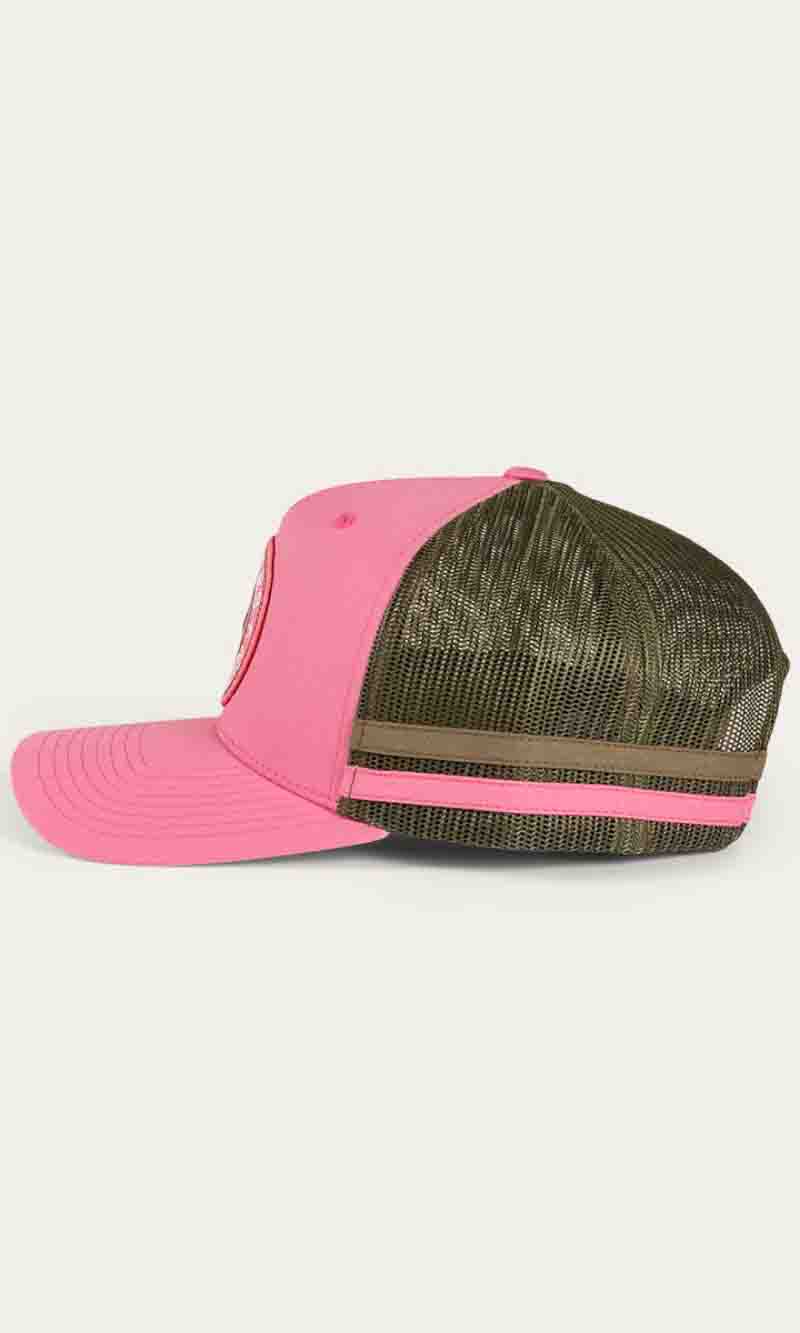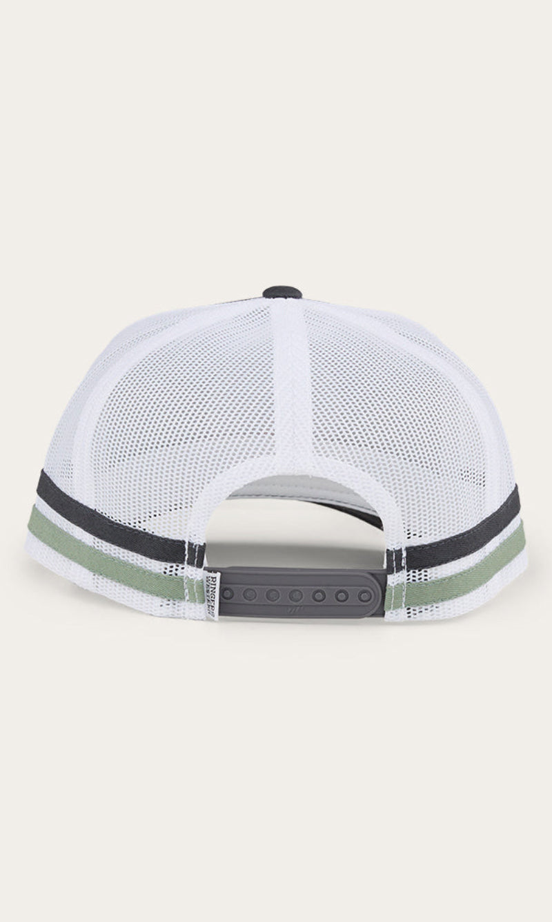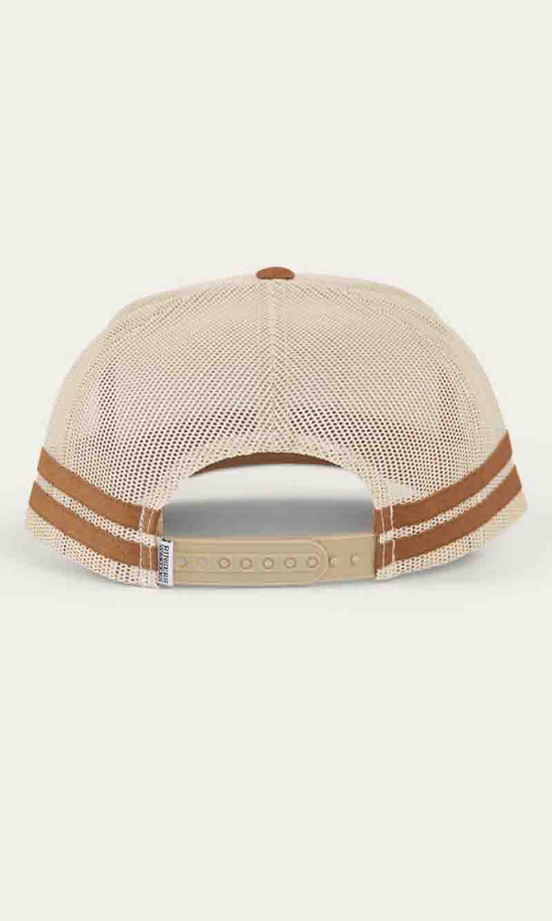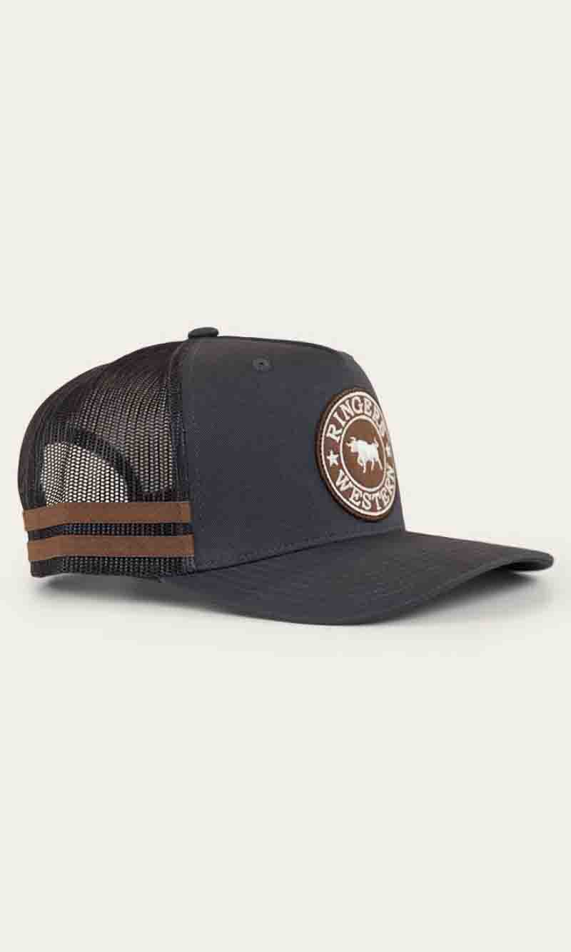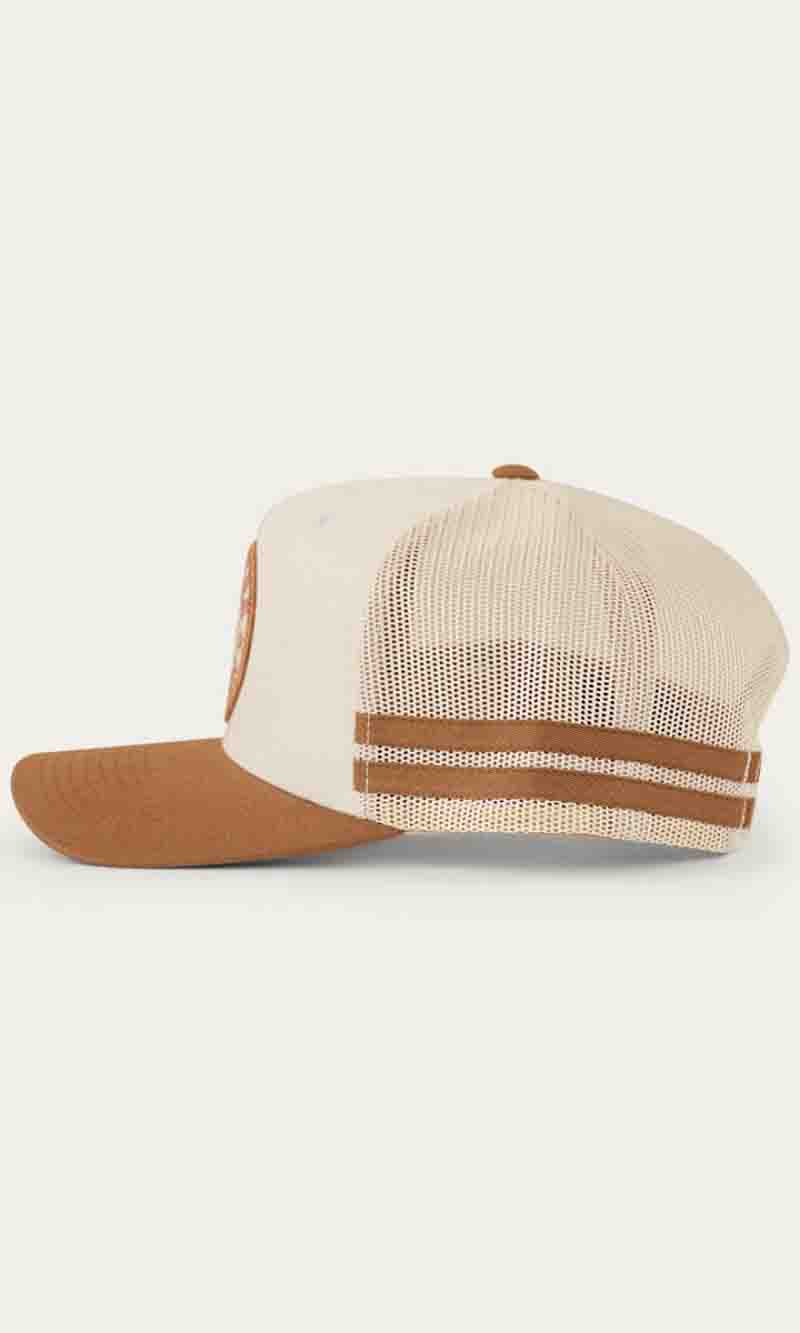 The McCoy Trucker cap features an embroidered logo patch. This hat has our classic trucker cap shape, black mesh back panels and a black snap closure.