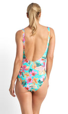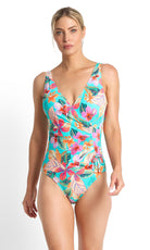 Powernet fabric has been incorporated in the front of the suit to smooth and flatten the tummy and shape curves.