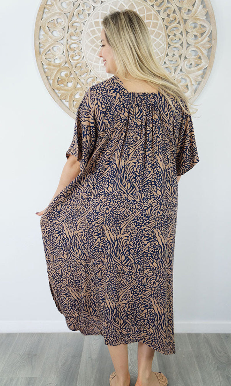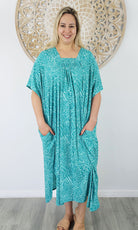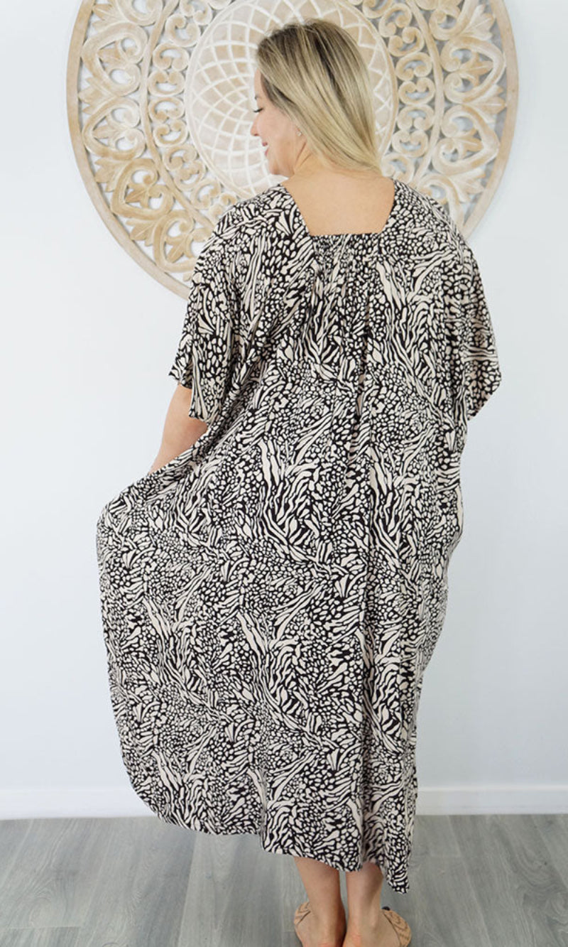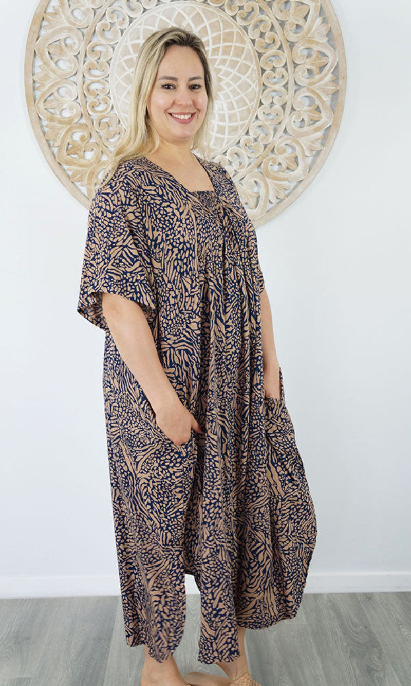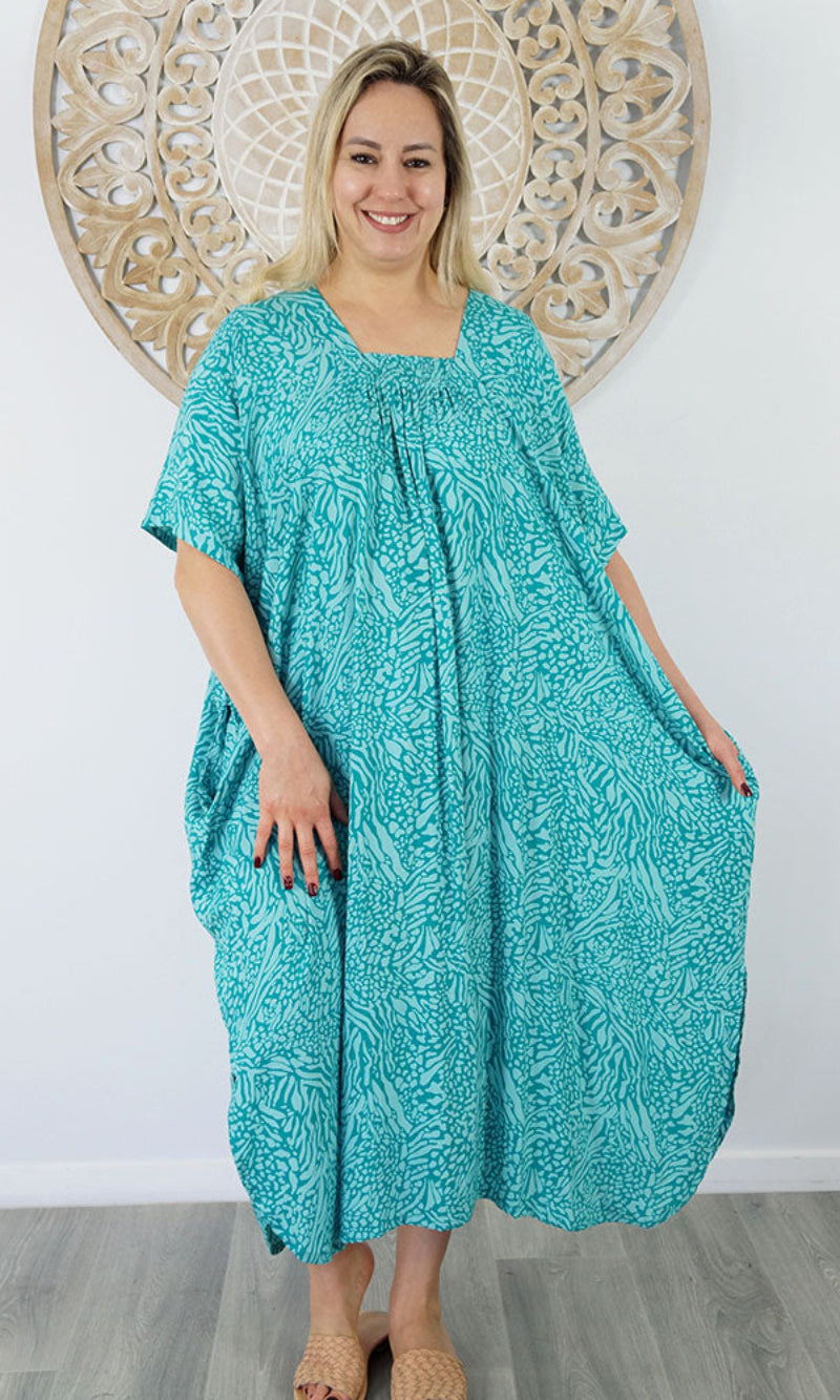 Introducing the Bermuda Kaftan in our "Kerala" print. This is a long, plus size kaftan featuring front shirring, side pockets and splits.