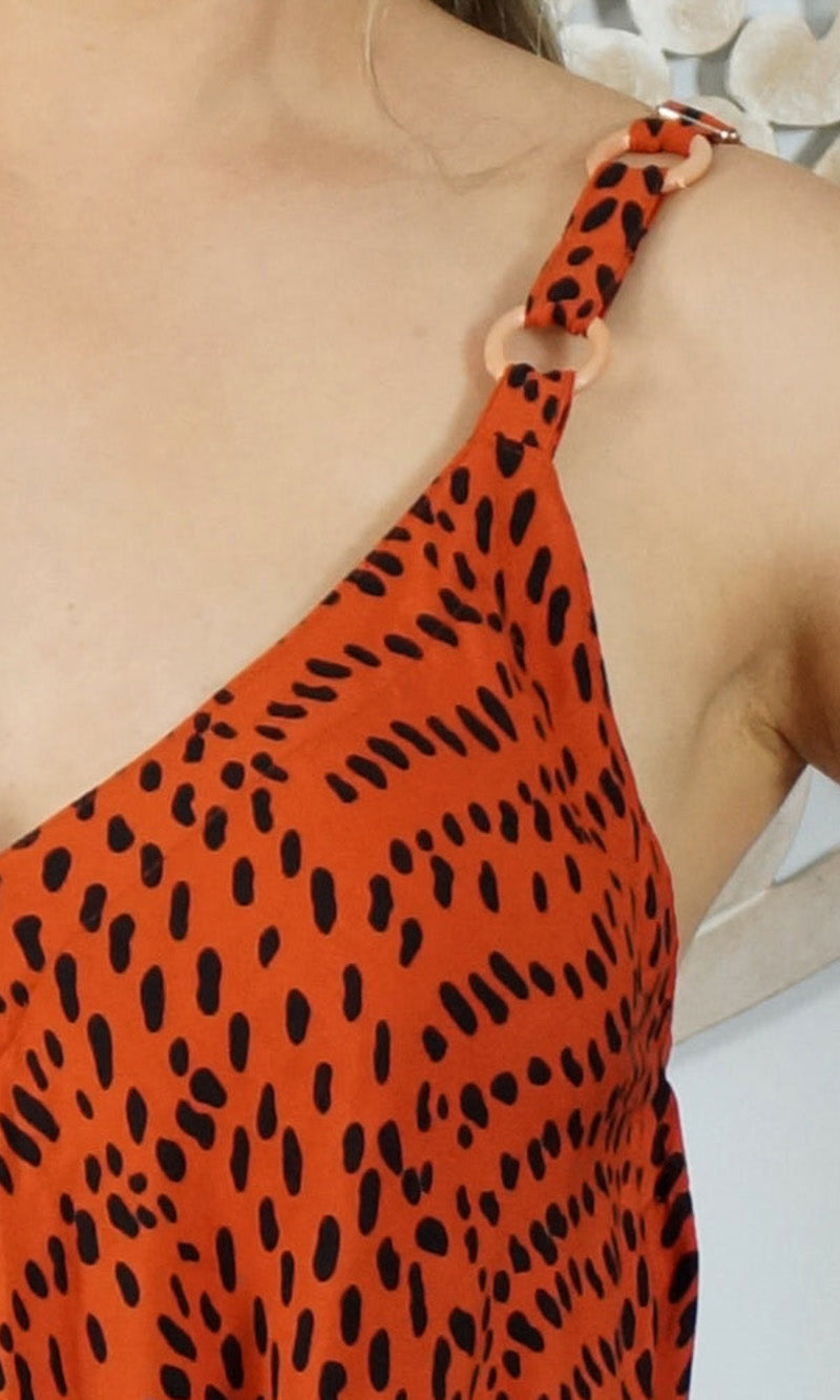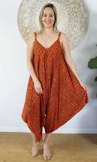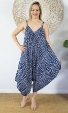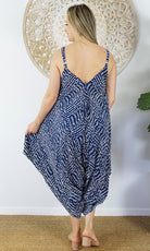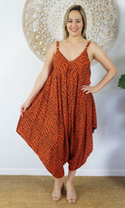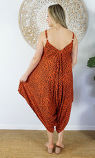 A great piece to add to your summer collection. This clown jumpsuit features adjustable straps V-neck front and back and comfort for those hot summer days.