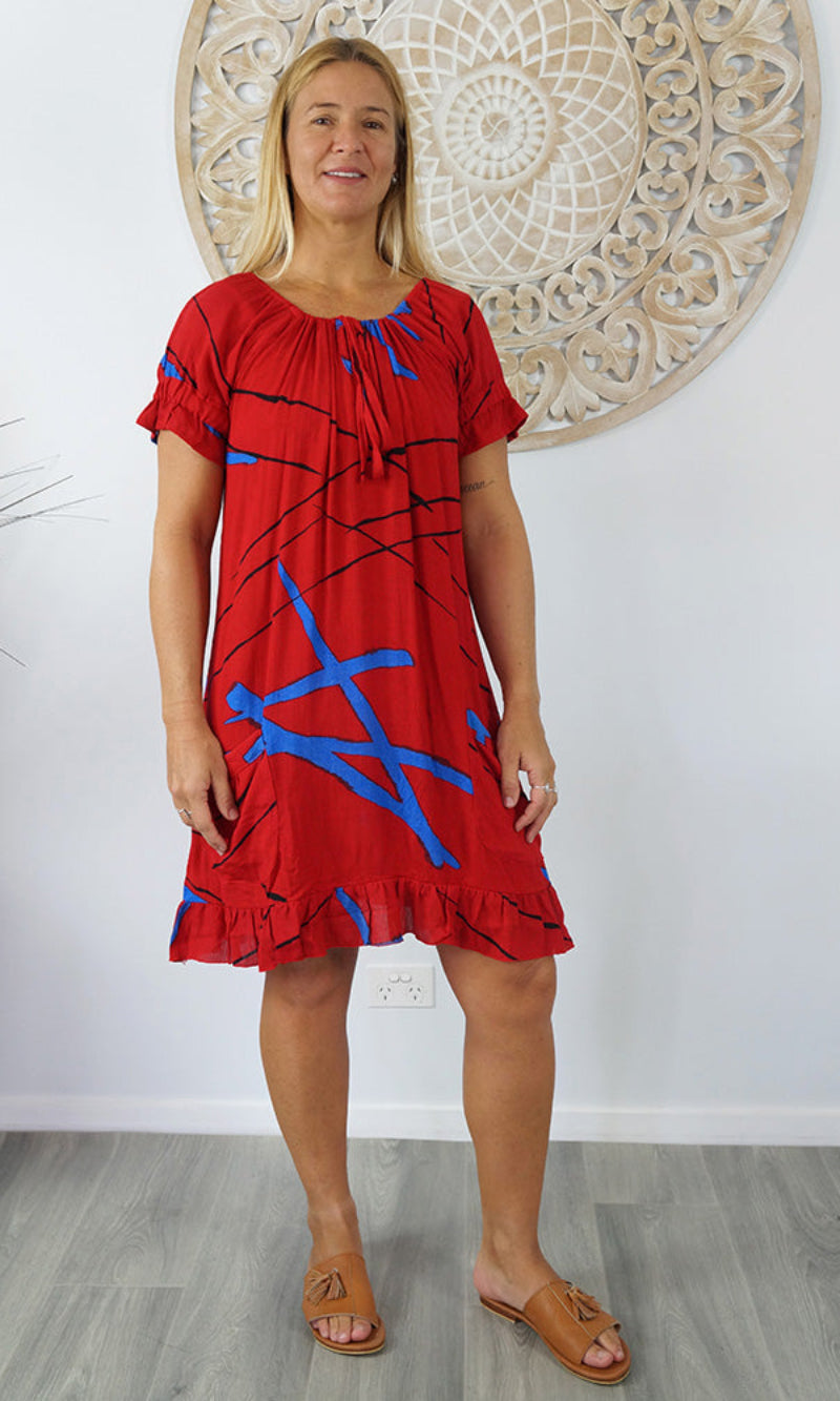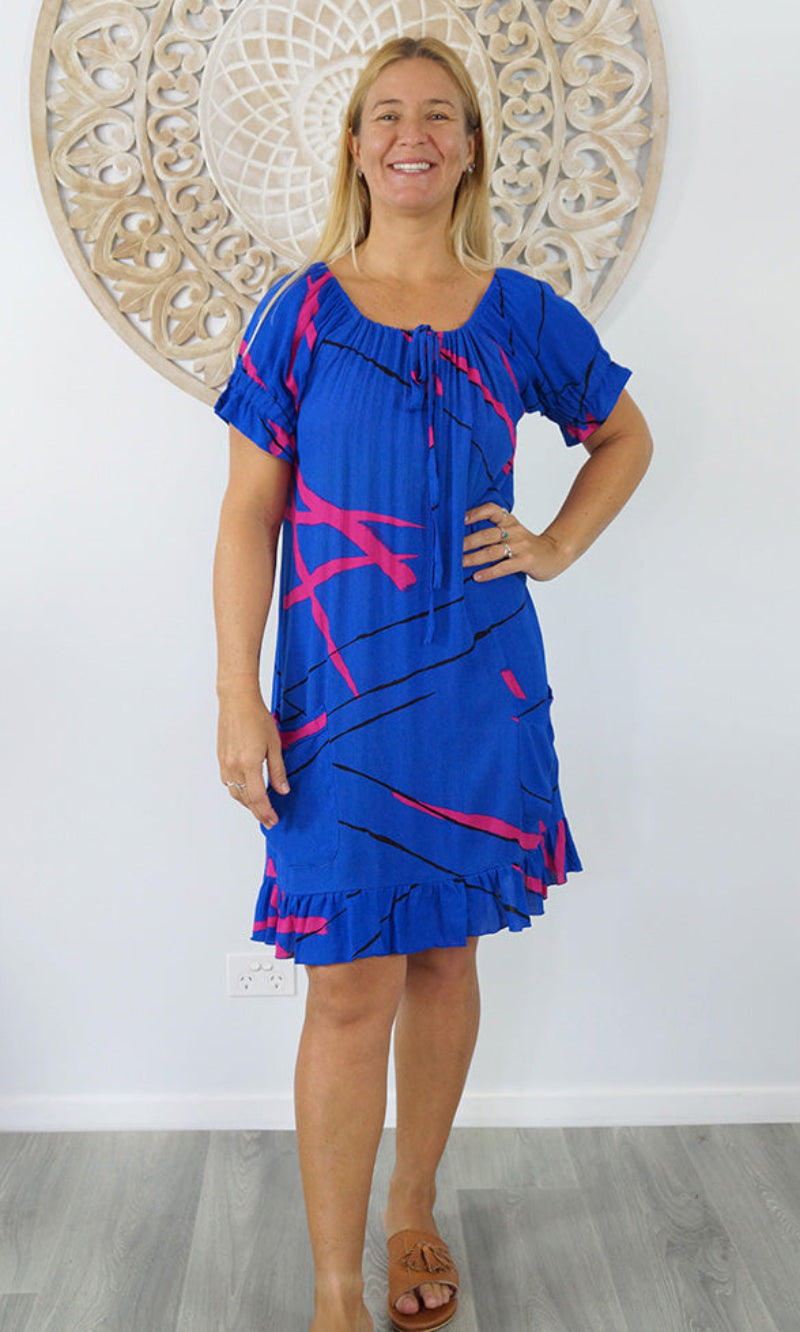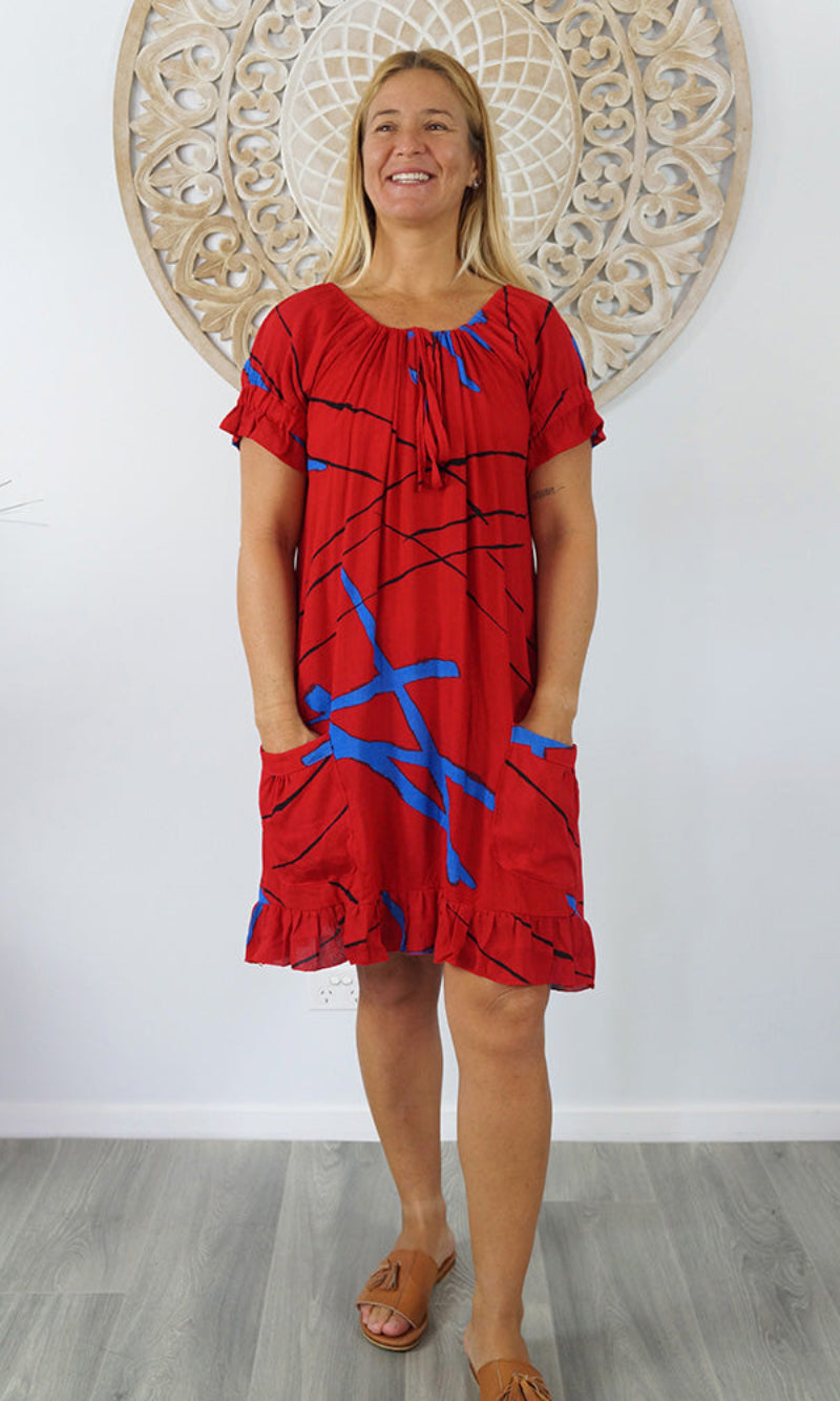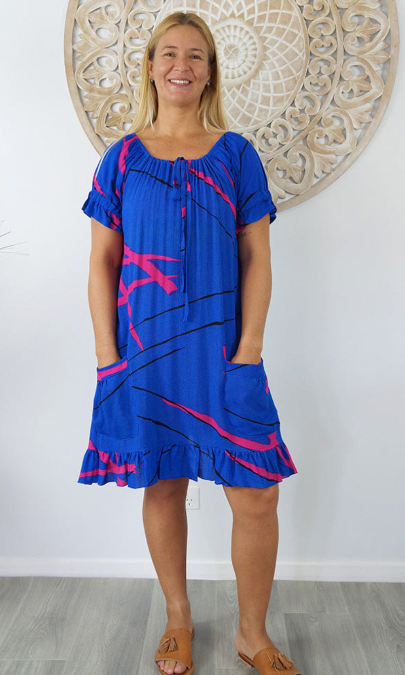 Made from crinkle rayon, the cuba dress features elastic around the back neck line with a drawstring tie at the front, frill detail on sleeves and hem line with pockets on each side.