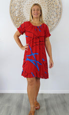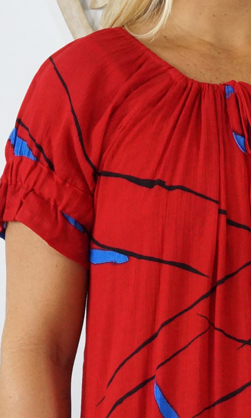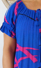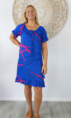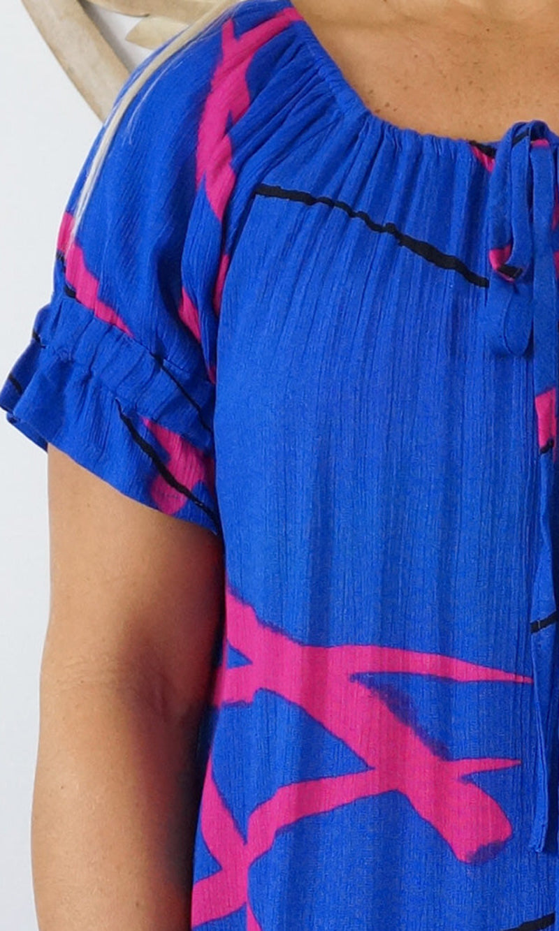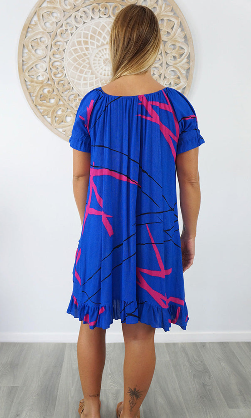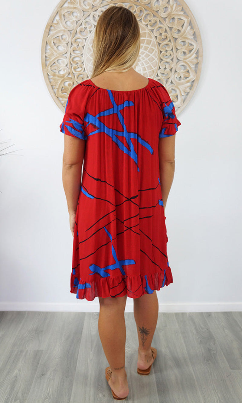 Made from crinkle rayon, the cuba dress features elastic around the back neck line with a drawstring tie at the front, frill detail on sleeves and hem line with pockets on each side.