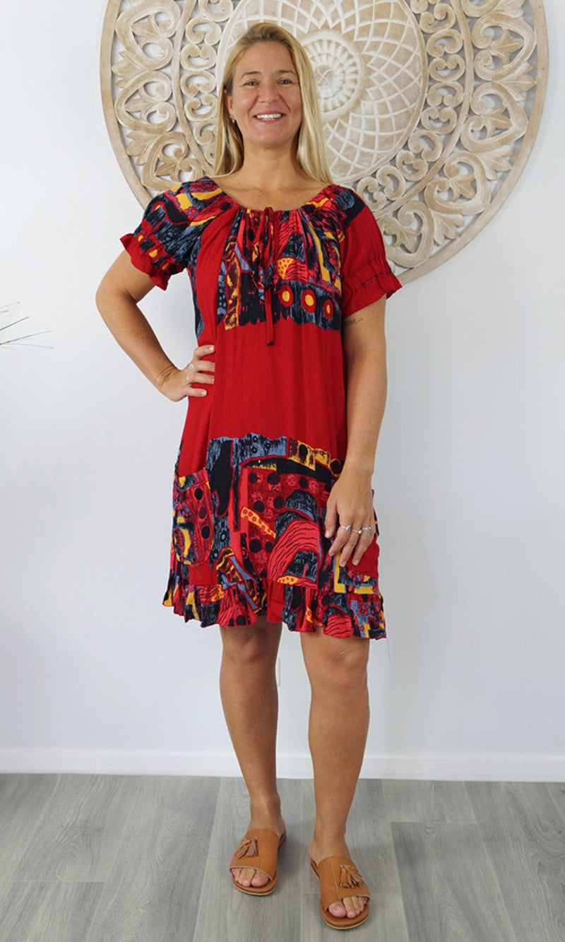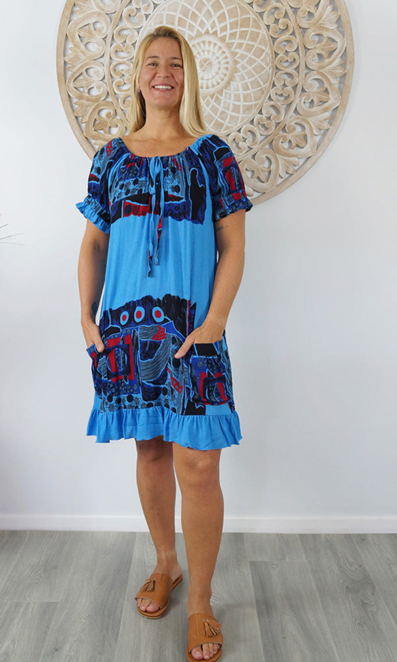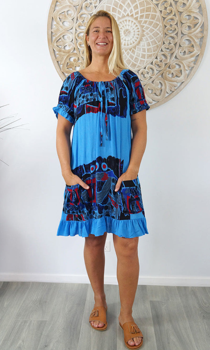Made from crinkle rayon, the cuba dress features elastic around the back neck line with a drawstring tie at the front, frill detail on sleeves and hem line with pockets on each side.