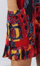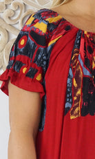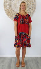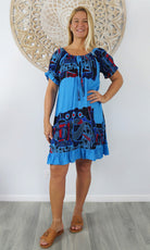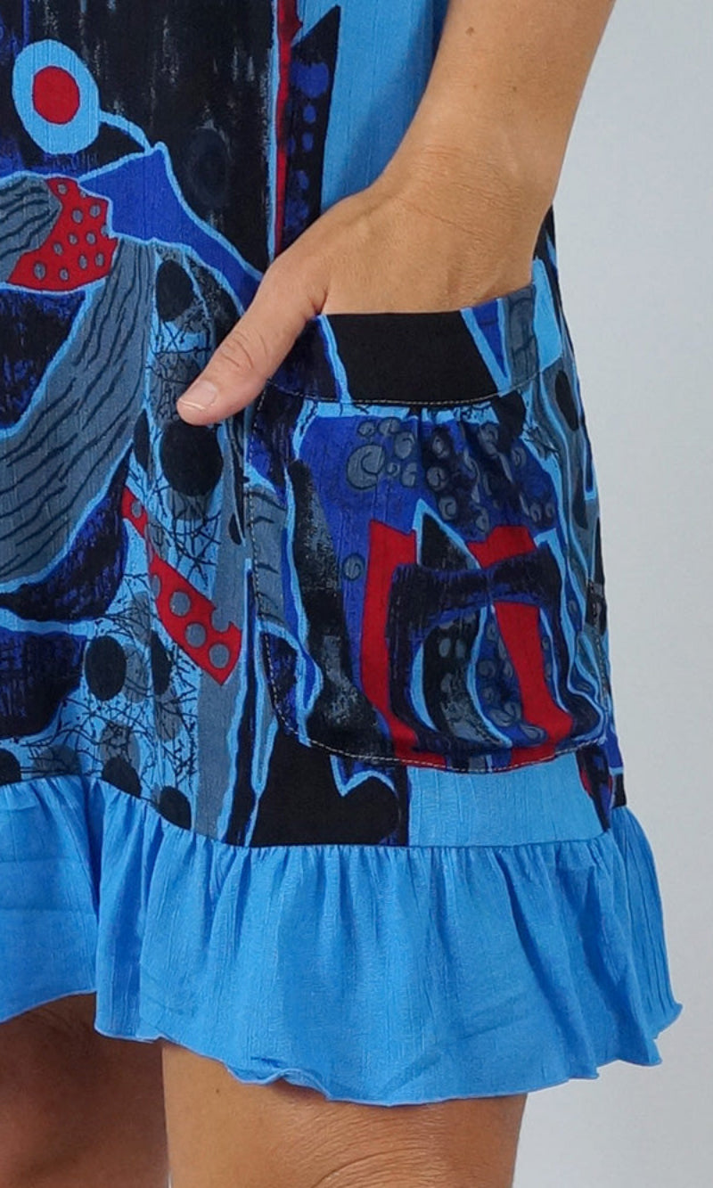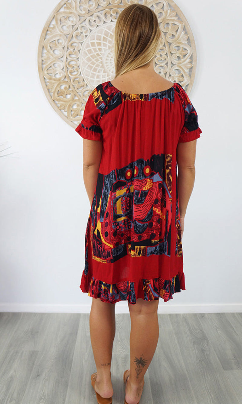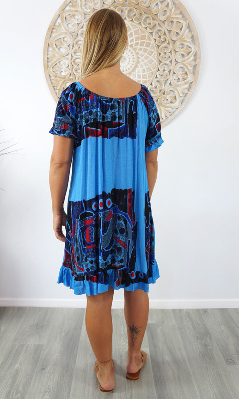 Made from crinkle rayon, the cuba dress features elastic around the back neck line with a drawstring tie at the front, frill detail on sleeves and hem line with pockets on each side.