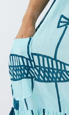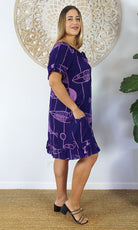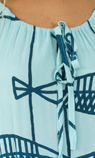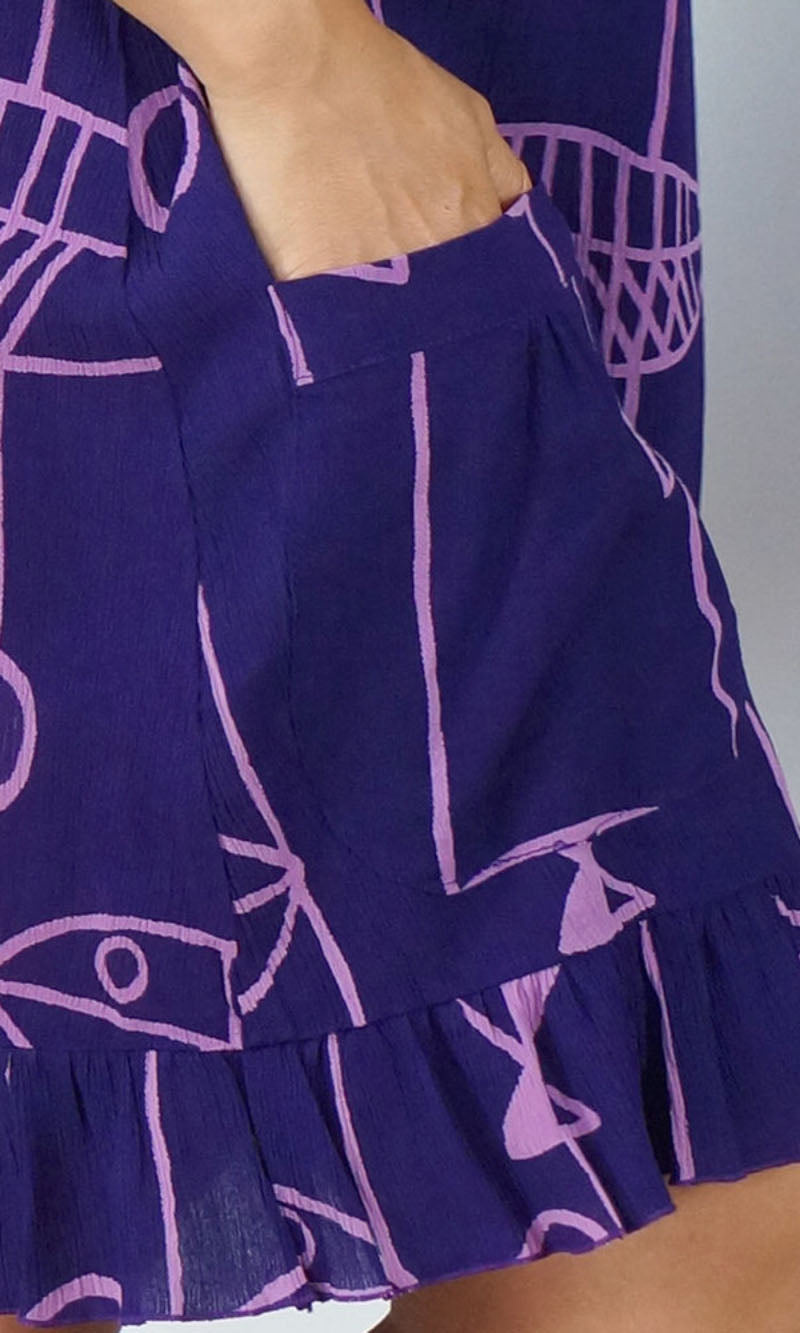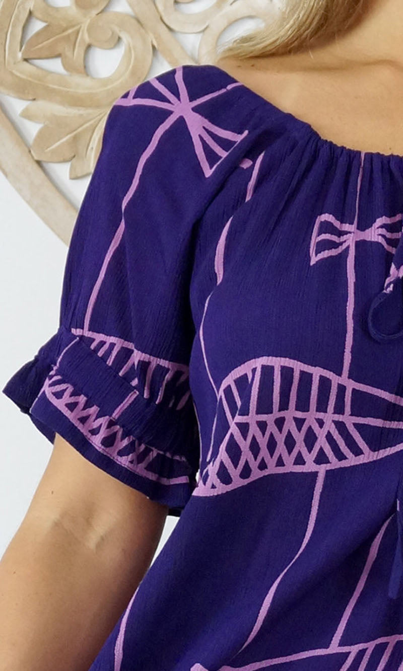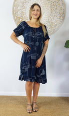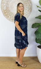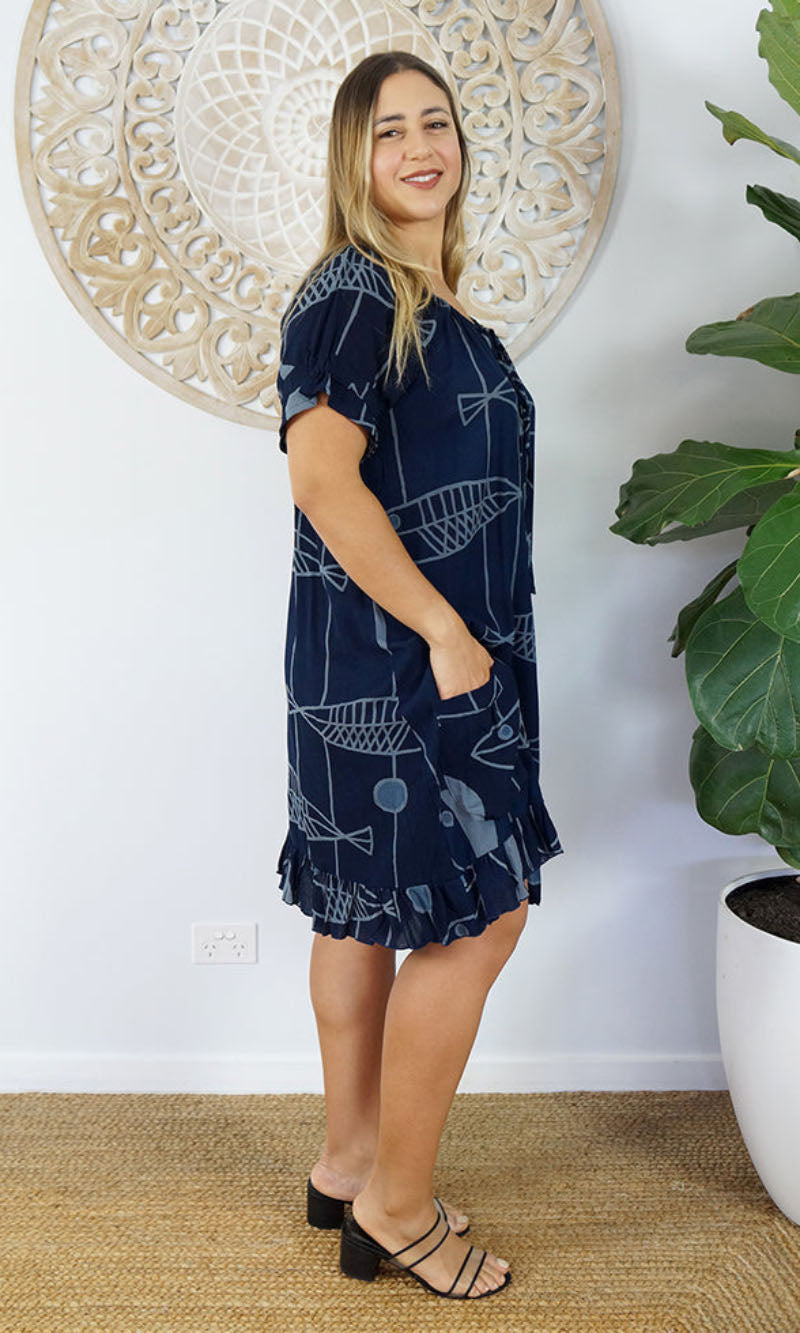 Made from crinkle rayon, the cuba dress features elastic around the back neck line with a drawstring tie at the front, frill detail on sleeves and hem line with pockets on each side.